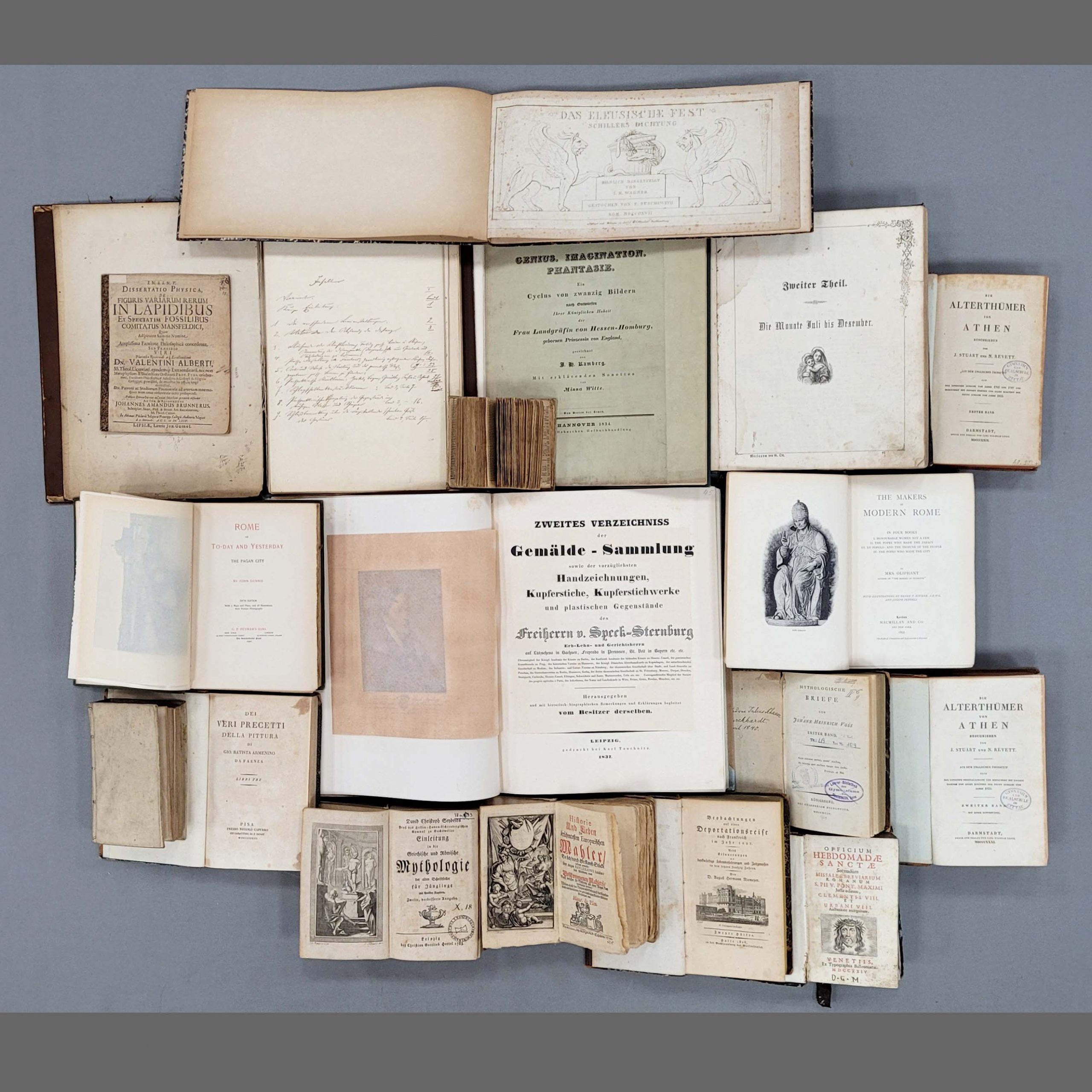 Großes Konvolut Bücher 17.-19. JahrhundertReiseliteratur, Kunstgeschichte, Zeichenkunst, Archäologie etc…, insgesamt mehr als 20 BücherWir weisen darauf hin, dass die Bücher nicht kollationiert sind.