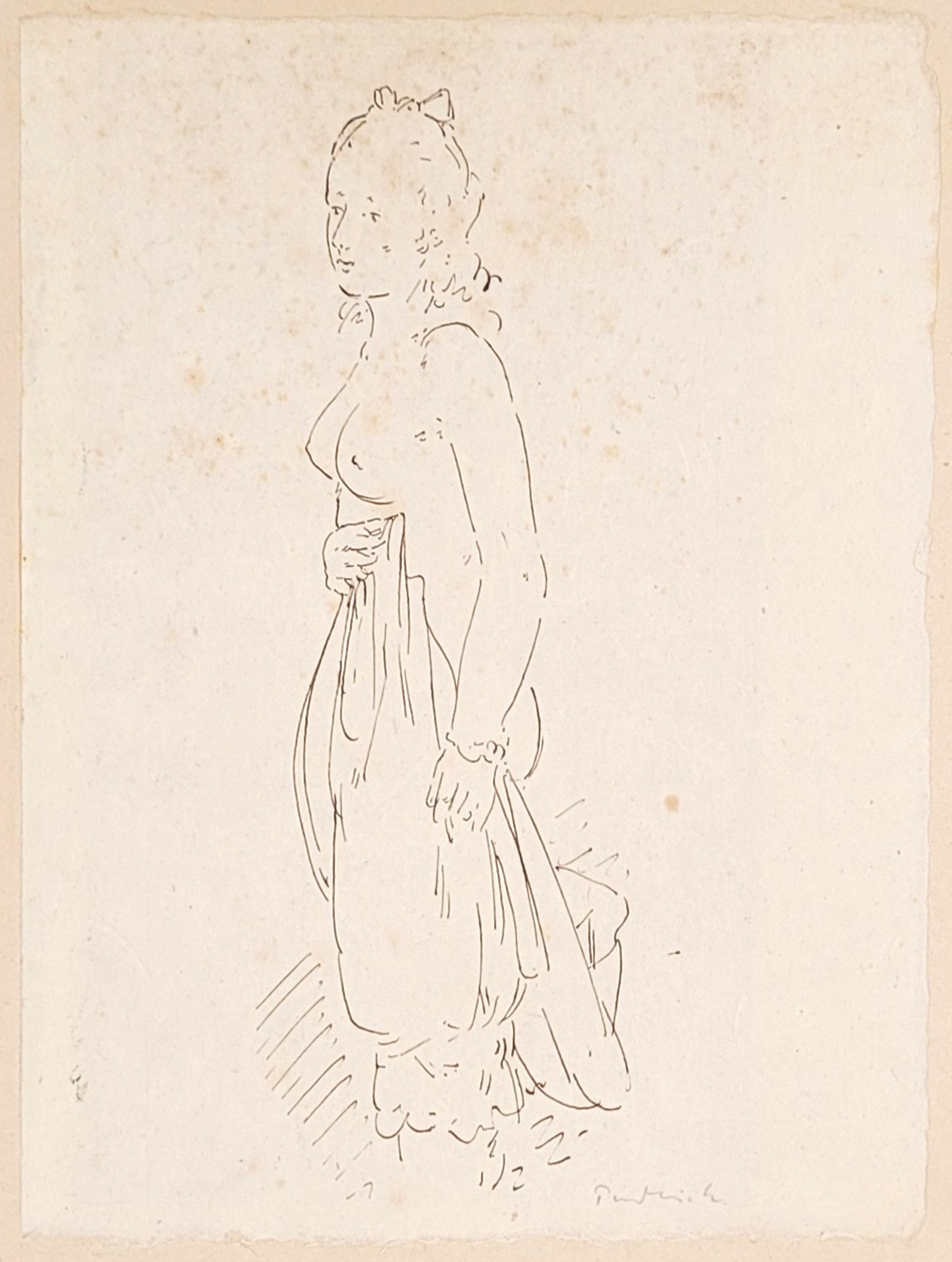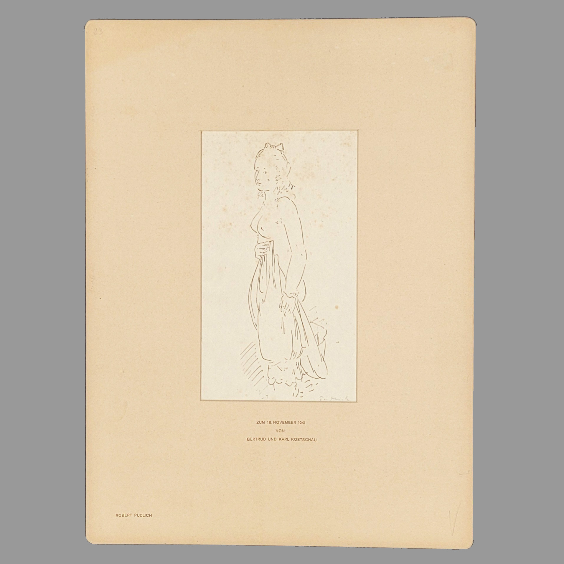 PUDLICH, Robert (1905-1962): Junges Mädchen mit entblößter BrustFeder auf Papier, signiert unten links, 28,5 x 21 cm, Originalklapp-Passepartout mit Widmung von 1941