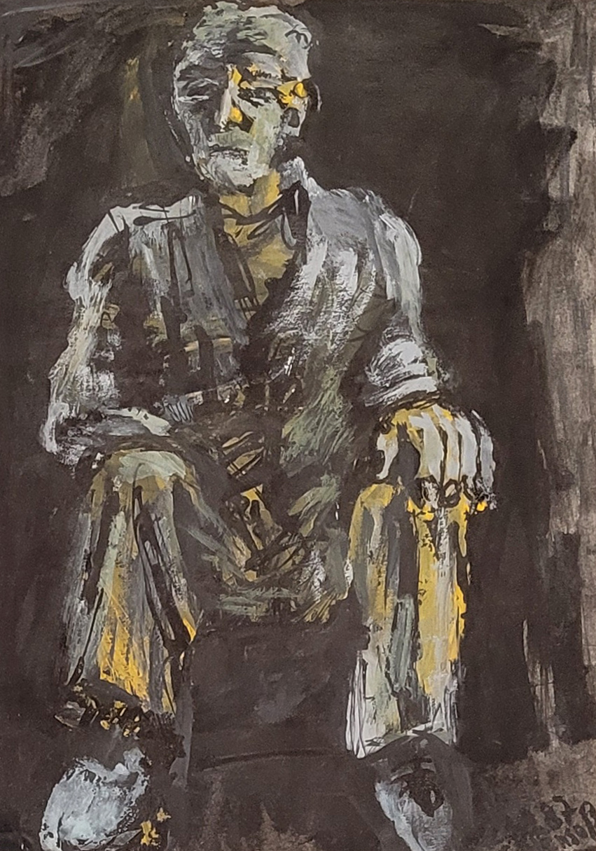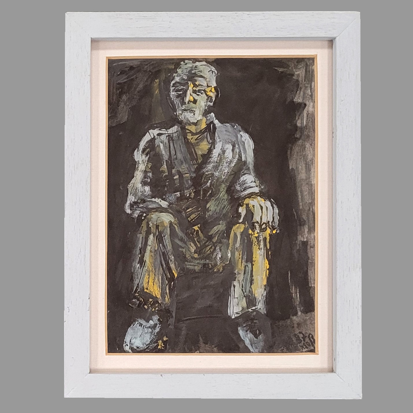 ODENSAß, Sabine (*1958): Sitzender MannÖl auf Papier, signiert und datiert „23.9.87“ unten rechts, 20 x 14 cm, gerahmt unter Glas**) Bei einem Zuschlag über 400€ werden 2% für VG Bild gemäß §26 UrHG erhoben