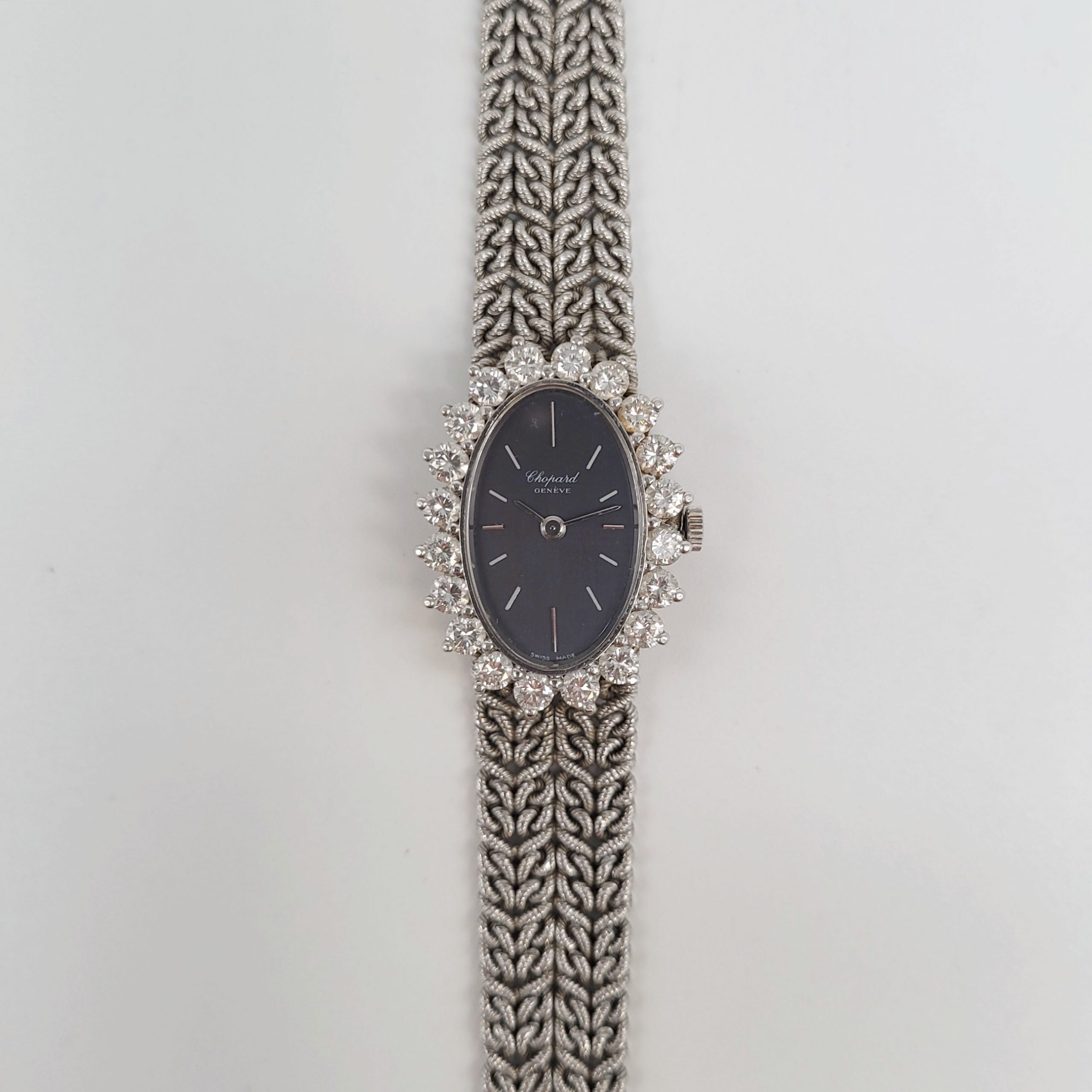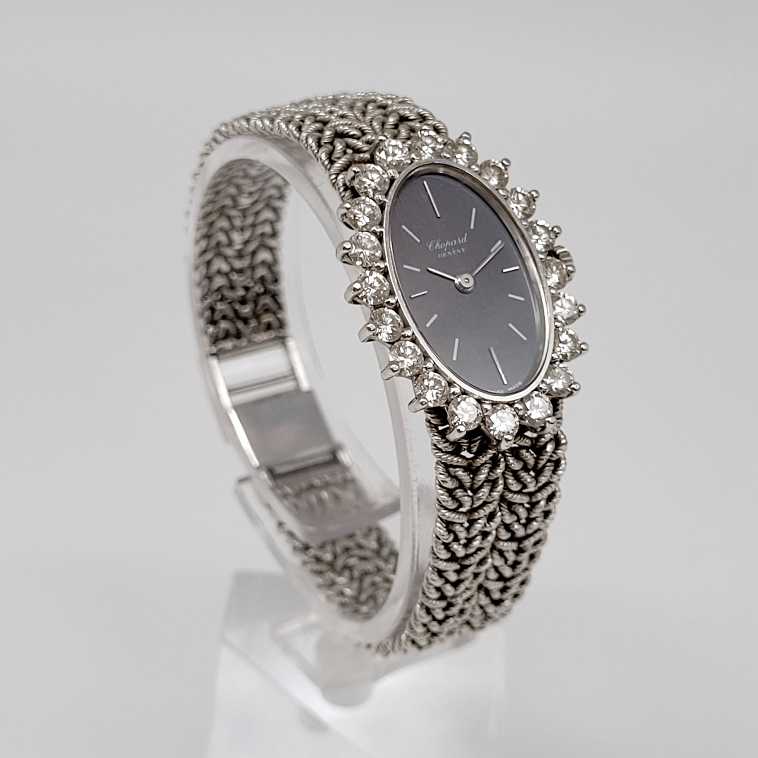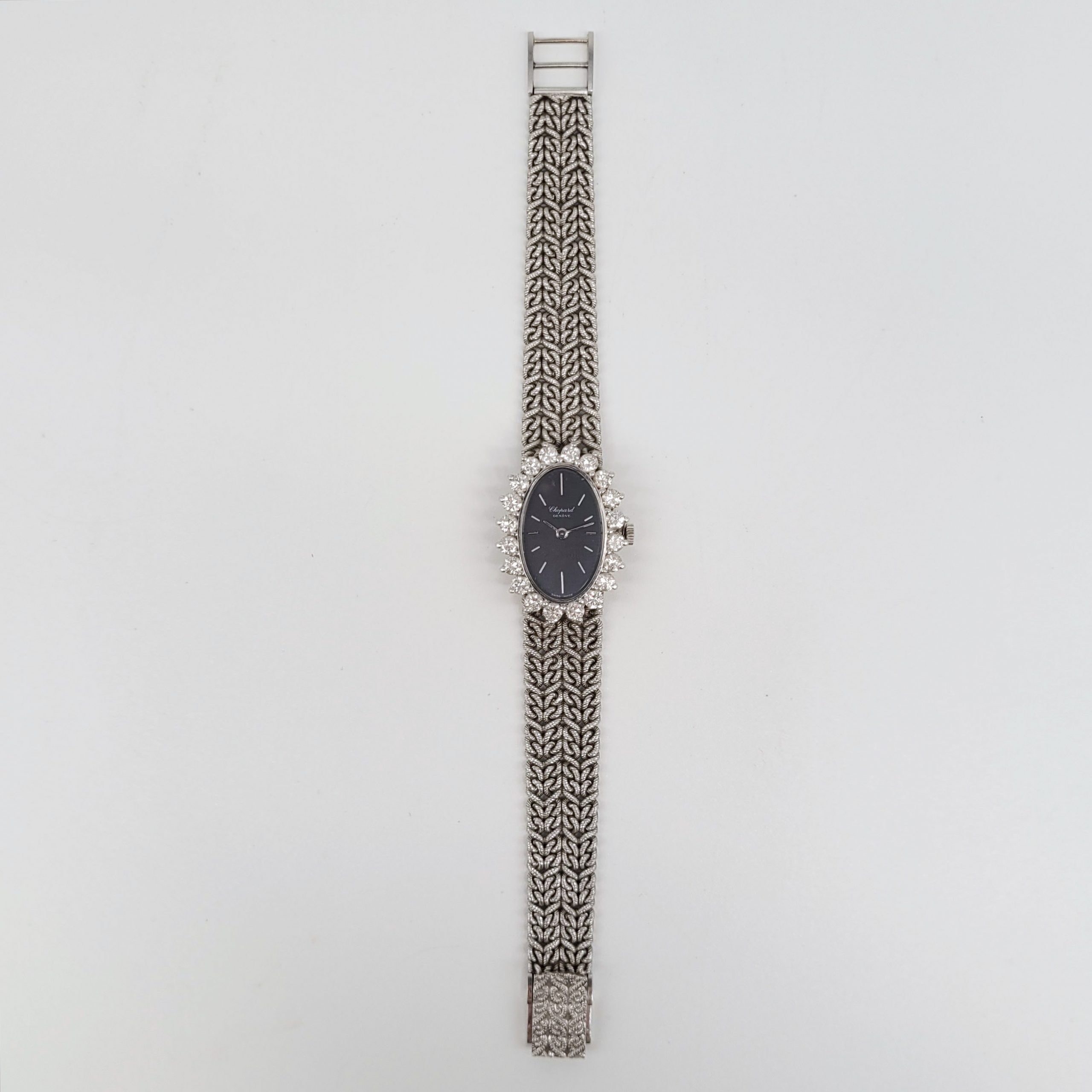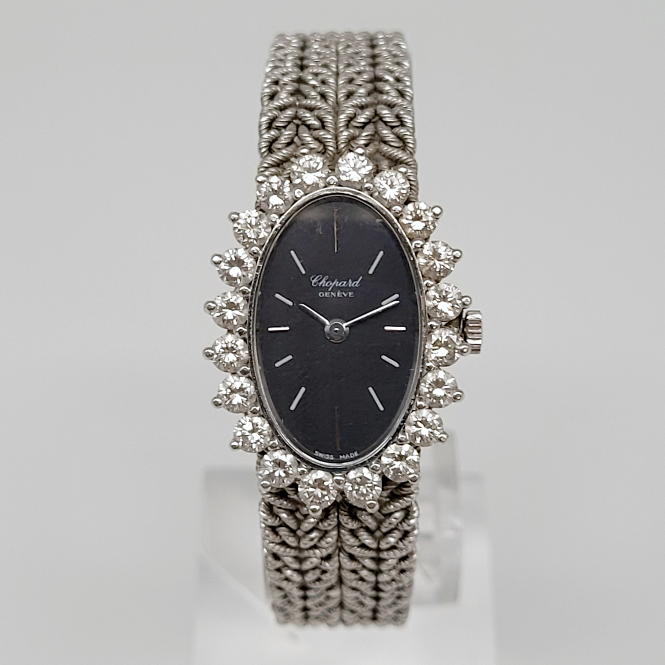 750er Weißgold, Gehäuse umgeben von 20 Brillanten (zusammen ca. 1,80 ct), schwarzes Zifferblatt mit Stundenbalken, mechanisches Uhrwerk mit Handaufzug über Krone, Länge 16 cm, Gehäuse 2,8 x 2 cm, Gewicht ca. 38,5 cm (Uhrwerk läuft an)