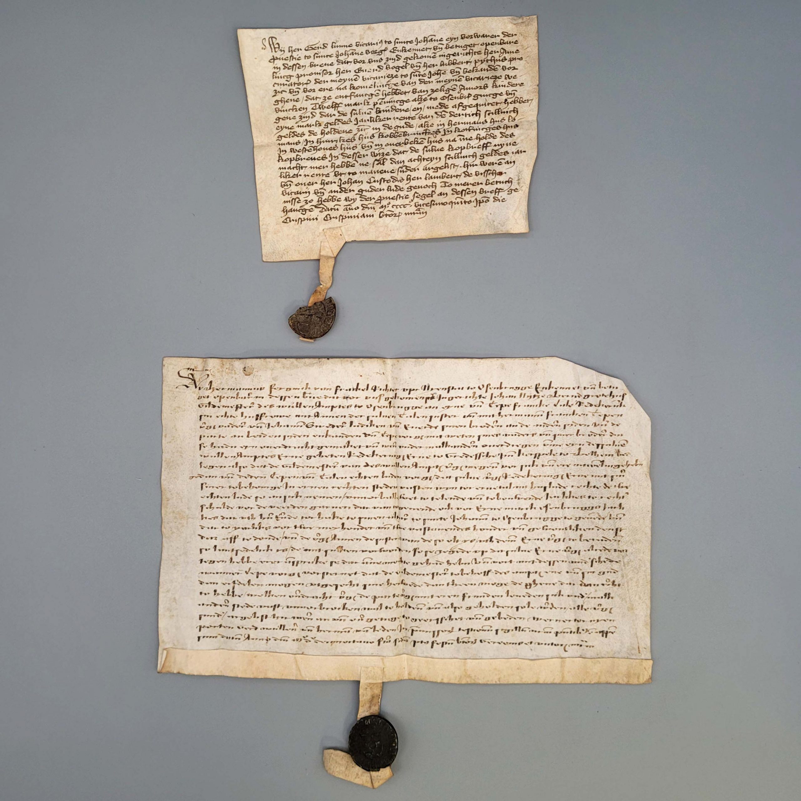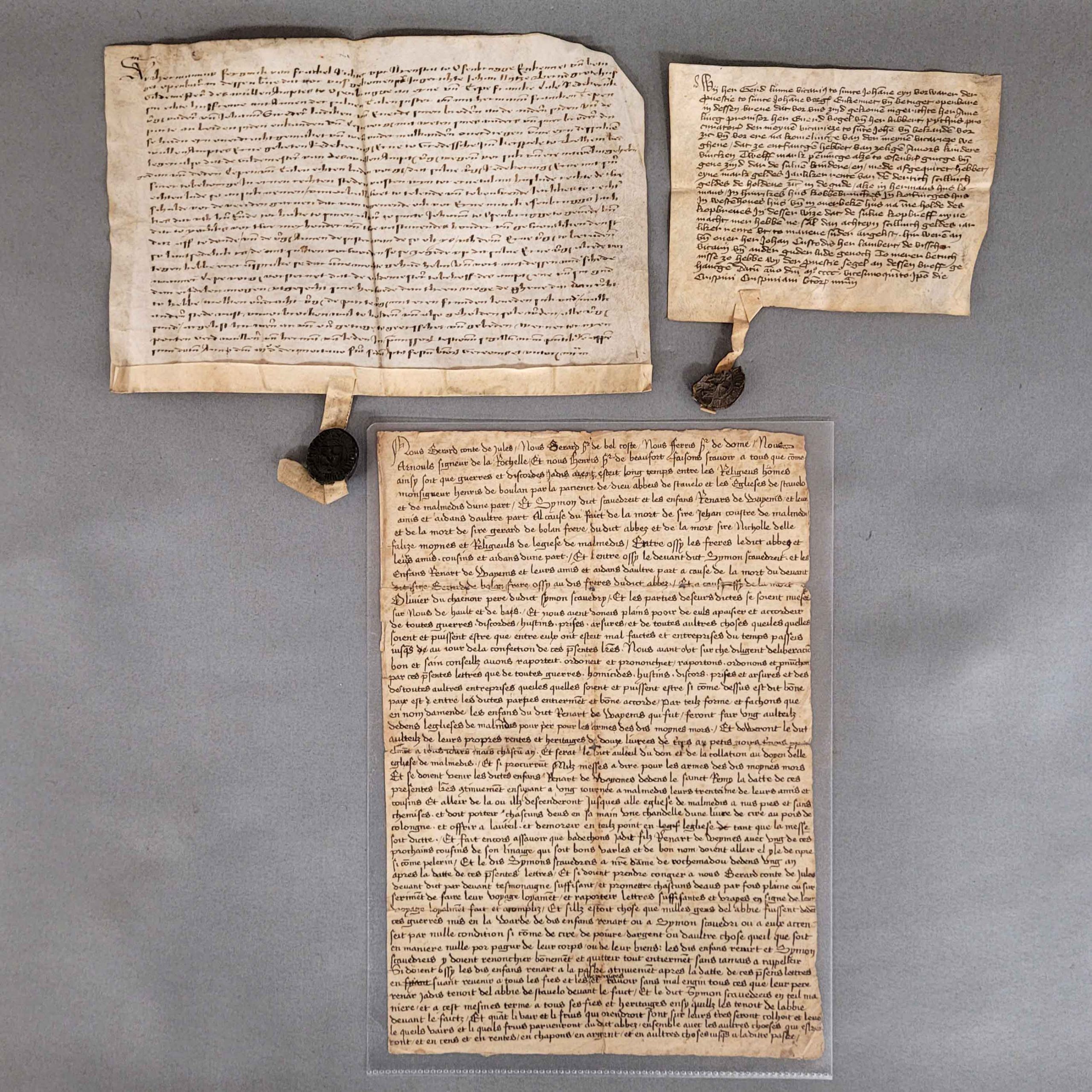 Drei UrkundenHandschriften in schwarzer Tinte auf Papier (1x) und Pergament (2x), mit angehängtem Siegel (2x), datiert 1313, 1425, 1518, bis zu 28 x 19,5 cm