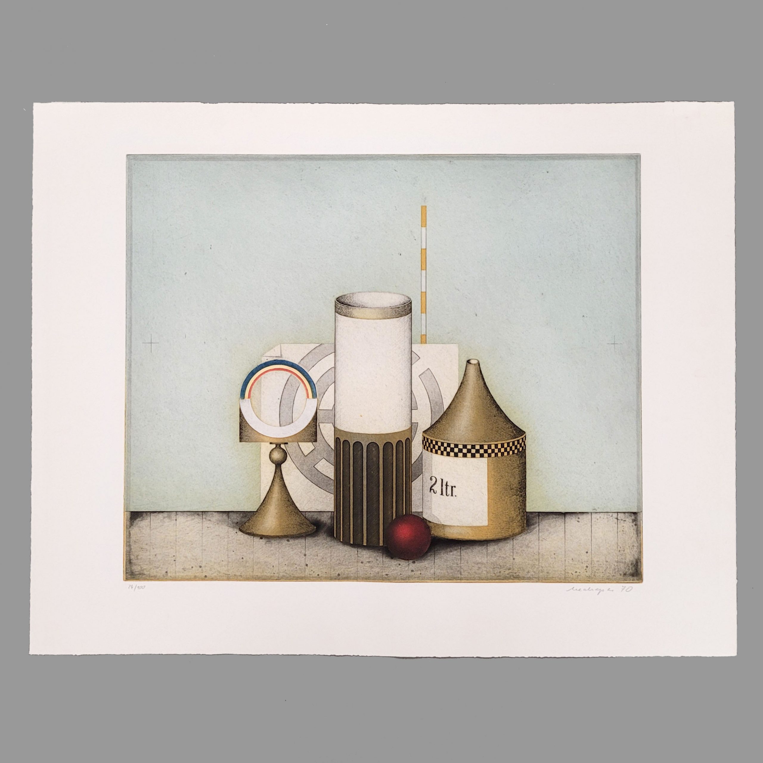 MECKSEPER, Friedrich (1936-2019): Blaues StillebenFarbradierung, 1970, signiert und datiert (19)70 unten rechts, nummeriert 24/100 unten links, 63 x 80 cm** ) Bei einem Zuschlag über 400 € werden 2 % für VG Bild gemäß §26 UrHG erhoben