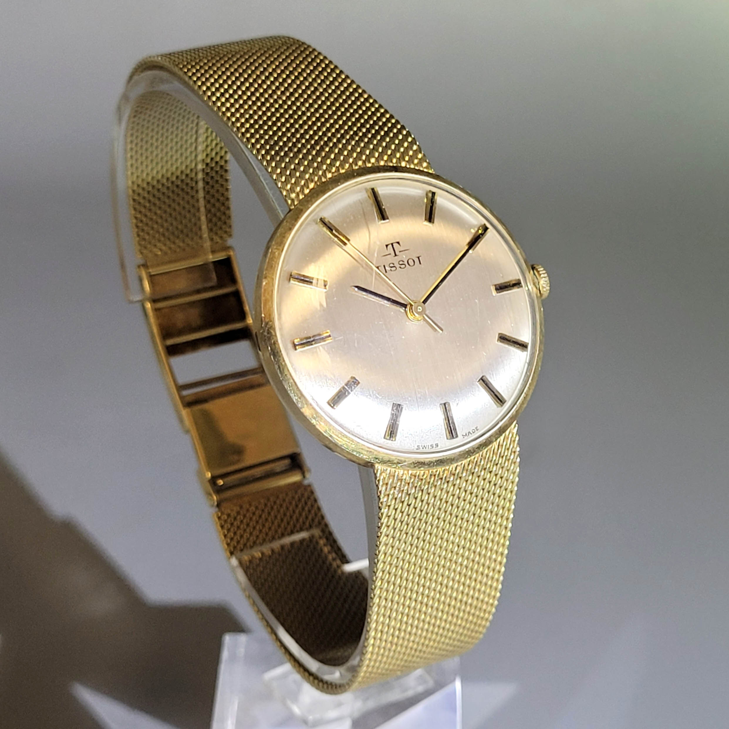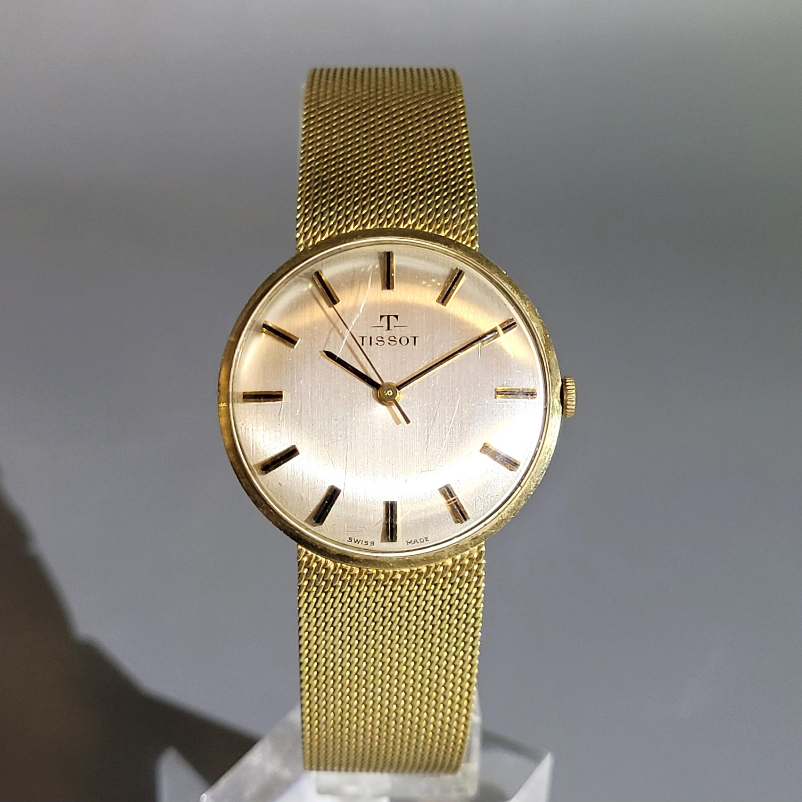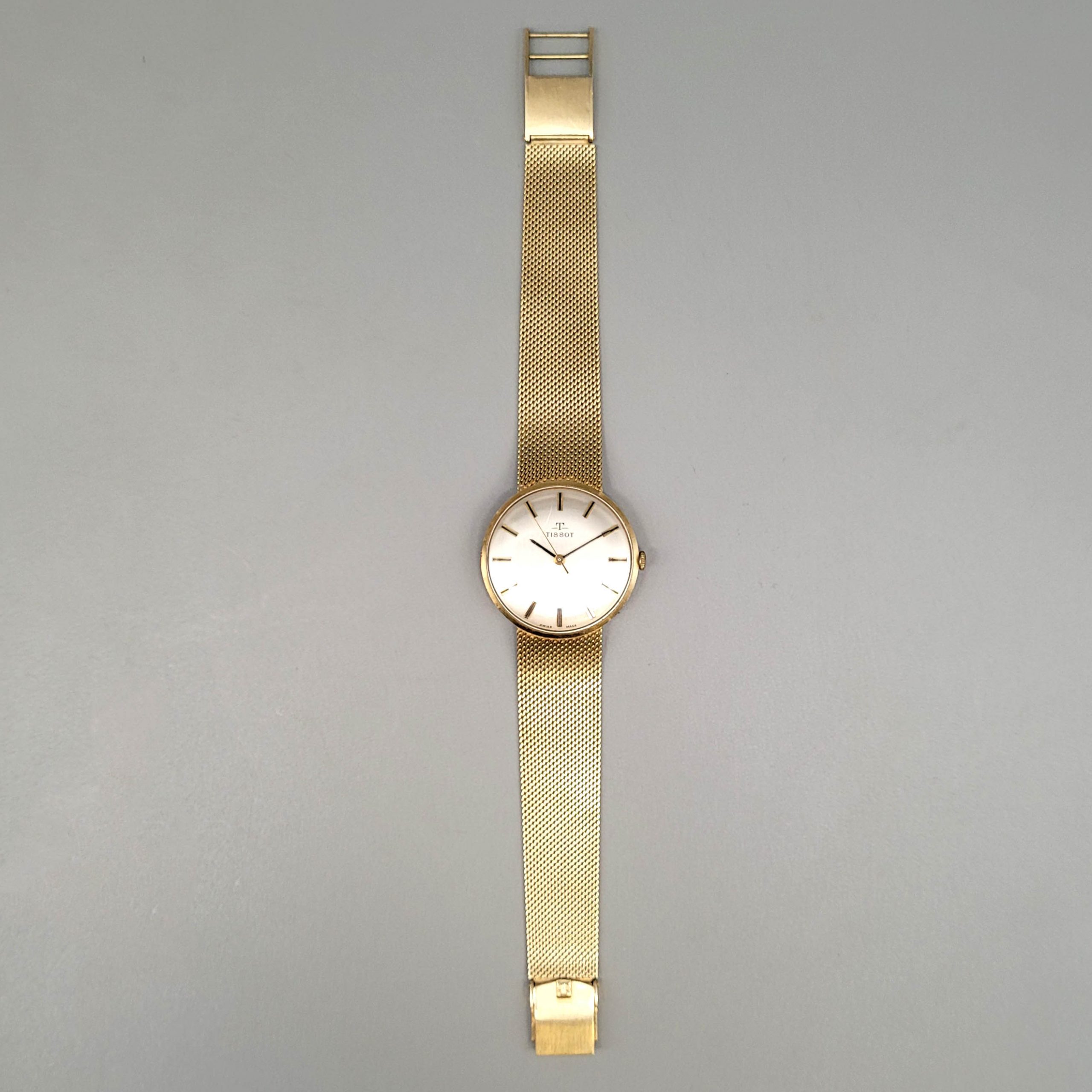 Herrenarmbanduhr Tissot 585er Gelbgold, Zifferblatt mit Stundenbalken, Sekundenzeiger, Handaufzug, Armband mit original Klapp-Verschluss, Länge Armband 21 cm, Gewicht 56g (Uhrwerk läuft an)