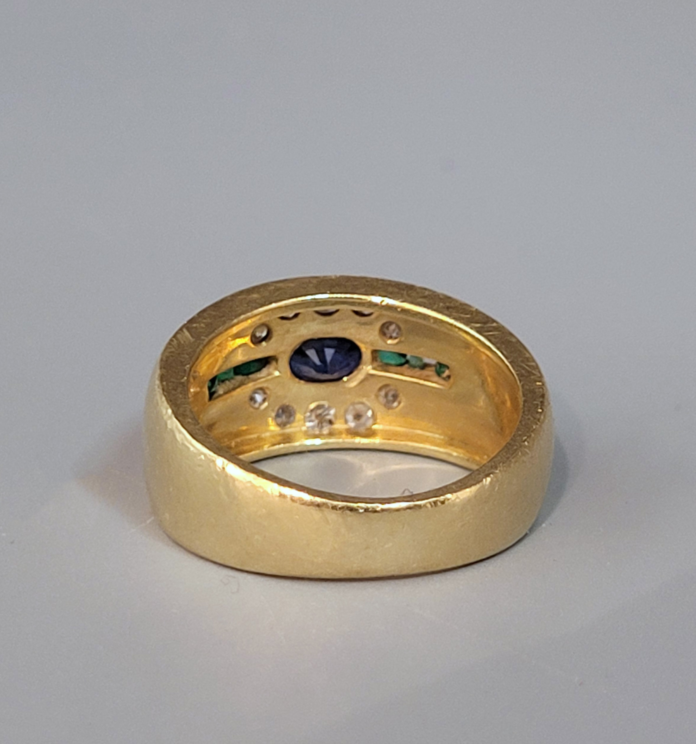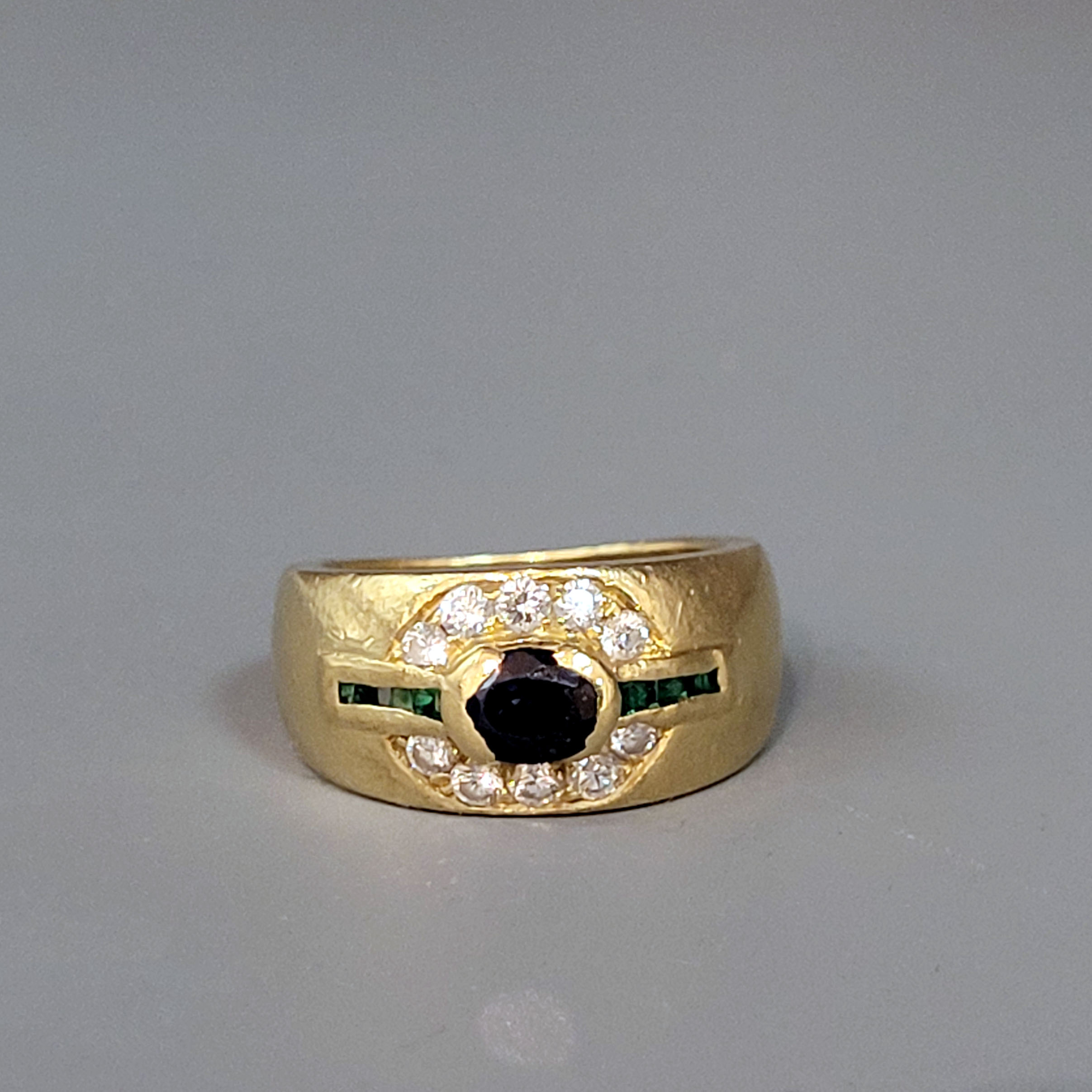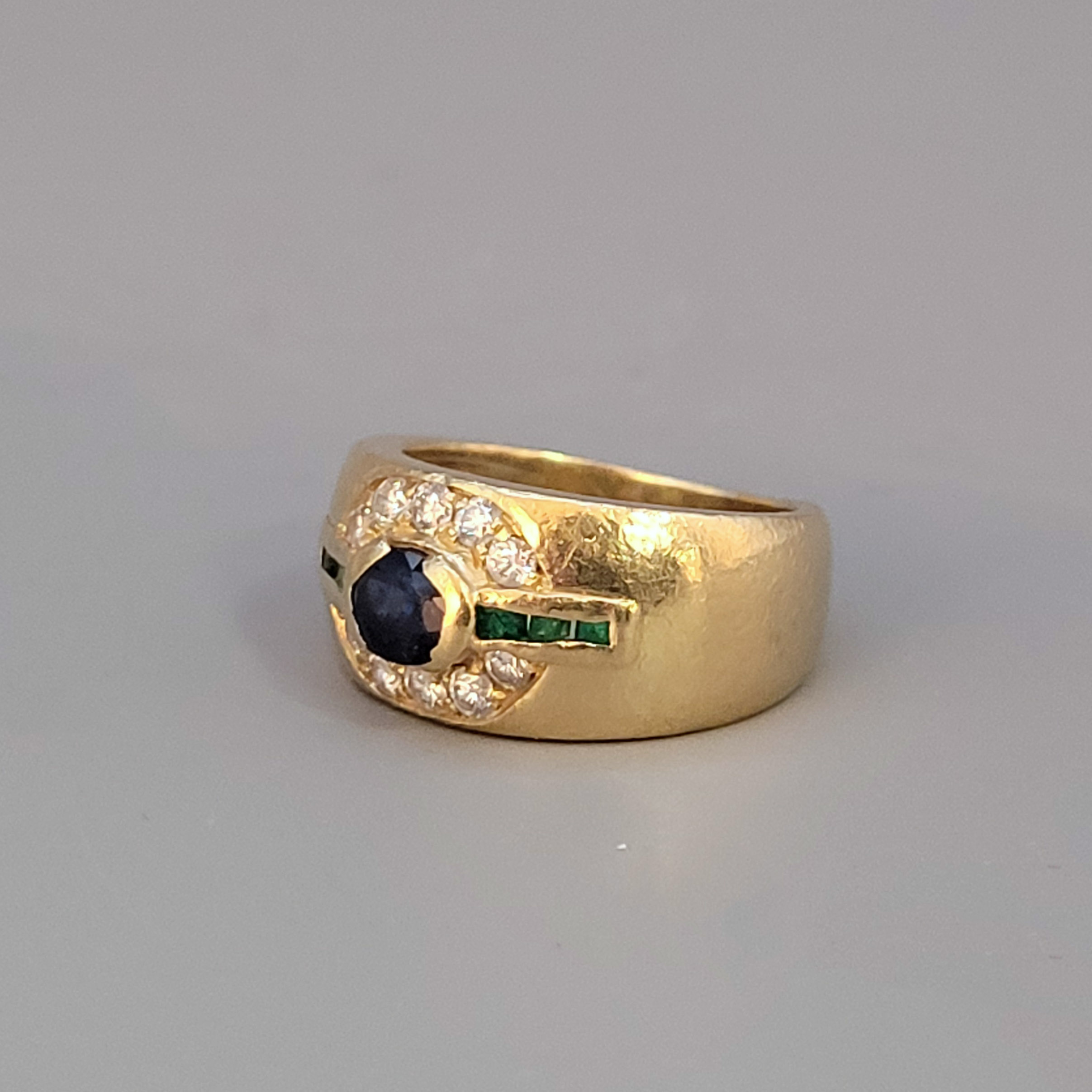 750er Gelbgold, Saphir (verkratzt), Smaragde (einer fehlt) und 10 Brillanten (zusammen ca. 0,30 ct), Ringgröße 50, Gewicht ca. 8g