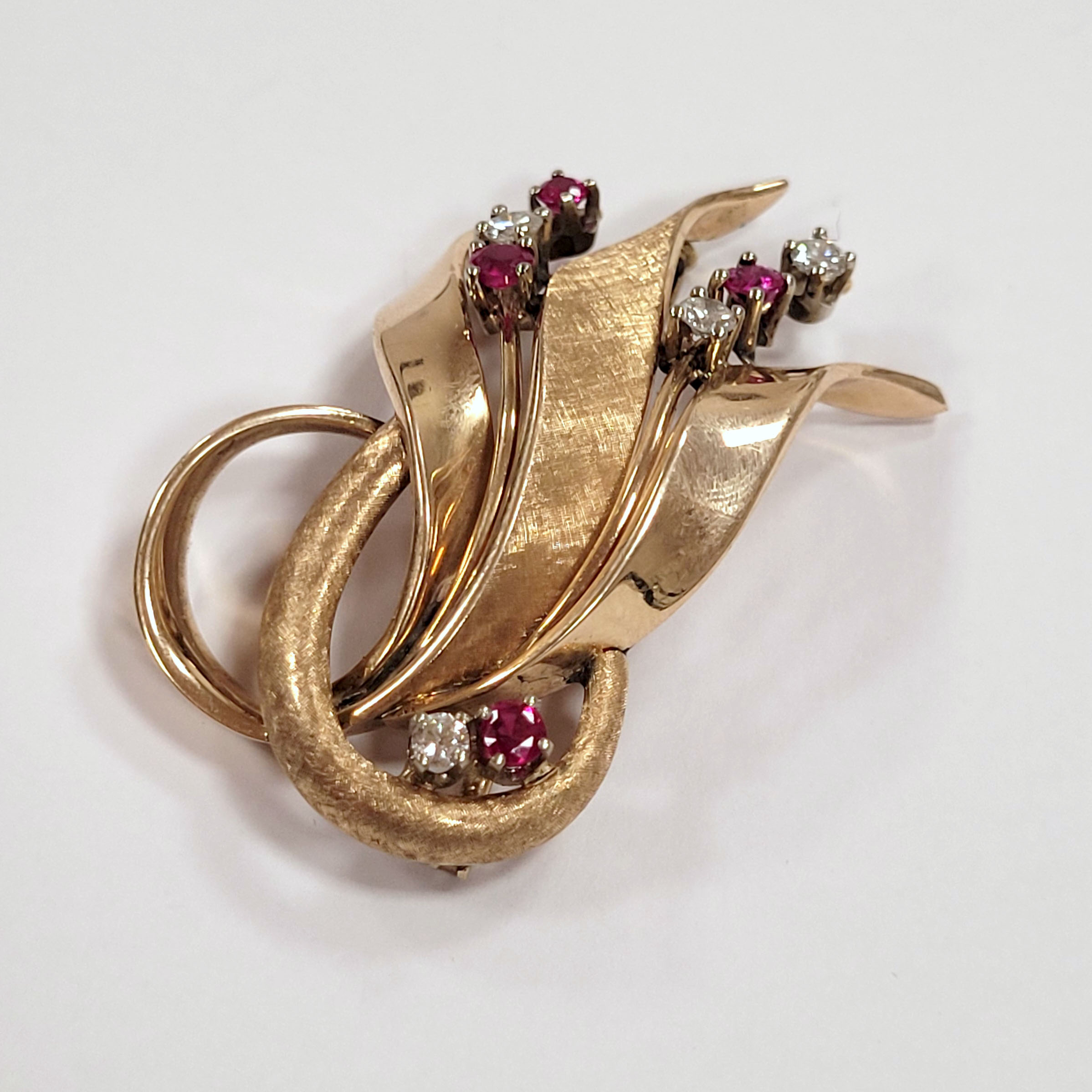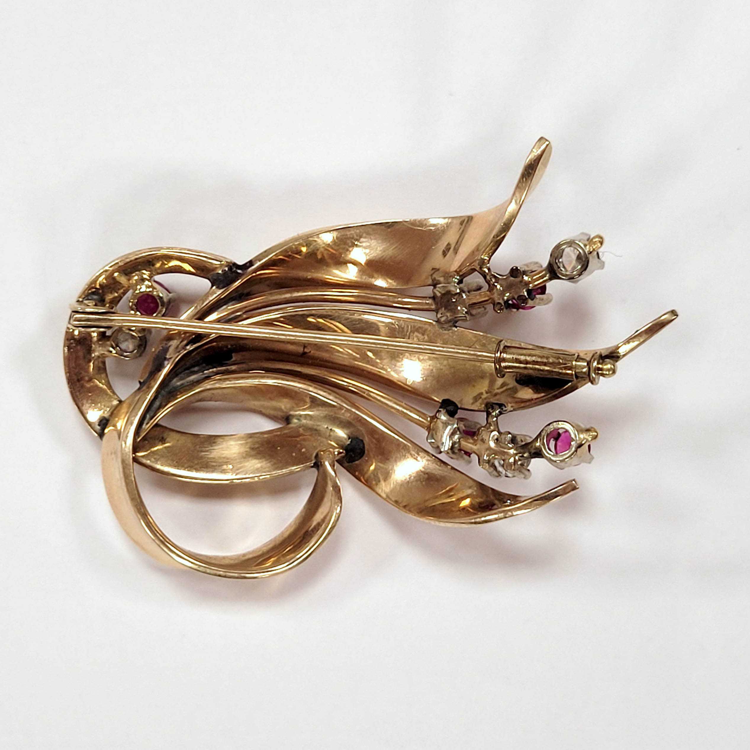 Brosche585er Gelbgold, poliert und guillochiert, 4 Rubine, 4 Brillanten, 5 x 2,7 cm, Gewicht ca. 16g