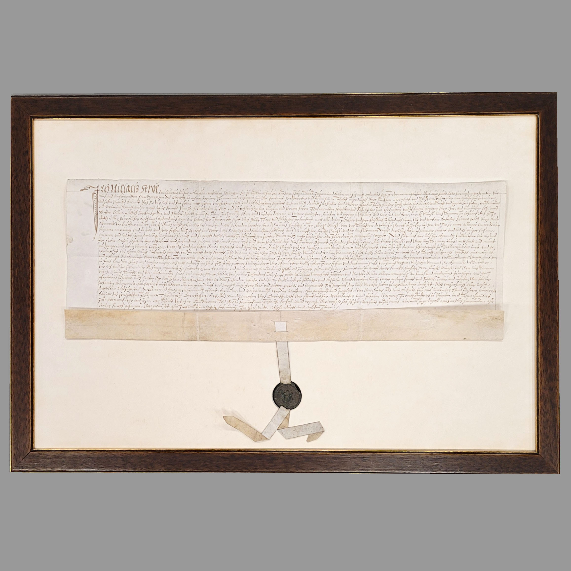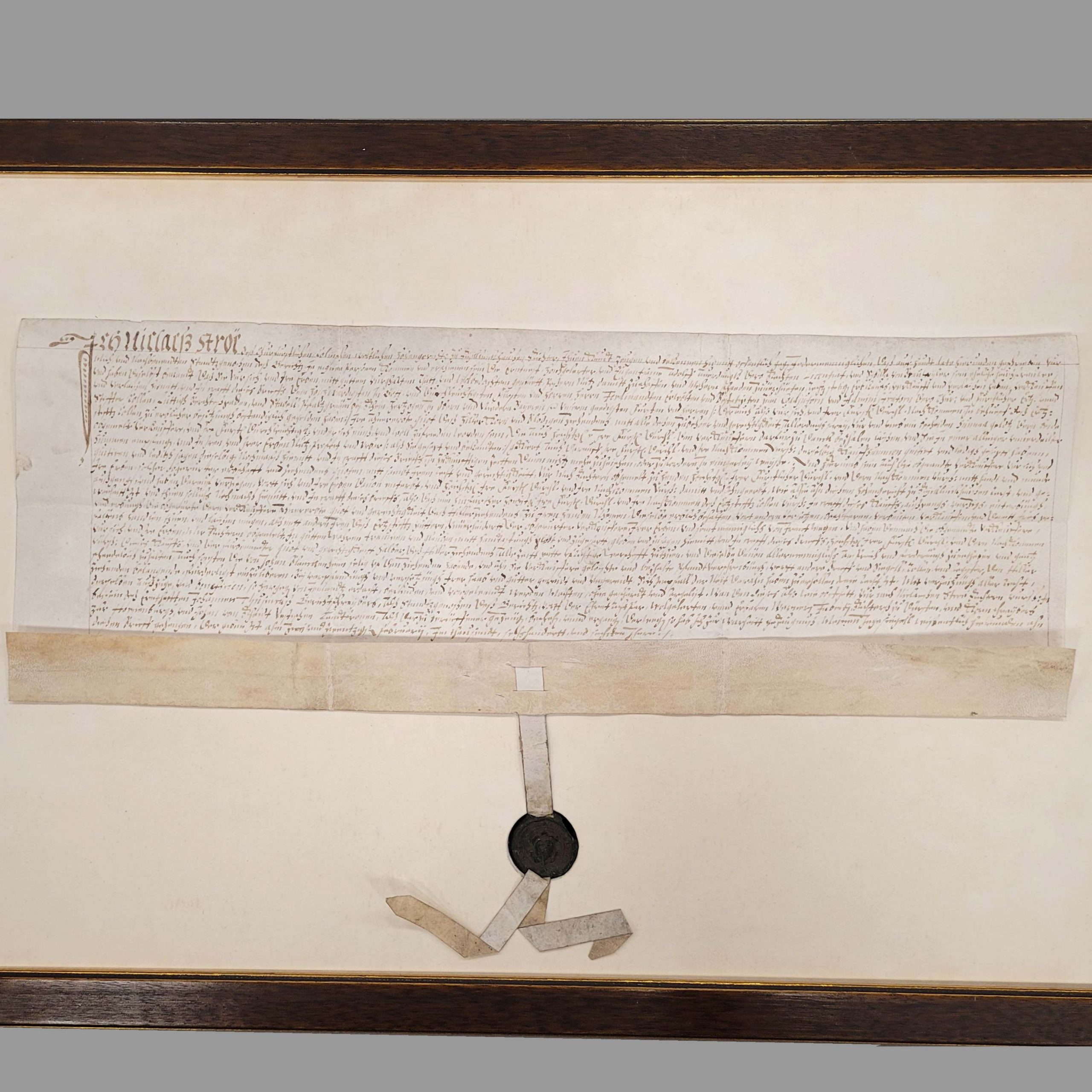 UrkundeHandschrift in brauner Tinte auf Papier, angehängtes Siegel, Urkunde datiert 1560, montiert im Rahmen, 18 x 51 cm (Textblatt ohne Siegel)