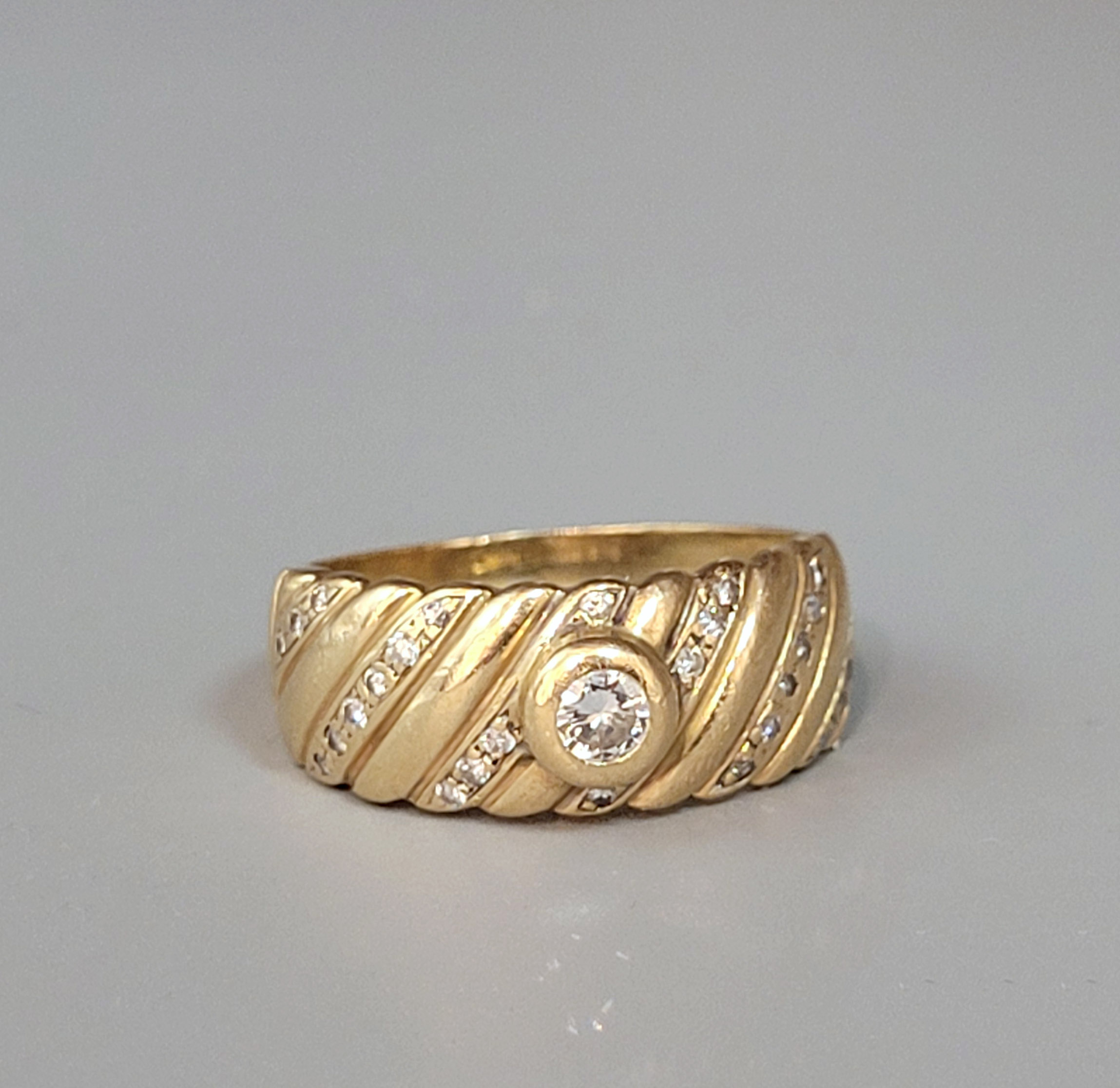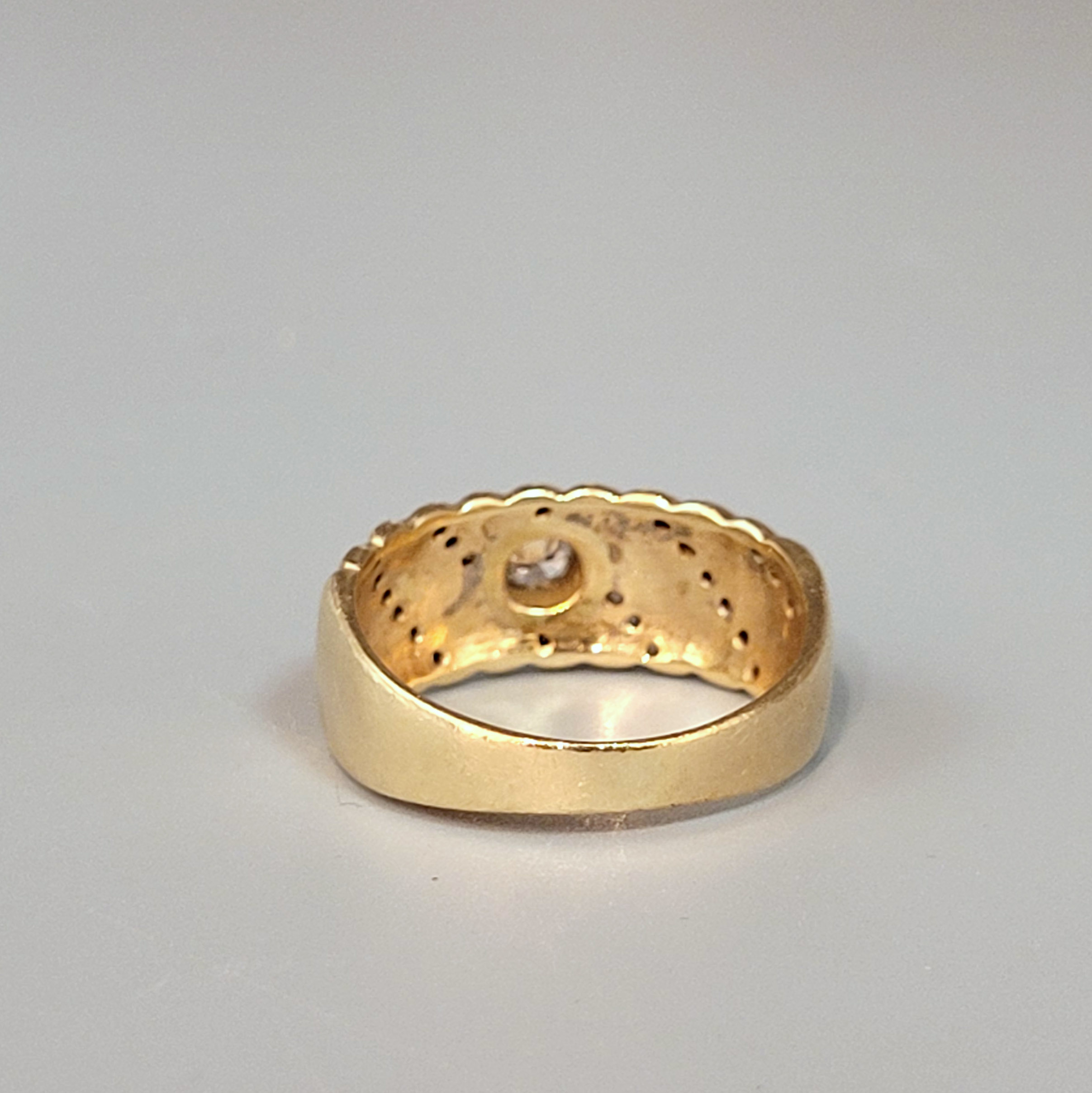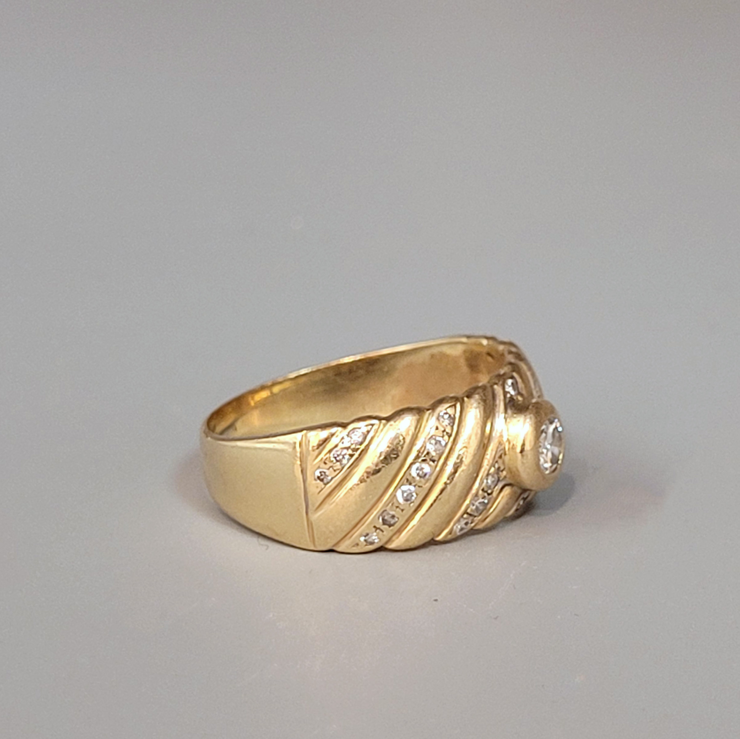 585er Gelbgold, zentraler Brillant (ca. 0,18 ct), 26 weitere Brillanten, Ringgröße 58, Gewicht ca. 6g