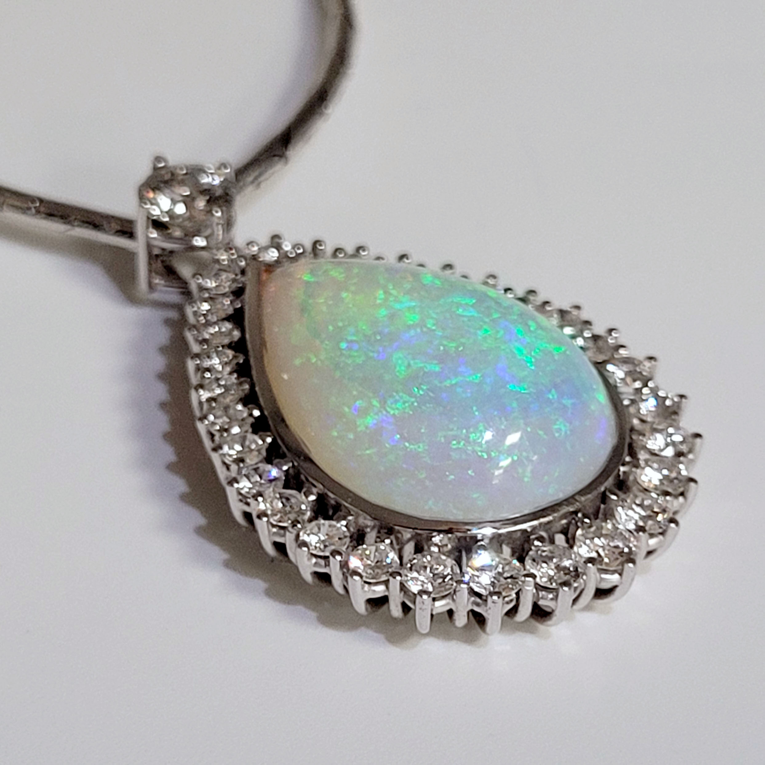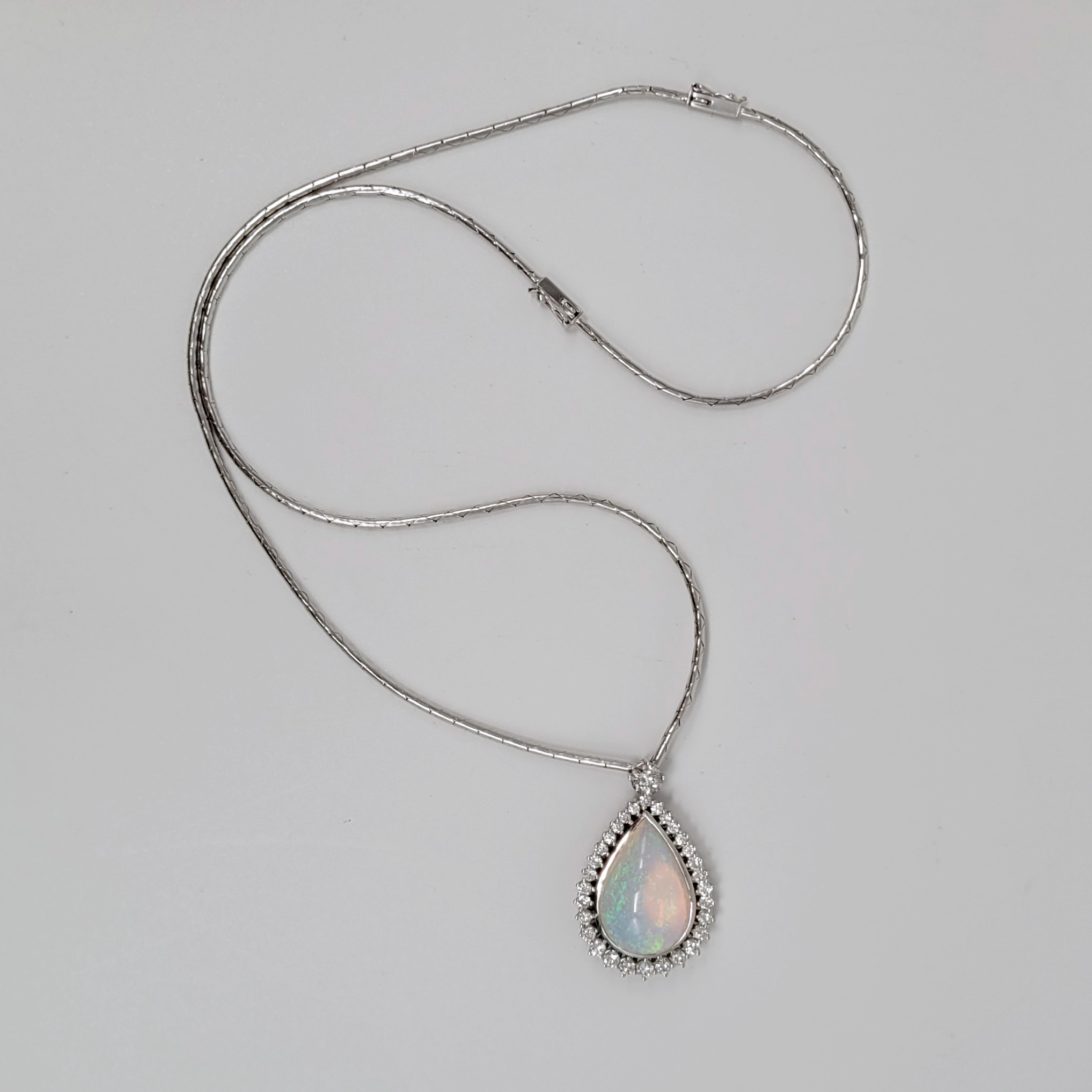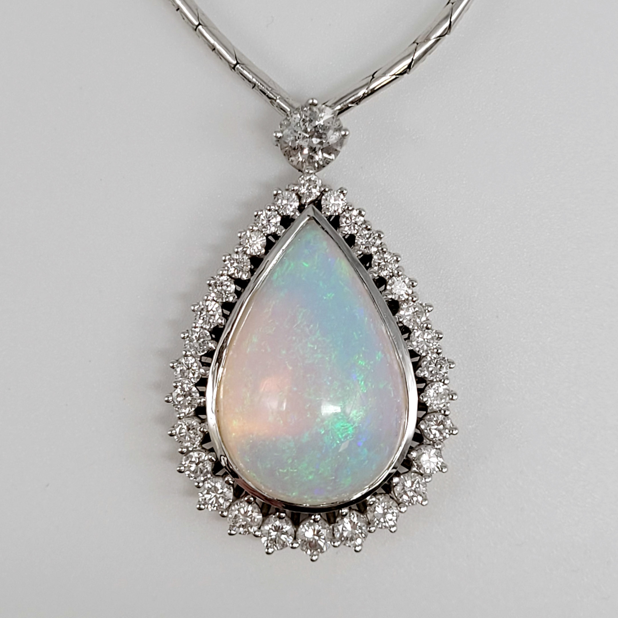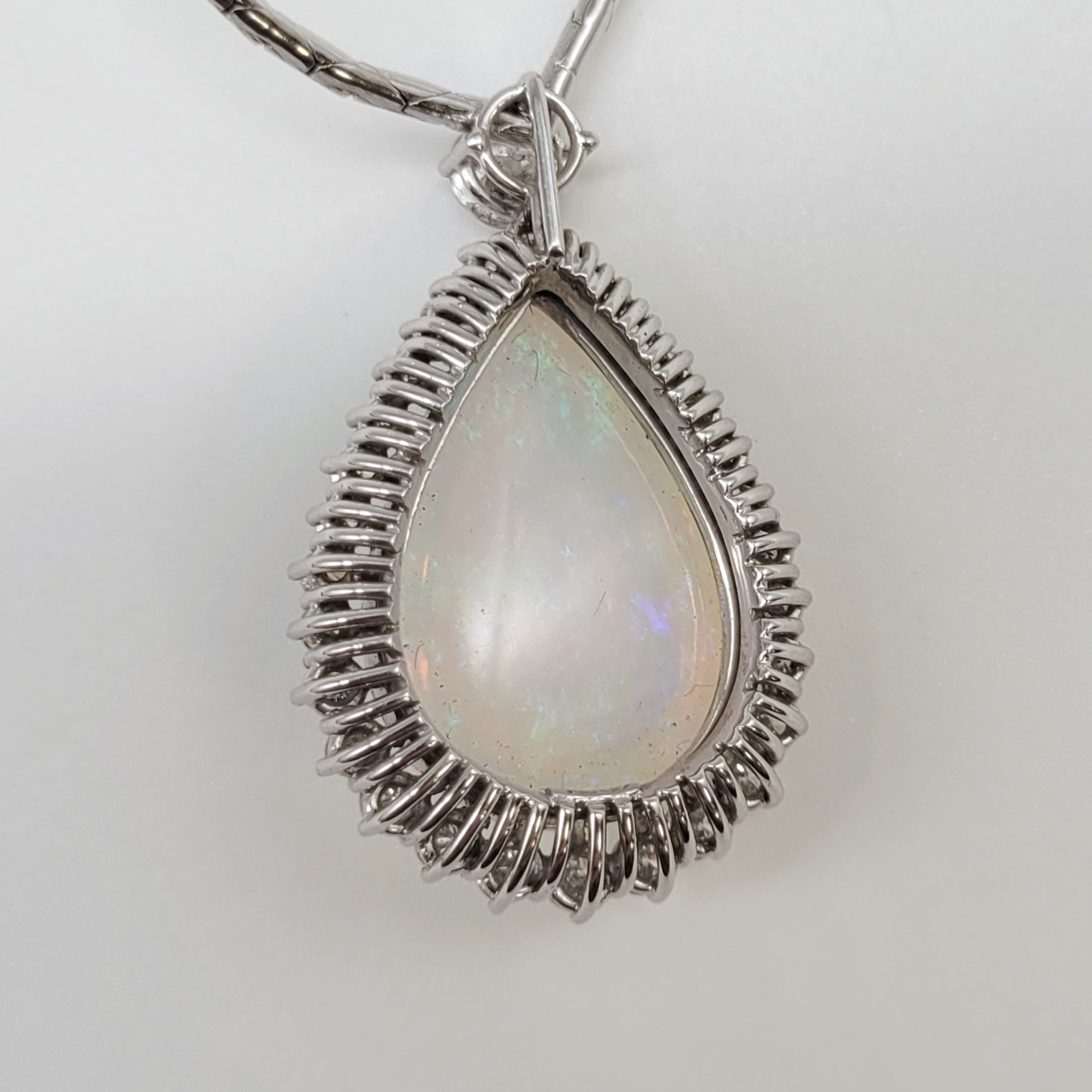 Kette mit Anhänger750er Weißgold, Anhänger Opal, Brillant (ca. 0,25 ct), Besatz von 30 Brillanten (ca. 0,45 ct), Kette mit zwei Kastenschlössern mit Sicherheitsbügeln, Länge Kette 24 (48) cm, Anhänger 3,5 x 2,4 cm, Gewicht ca. 26,5g