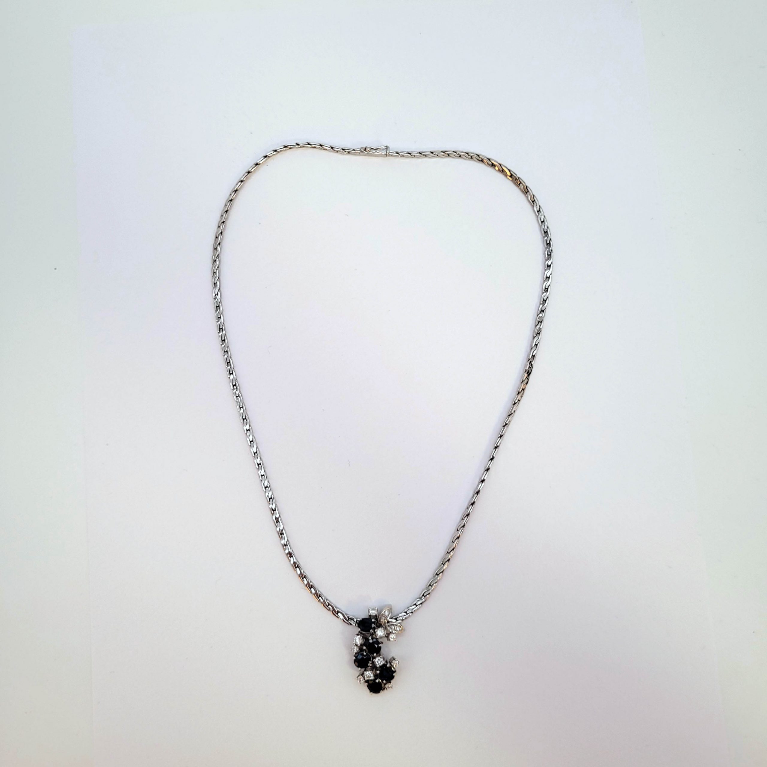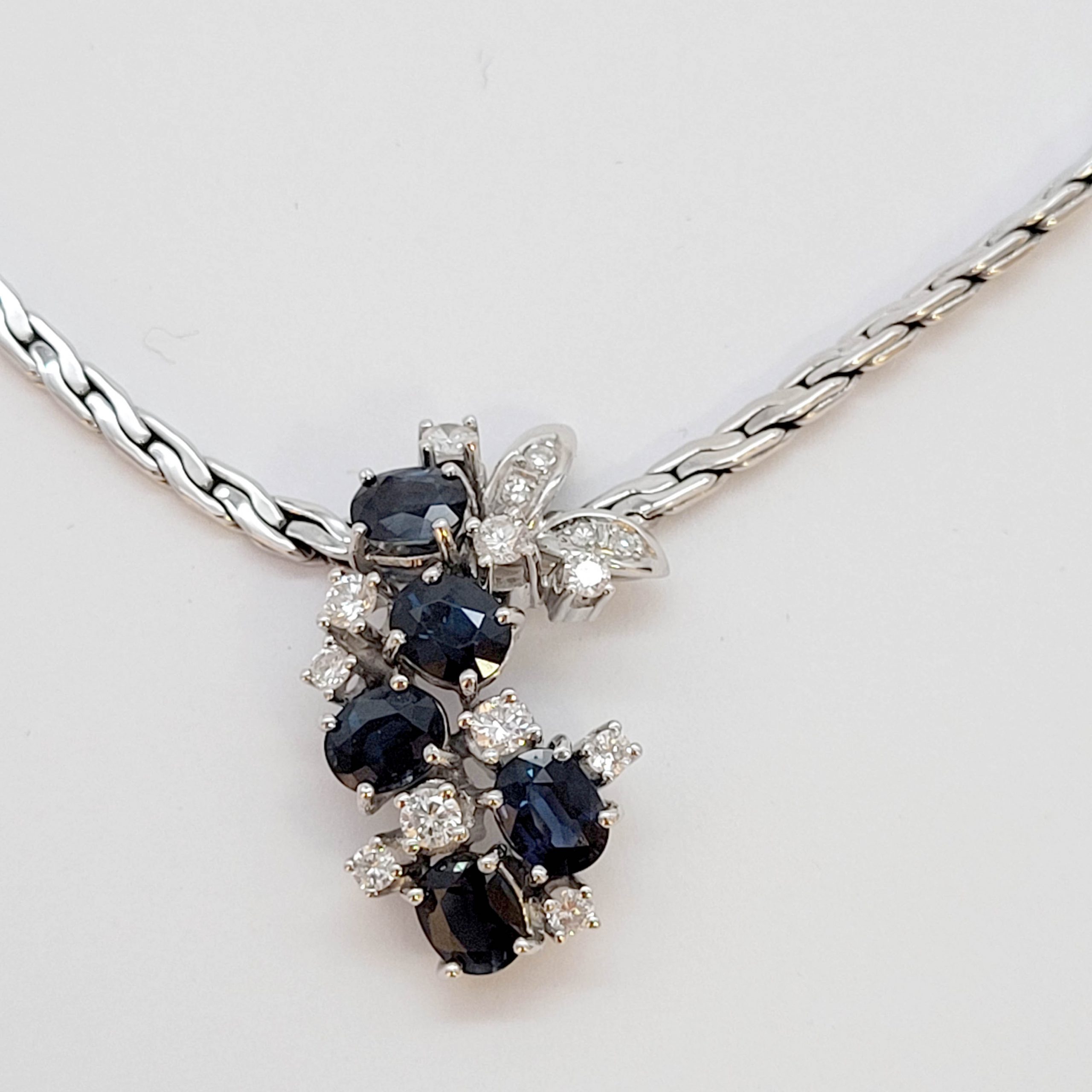 Collier585er Weißgold, 5 Saphire, 14 Brillanten (ca. 0,80 ct), Kastenschloss mit Sicherheitsbügel, Länge Kette 46 cm, Gewicht 24g
