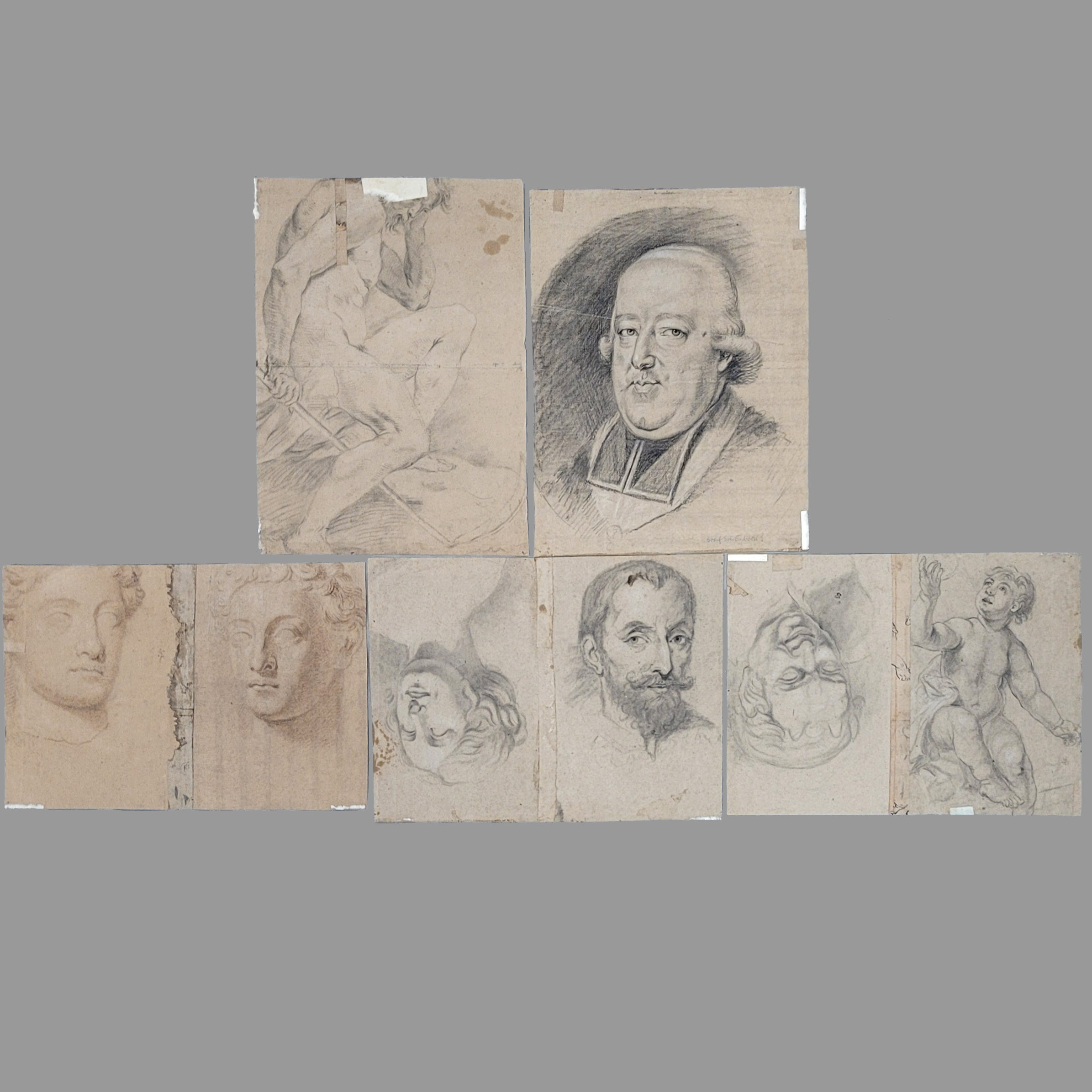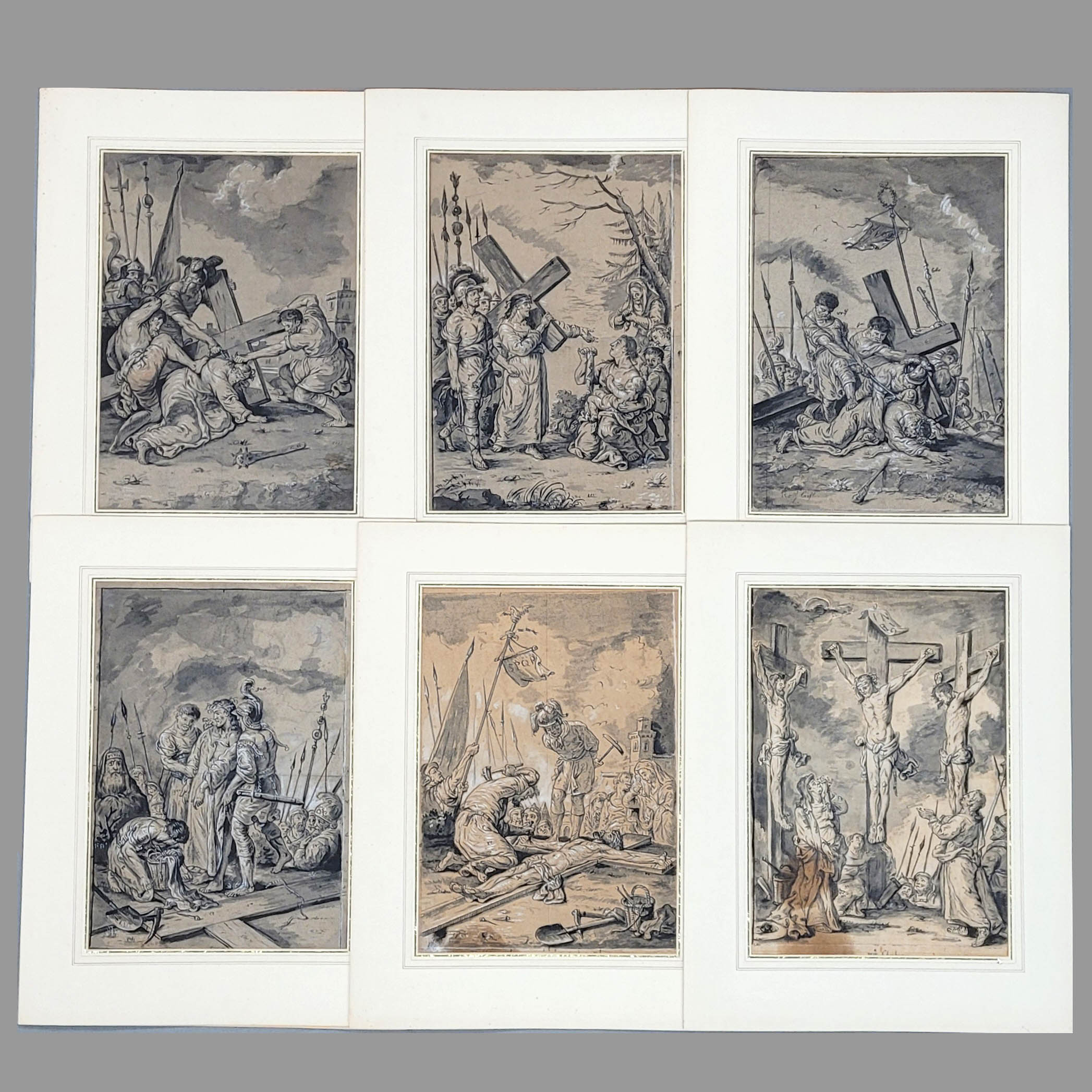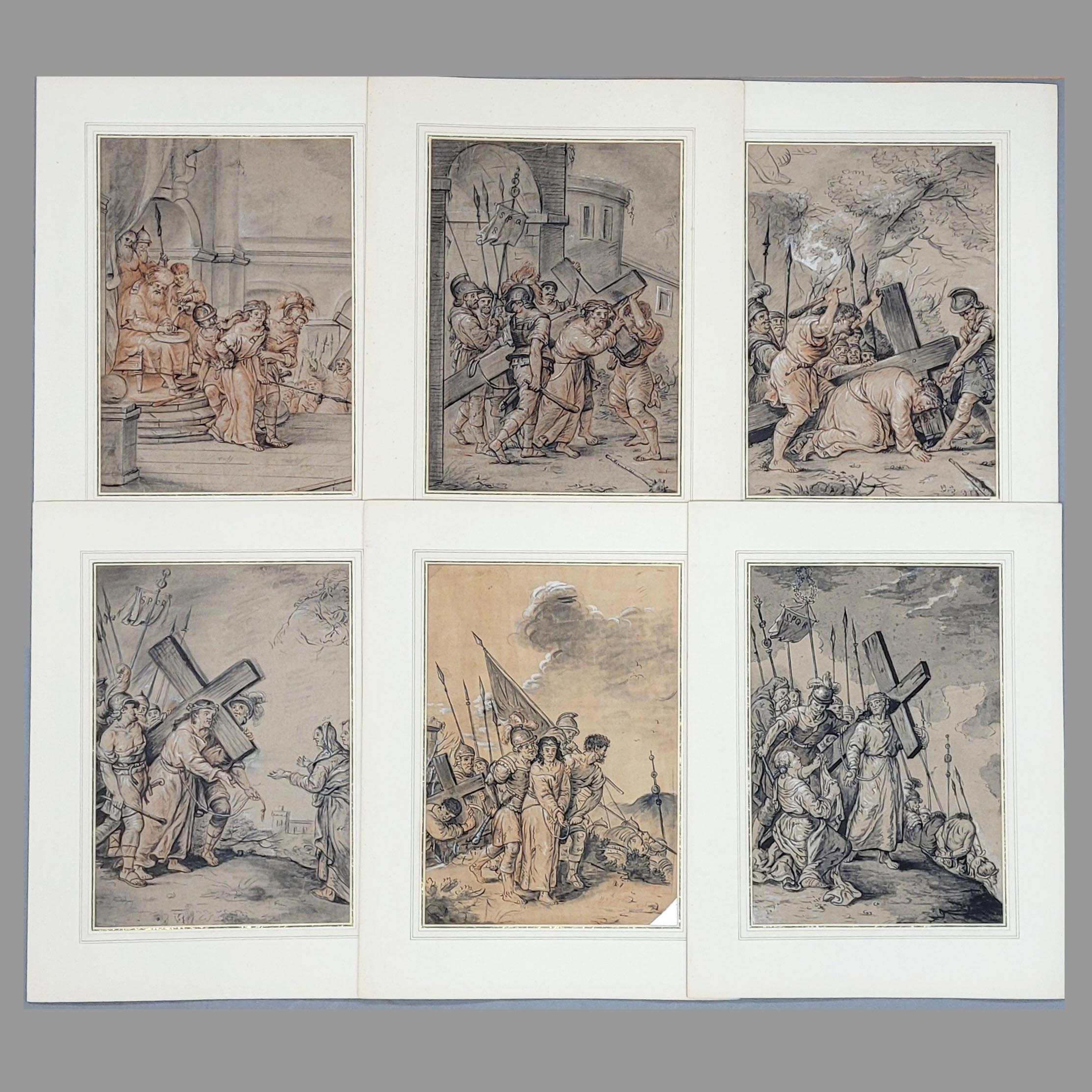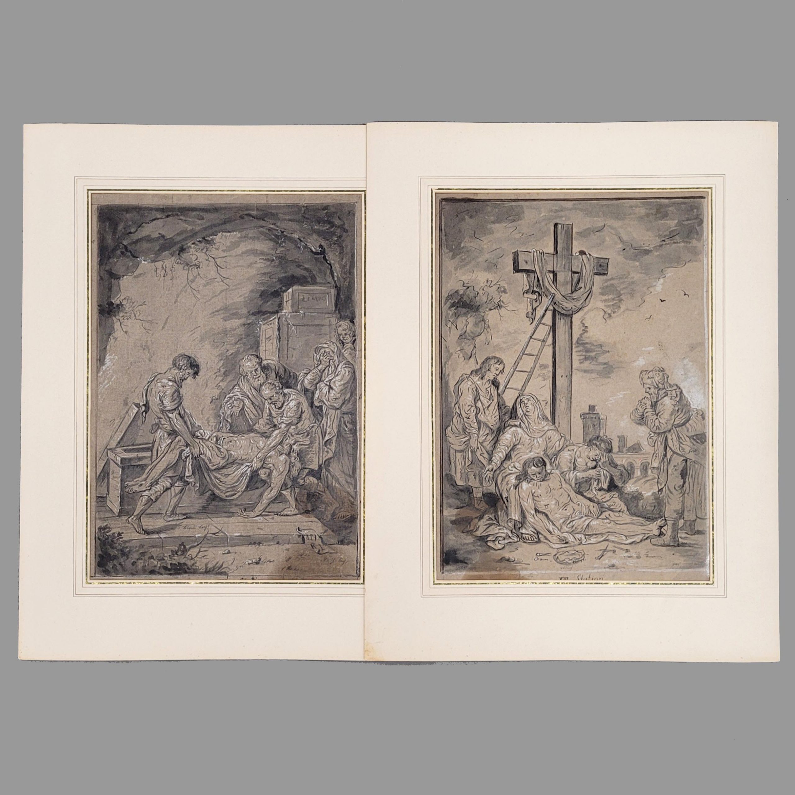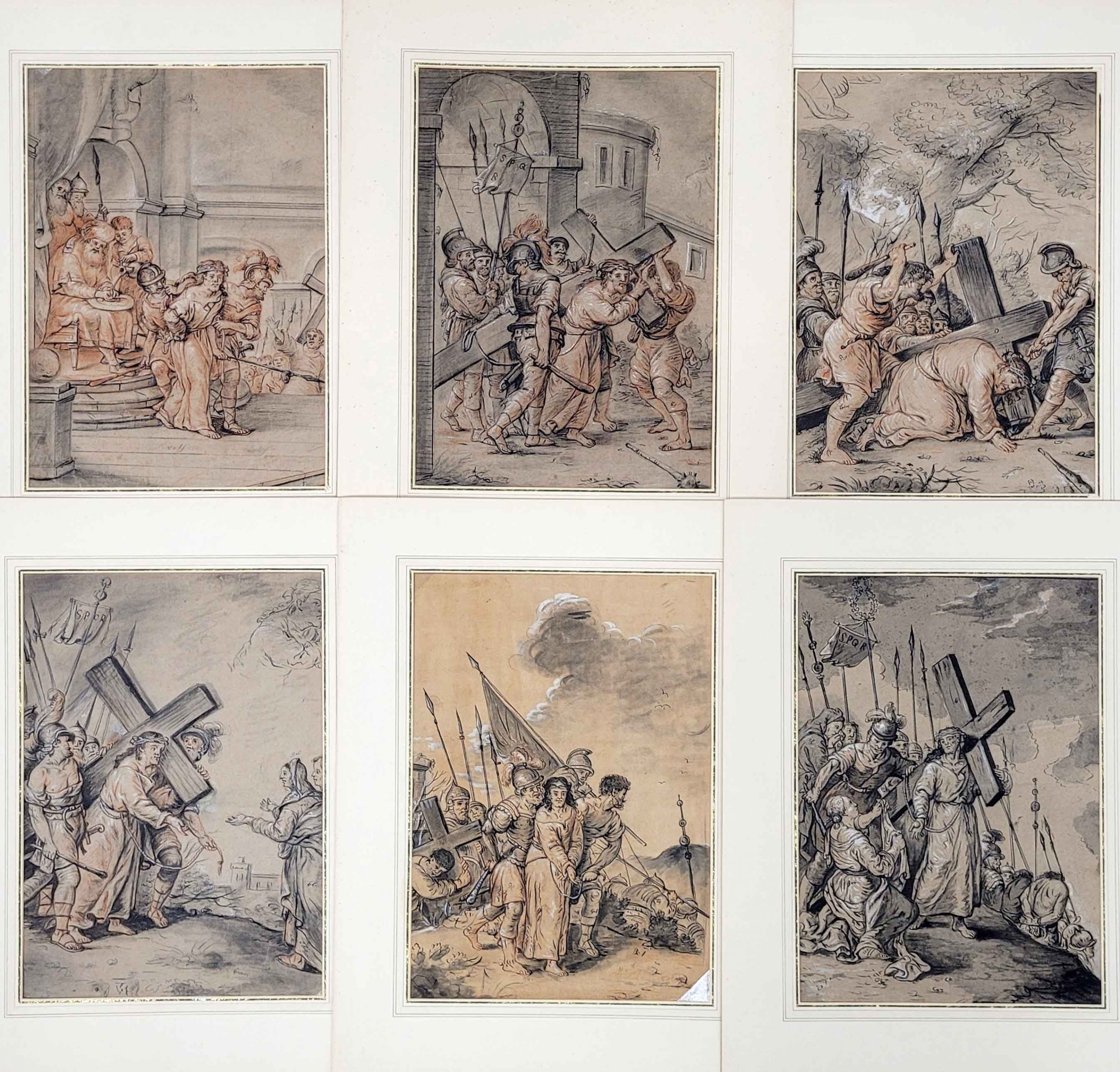 zugeschrieben, 14 Entwurfszeichnungen für Gemälde eines Kreuzwegs,Tinte, Feder laviert, Deckweiß, Rötel, Kreide auf Papier, mit Farbangaben, verso zum Teil mit weiteren Zeichnungen (Porträt eines Erzbischofs [alt bezeichnet Graf Schönborn], Studie eines Chronos, diverse Kopfstudien, Entwurf für die Stationsbildstöcke) und Abrechnungen, ca. 46 x 35 cm, entnehmbar montiert im Klapp-Passepartout (Hochinteressante Entwurfsarbeit, die sicher ausgeführt wurde und möglicherweise bis heute erhalten ist. Für eine Verortung dieses Kreuzweges und des Auftraggebers dürfte die einwandfreie Identifikation des Porträts des Erzbischofs ausschlaggebend sein. Die Zuschreibung an Rottmayr wurde von Sotheby`s, London im Sept. 2025 dem Eigentümer bestätigt)