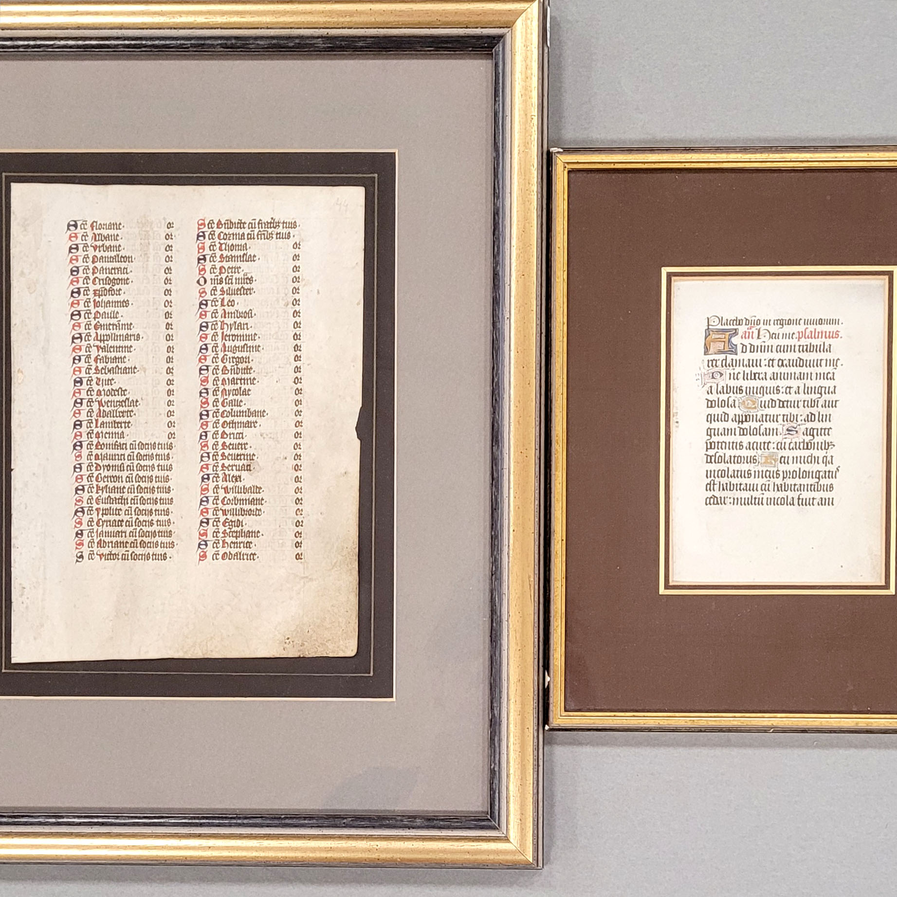 Blatt mit Auszug aus der Heiligenlitanei, Handschrift in brauner Tinte auf Pergament, rote und blaue Initialen, Deutsch 13. Jahrhundert, 22 x 16,5 cm, gerahmt unter Glas und Passepartout Stundenbuchblatt, 14-zeilige Handschrift in schwarzer Tinte auf Pergament, farbige und goldbelegte Initialen, Frankreich, um 1450, 14 x 10 cm, gerahmt unter Glas und Passepartout, rückseitig auch verglast)