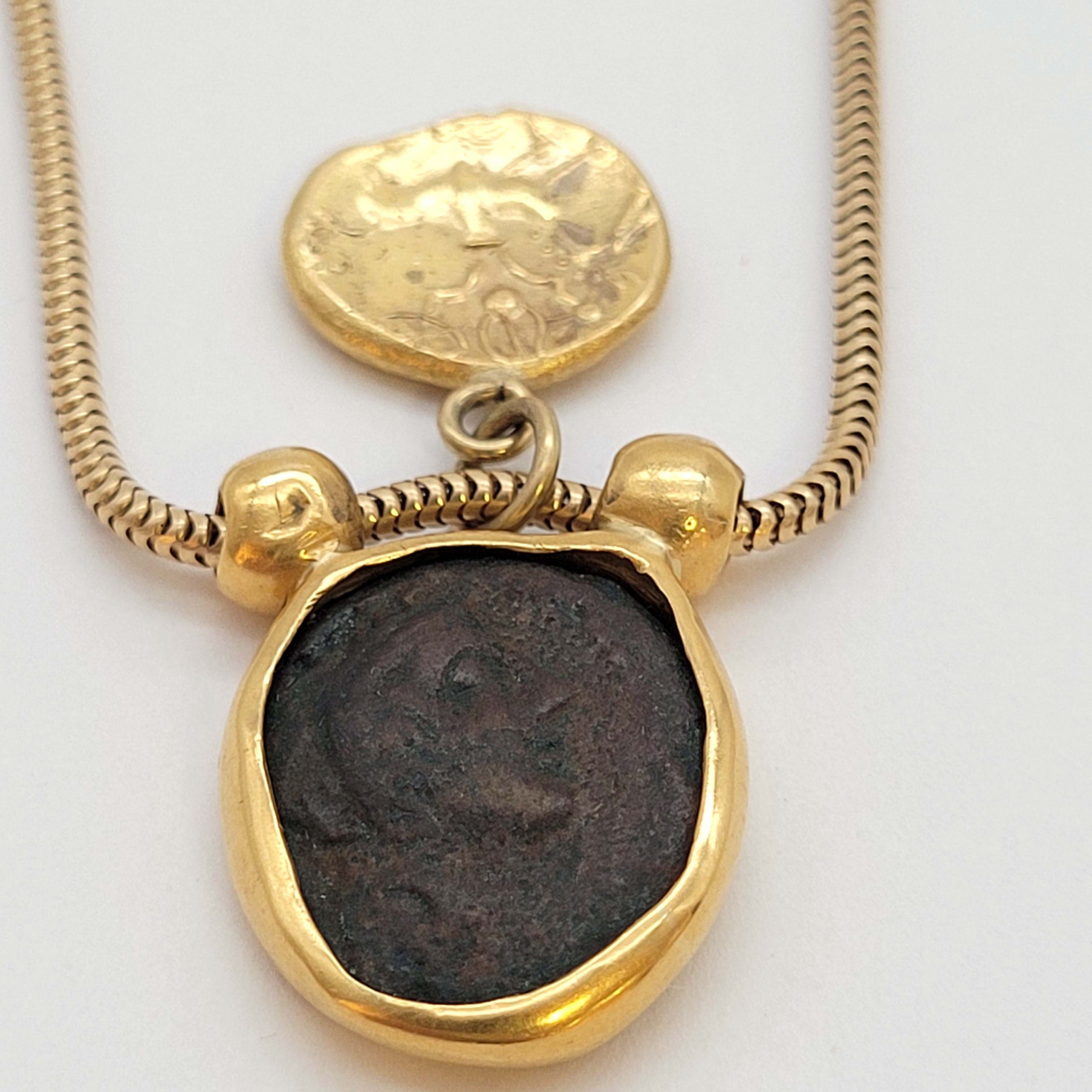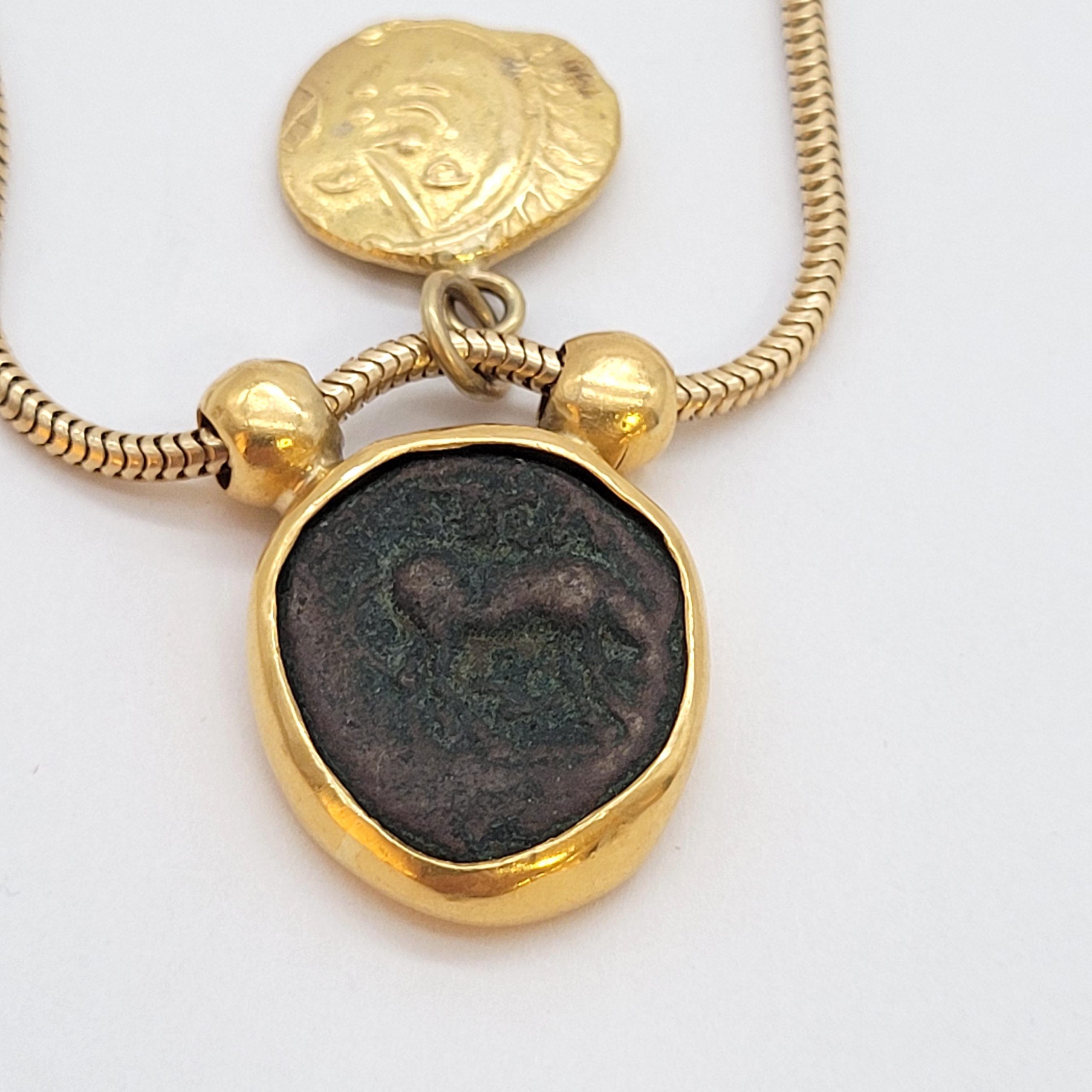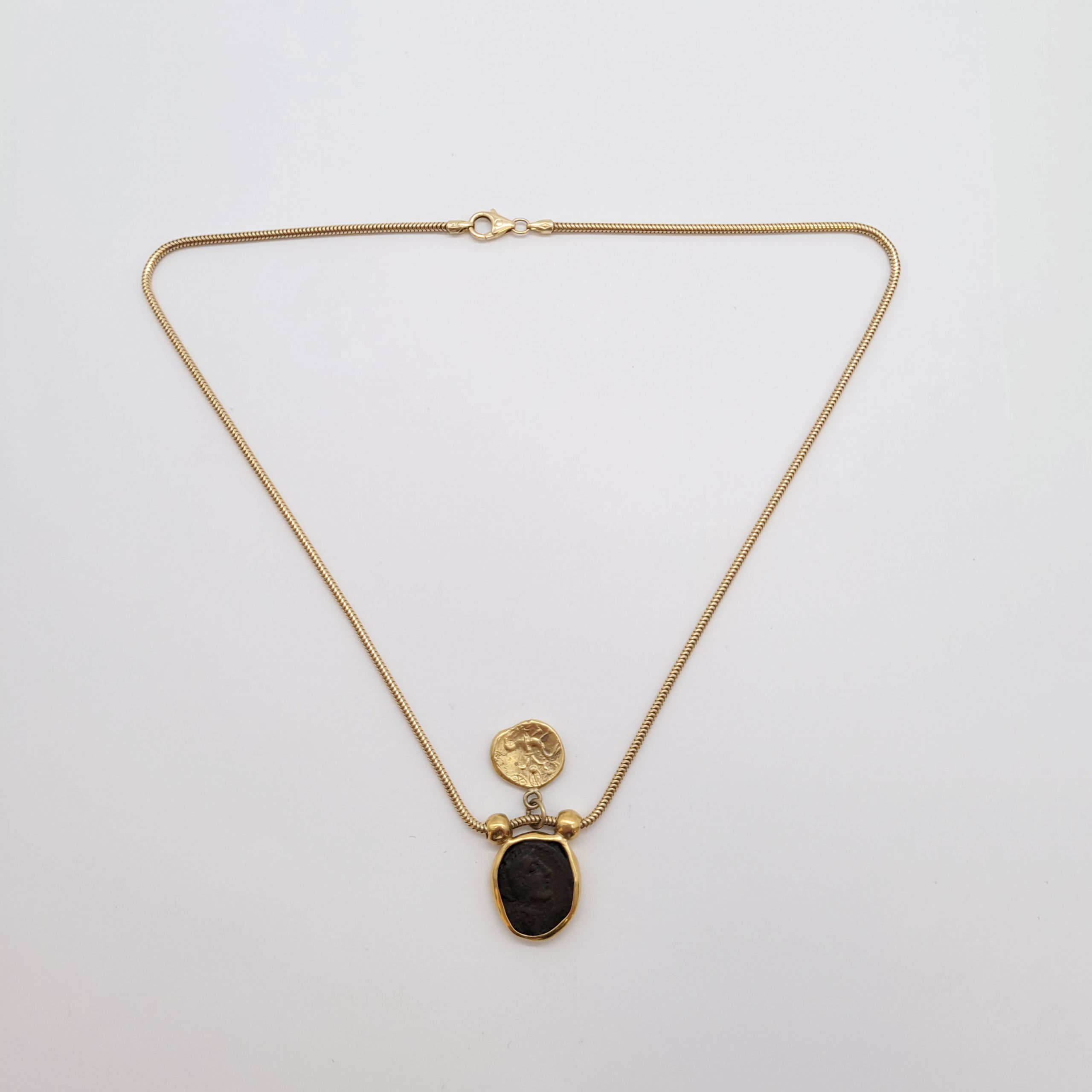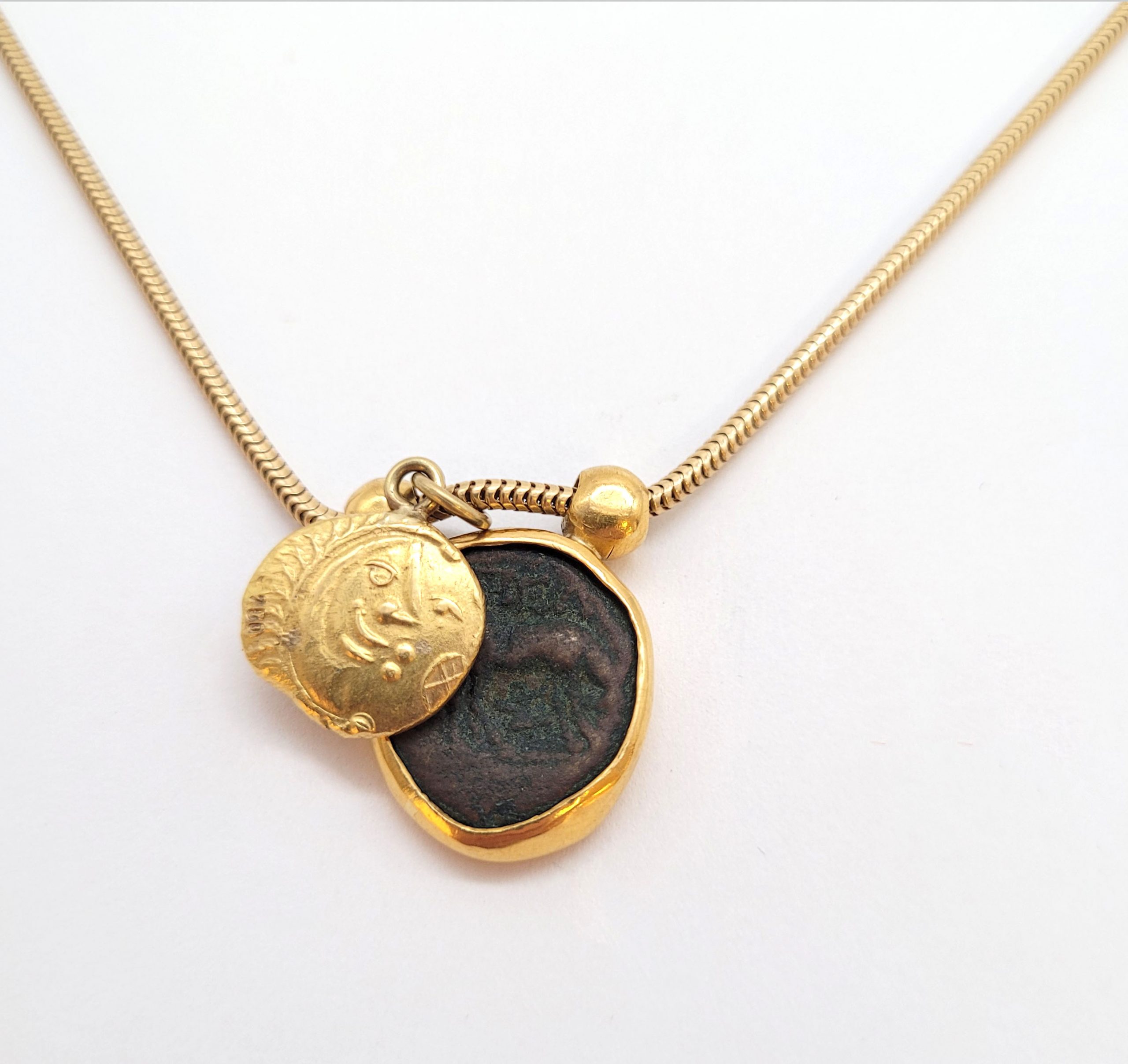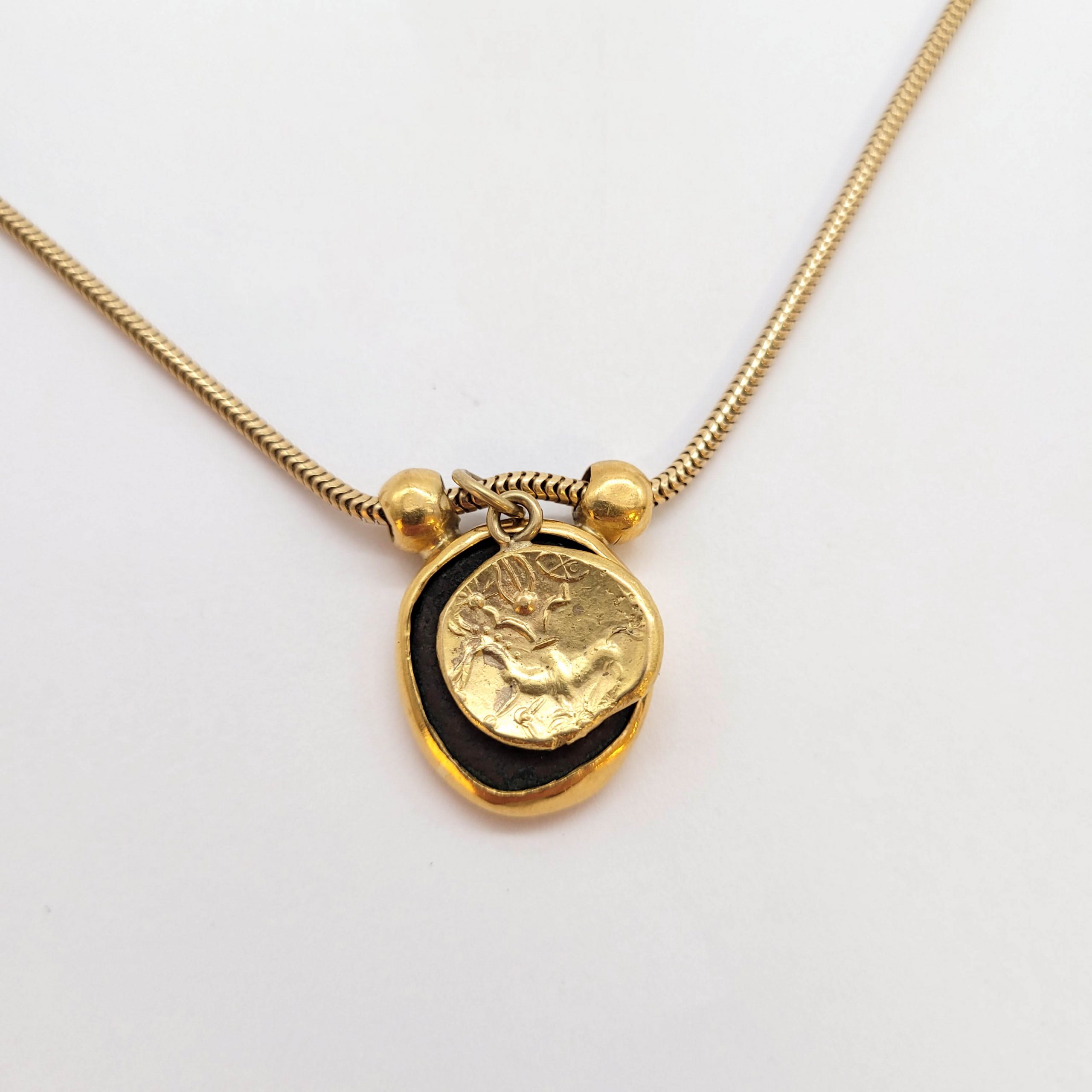 Kette mit Karabinerverschluss 585er Gelbgold, Anhänger mit Münzfassung 750er Gelbgold, Anhänger in Form eines keltischen Goldstaters 750er Gelbgold, Anhänger 2,5 x 1,8 cm, Durchmesser Stater 1,4 cm, Länge Kette 45 cm, Gewicht 23g