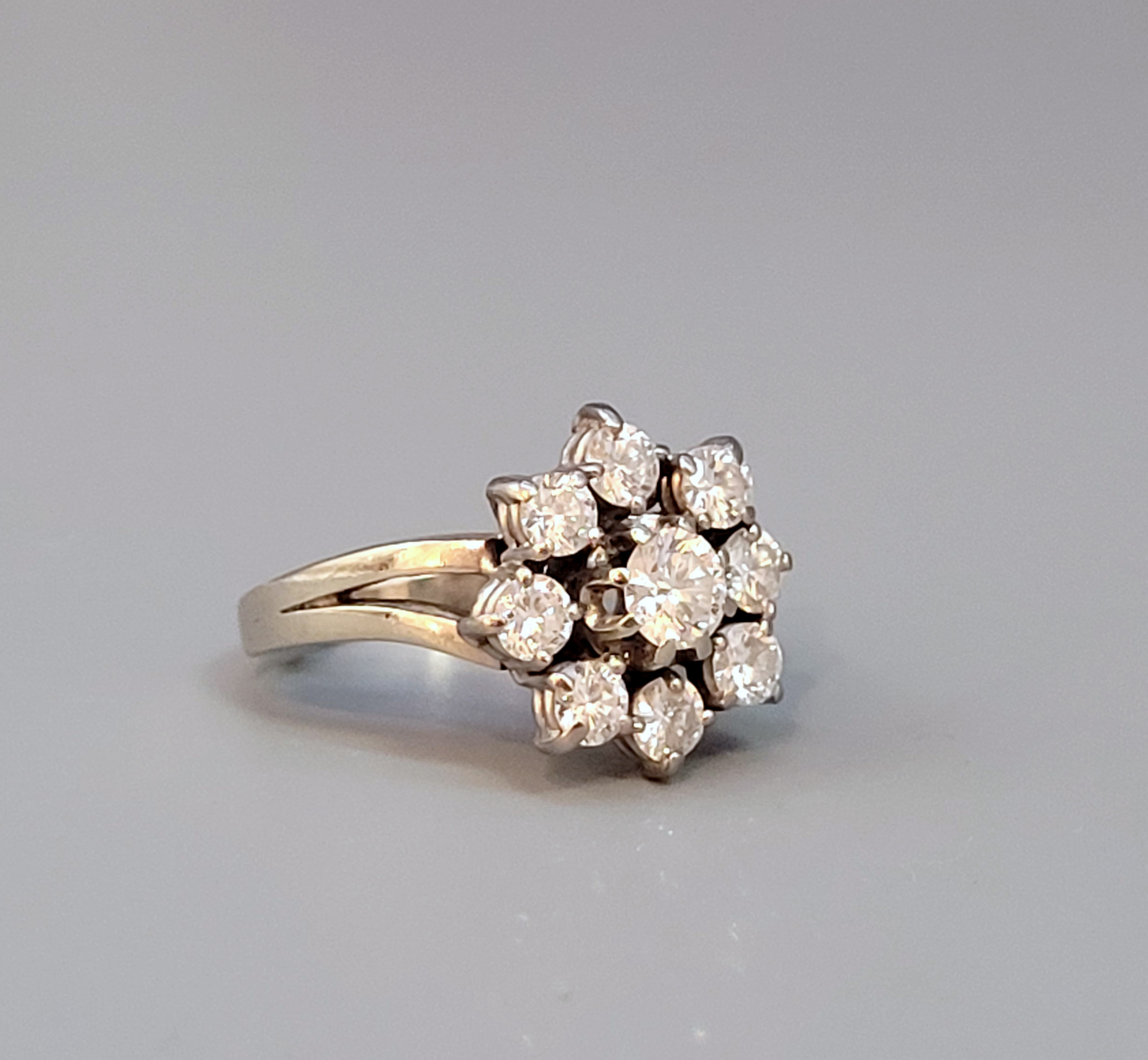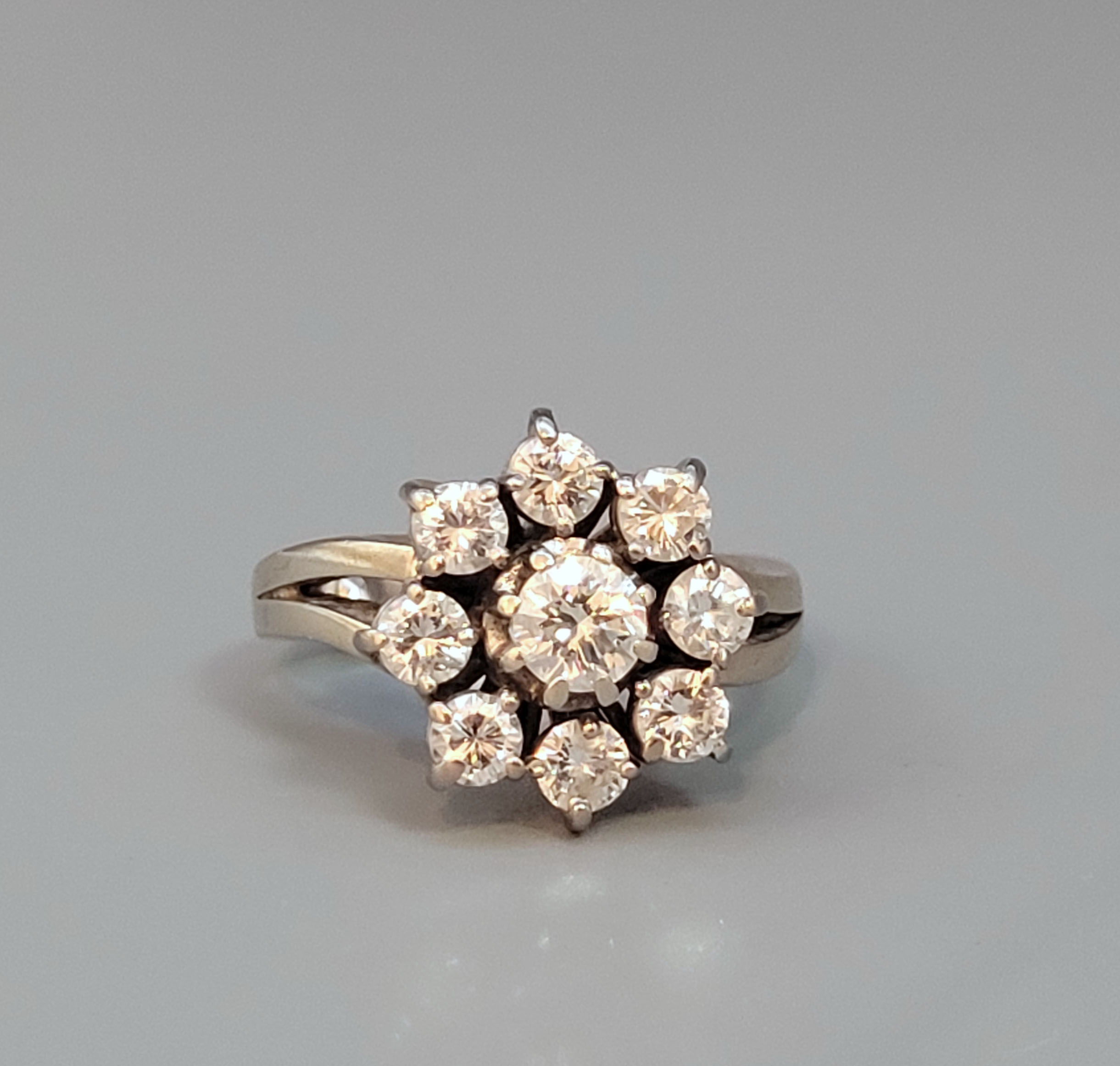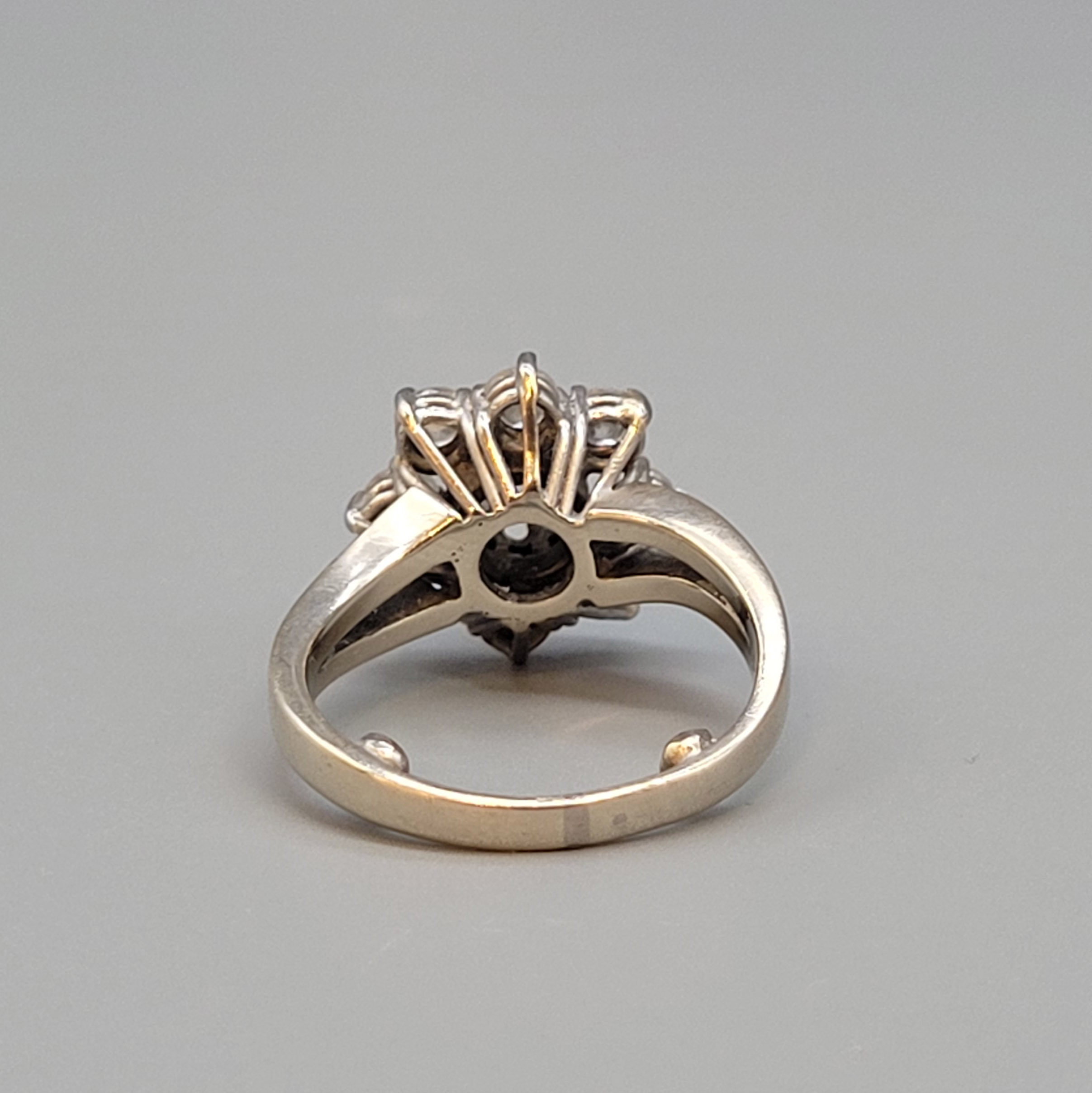 585er Weißgold, Rosette mit 9 Brillanten (zusammen ca. 1,5 ct), mittlerer Farb- und Reinheitsgrad (ein Diamant defekt), Ringgröße (Ringschiene durch eingesetzte Kügelchen verkleinert) 52, Gewicht ca. 6,5g