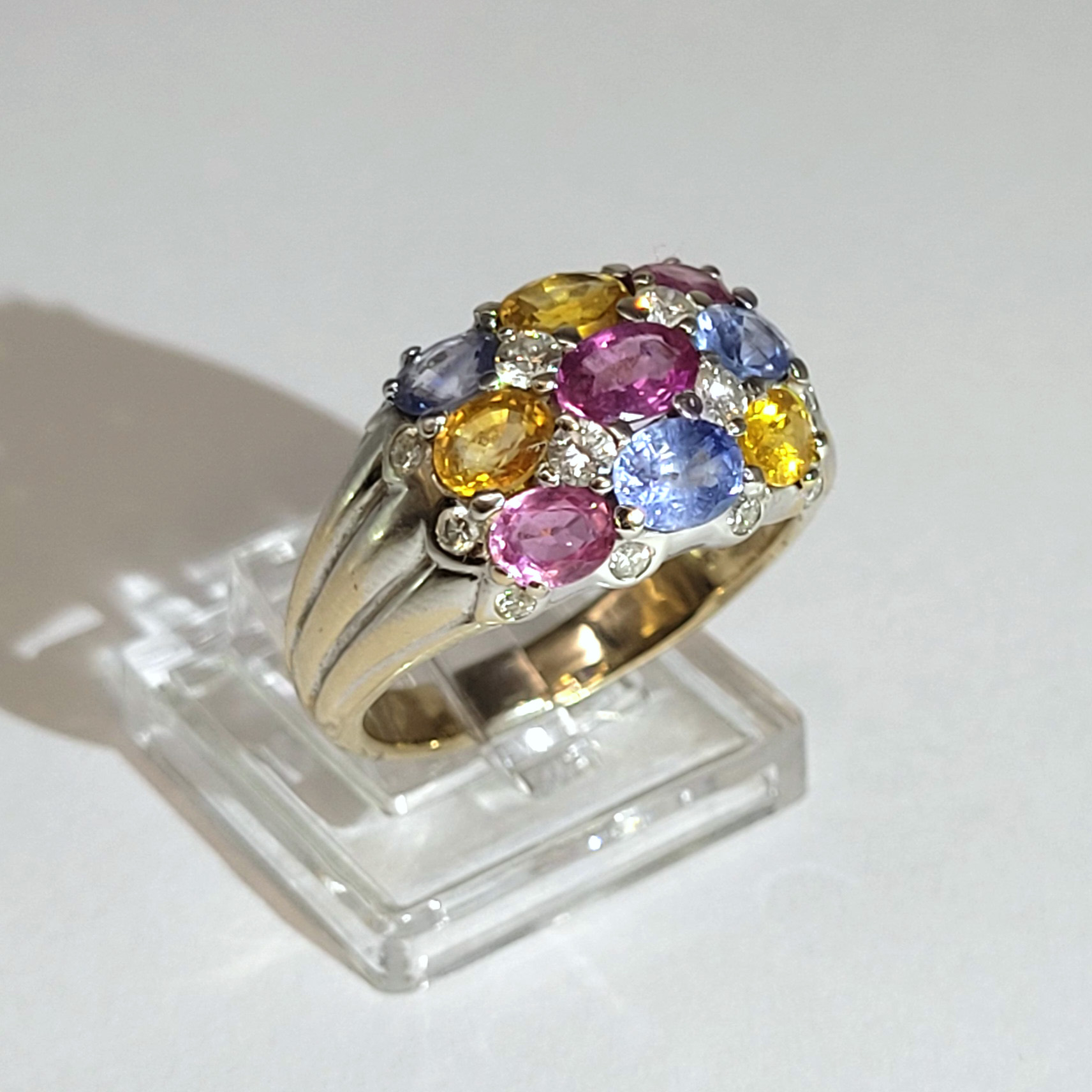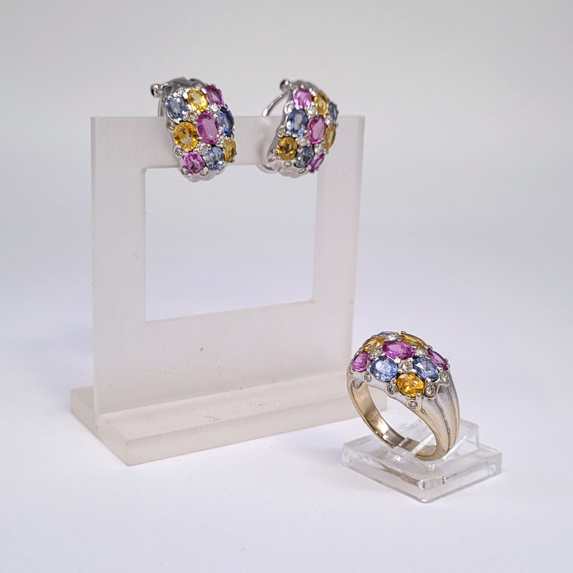 750er Weißgold, farbige Saphire (Ring 3,80 ct, Ohrclips 7,08 ct), Brillanten, Ringgröße 57, Ohrclips je ca. 2 x 1,2 cm, Gewicht 21g