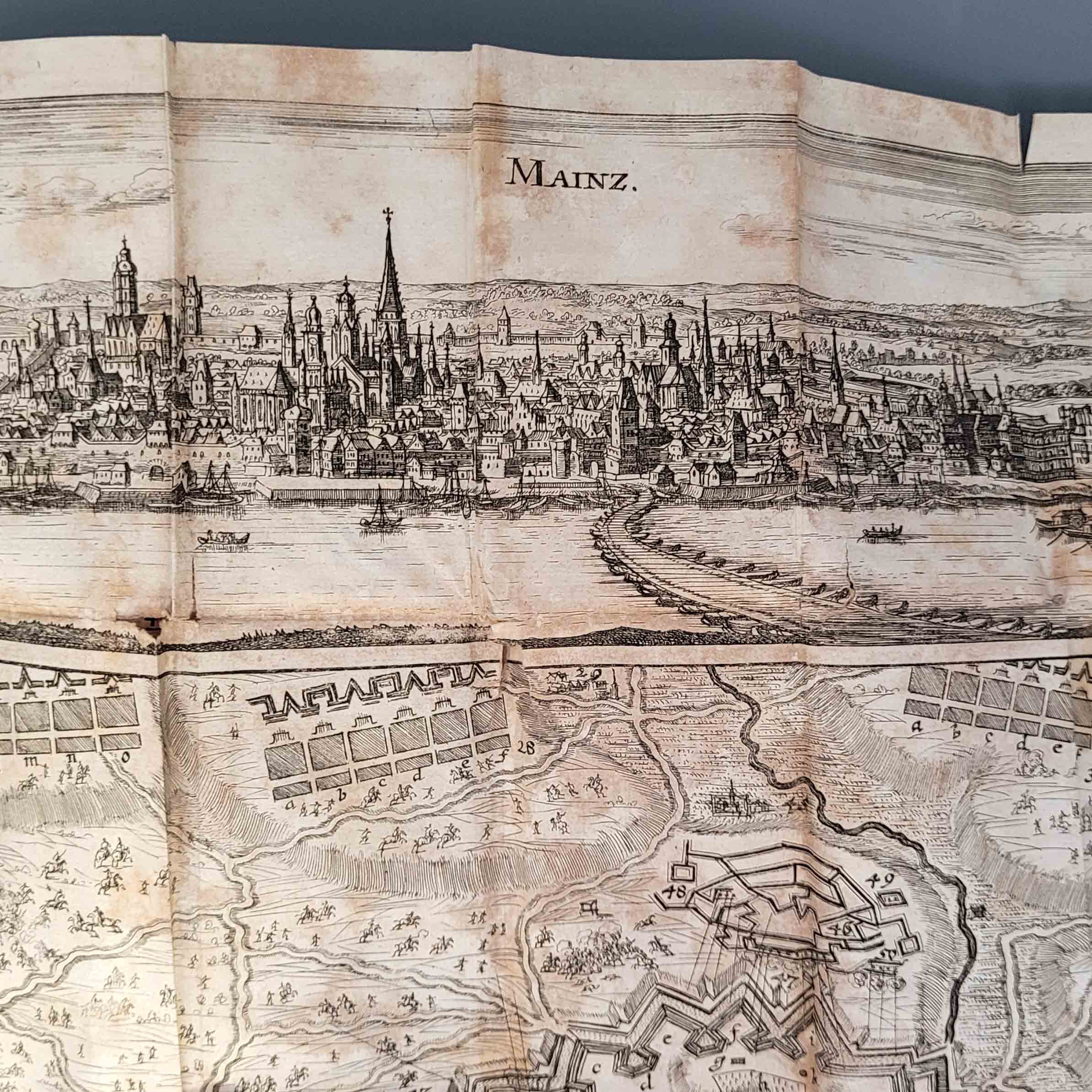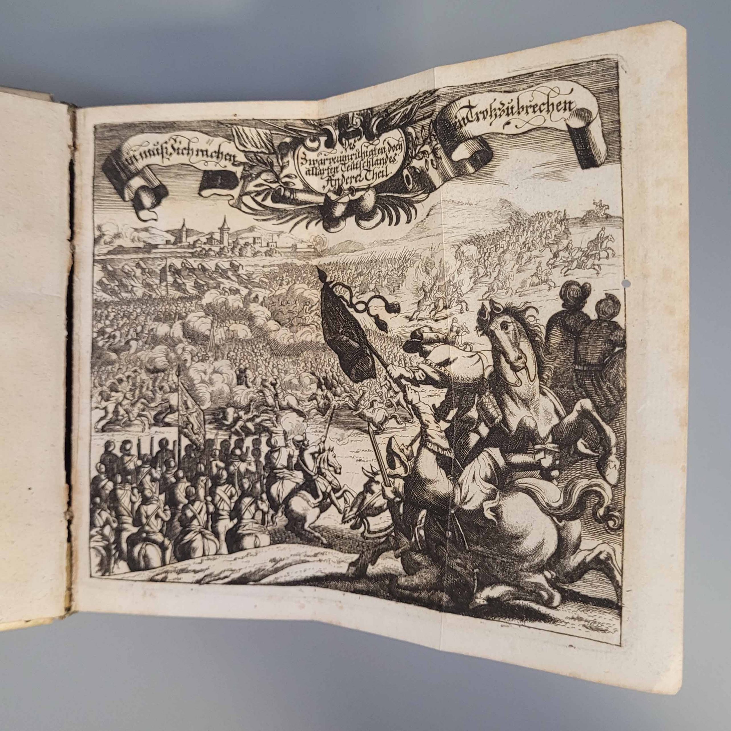 Vol 2 (von 8), Frankfurt / Leipzig (Chr. Riegel) 1690 (mit gefaltetem Kupfertitel, 2 gestochenen Porträts und 13 Kupfertafeln mit Stadt- und Ortsansichten Pergamenteinband der Zeit)