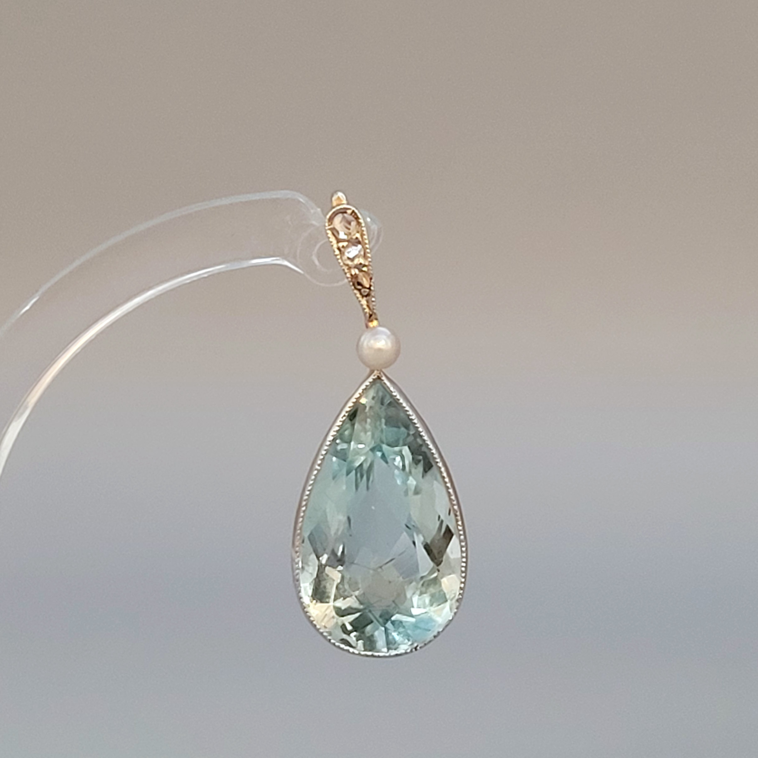Anhänger 585er Gelb- und Weißgold, Aquamarin, Perle (beschädigt), drei Diamantrosen, 3 x 1,1 cm, Gewicht 3g