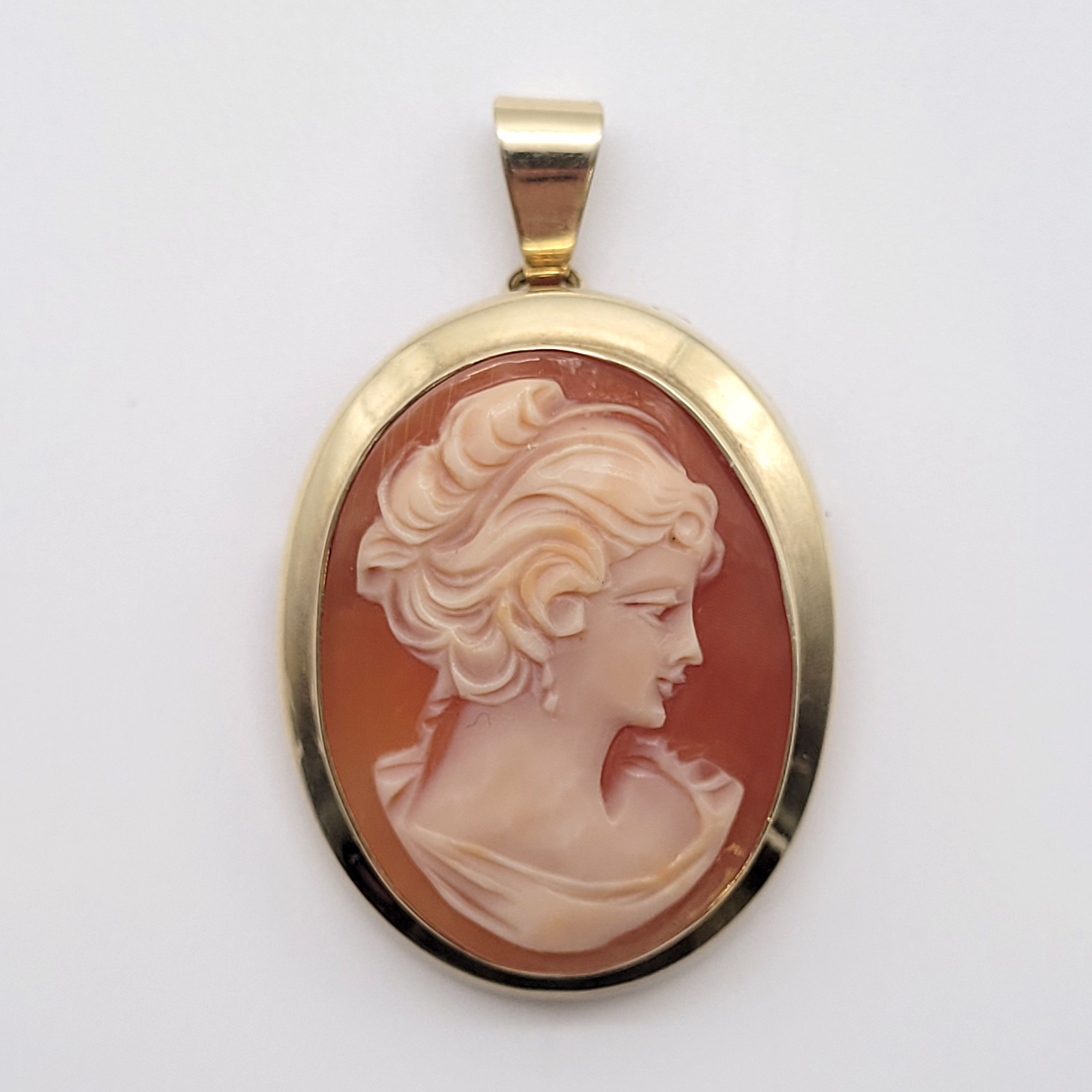 BroscheMuschel-Kamee mit Brustporträt einer jungen Frau, Fassung 585er Gelbgold, 3,5 x 2,5 cm (ohne Aufhänger), Gewicht ca. 9g