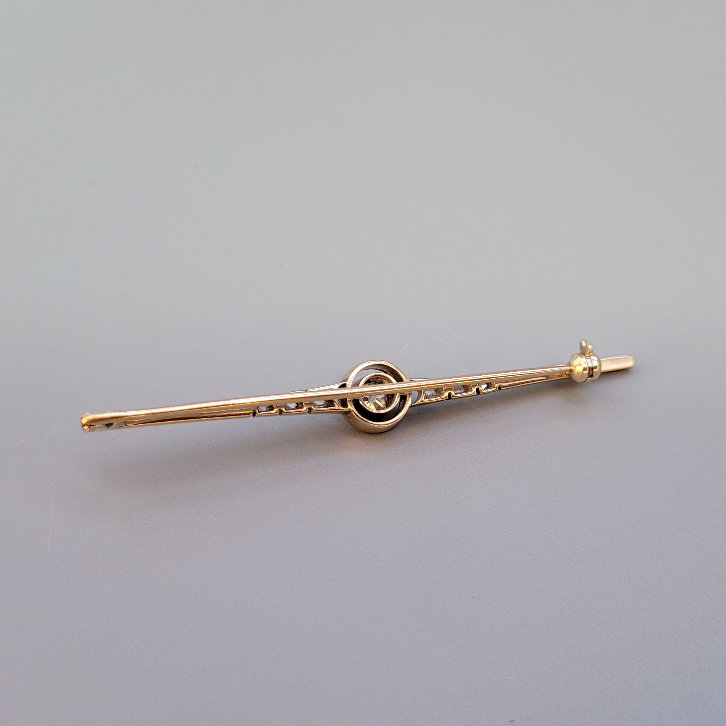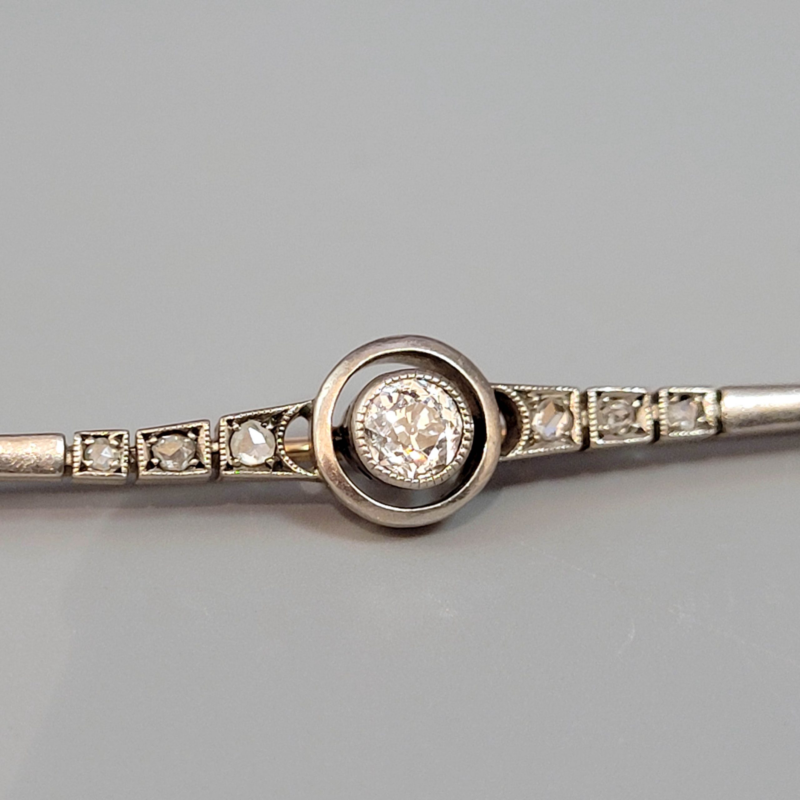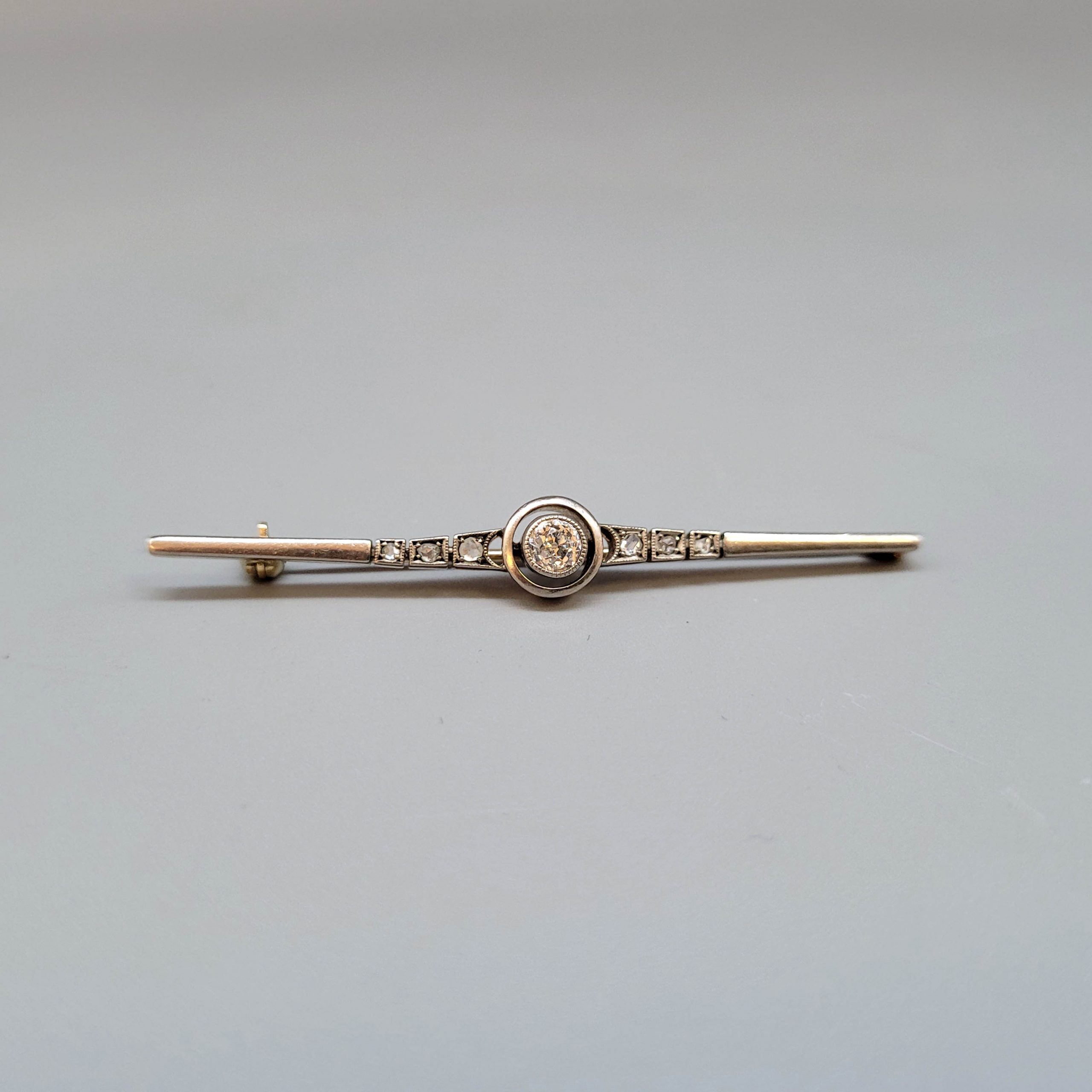 585er Gelbgold, Silberauflage, Brillant (ca. 0,40 ct) mit niedrigem Farb- und Reinheitsgrad, sechs Diamantrosen, Länge 6,5 cm, Gewicht ca. 4,5g