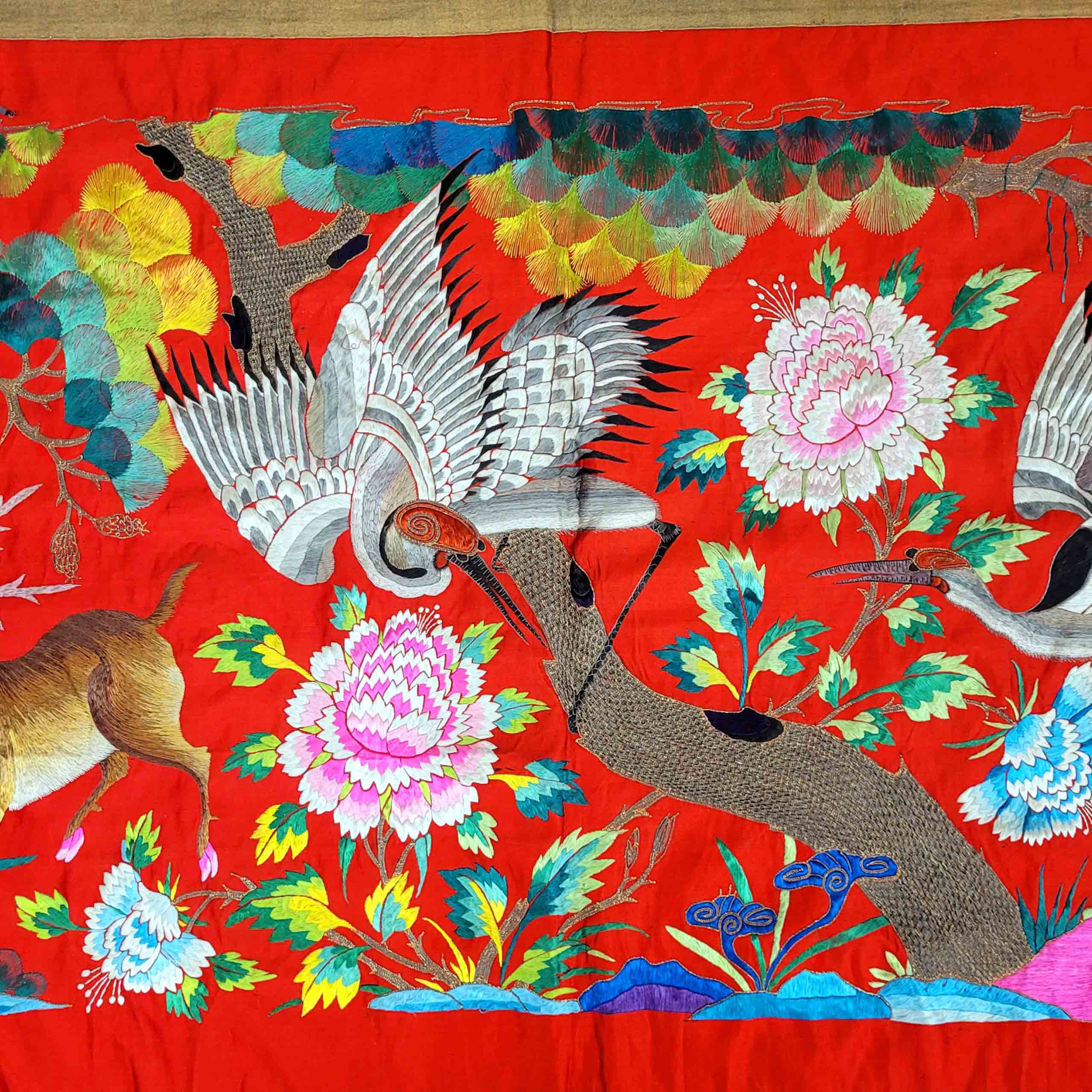 BehangSeide, Metallbroschierung, Metallpailletten, figürliche Stickerei mit Hirschen, Blumen und Kranichen, China, um 1920, 82 x 185 cm