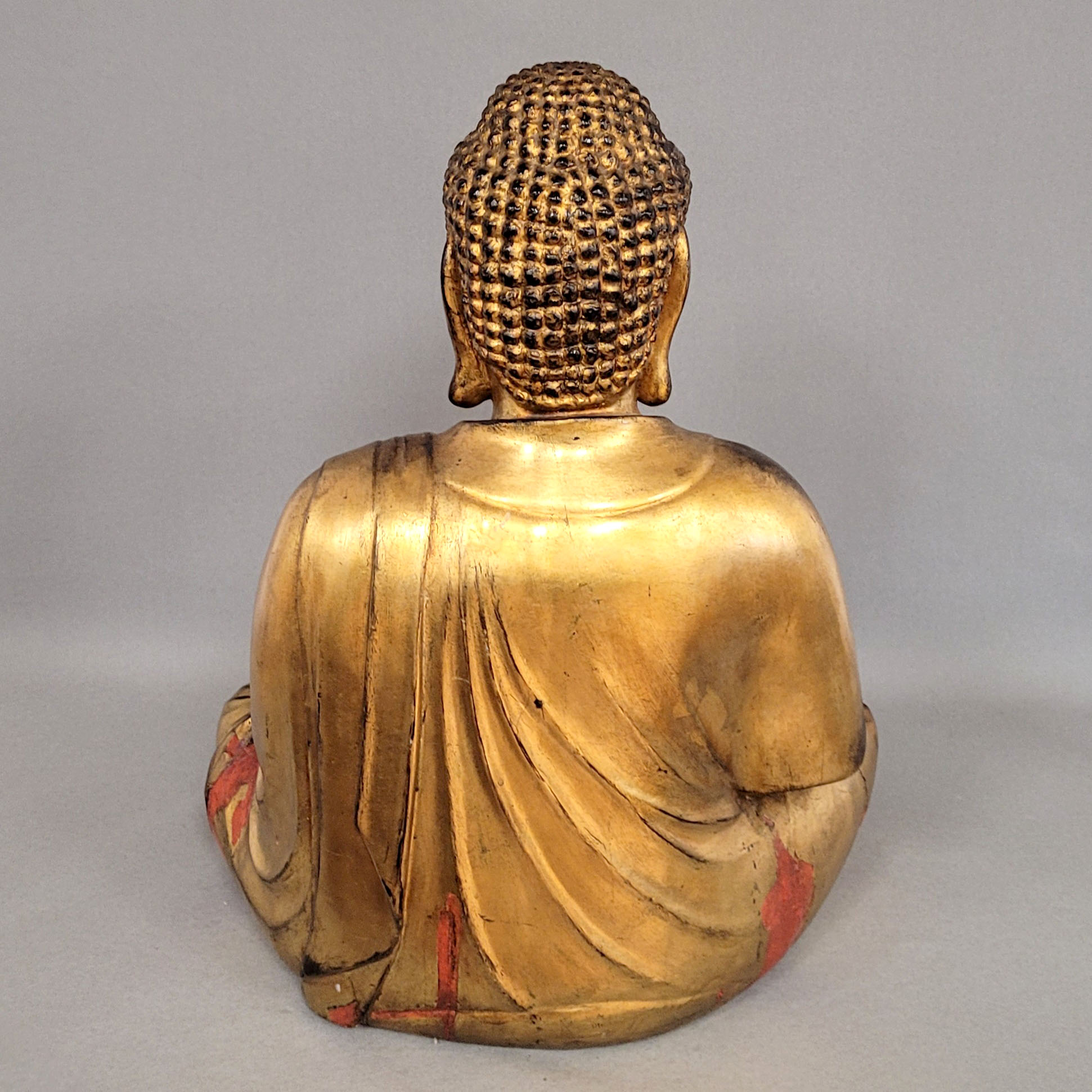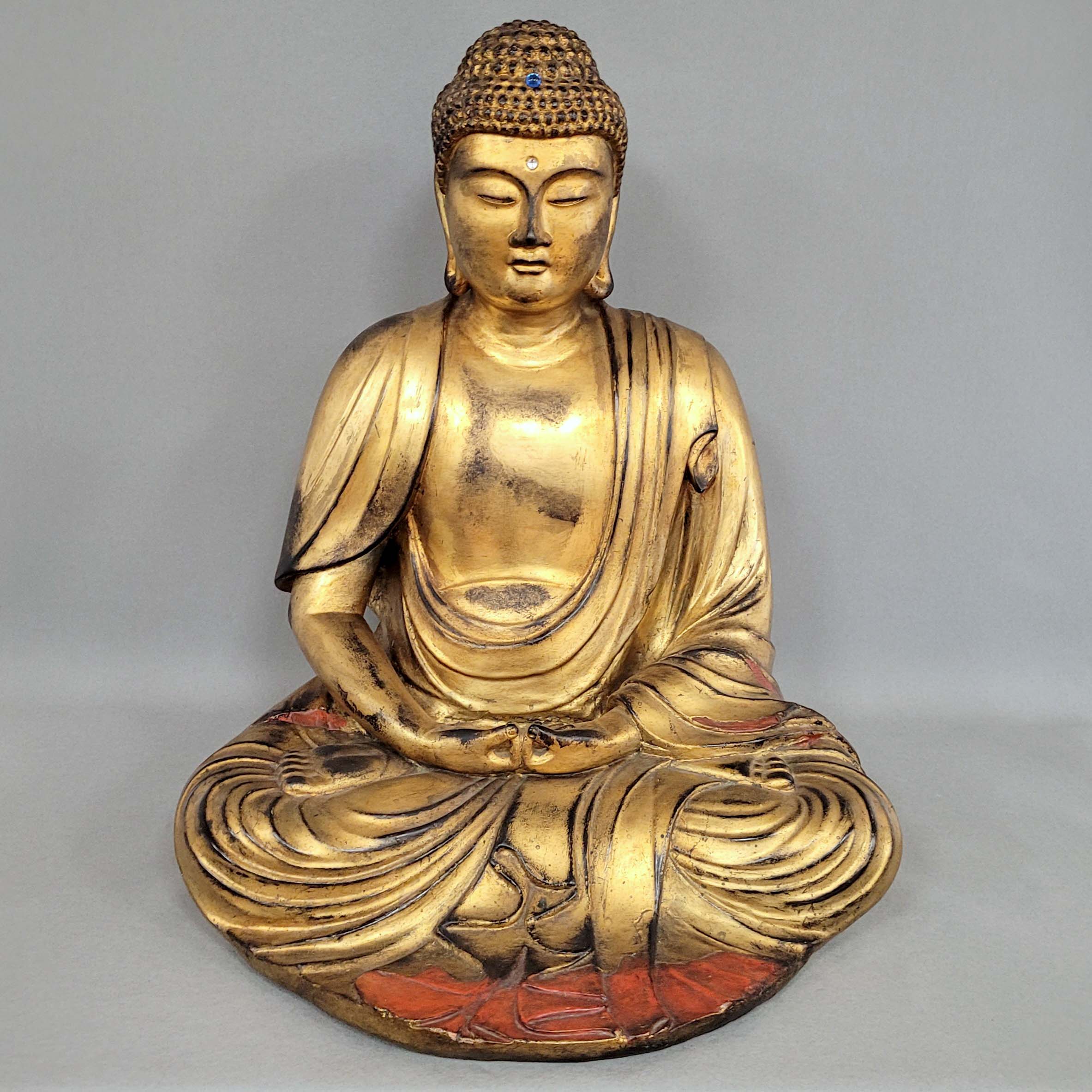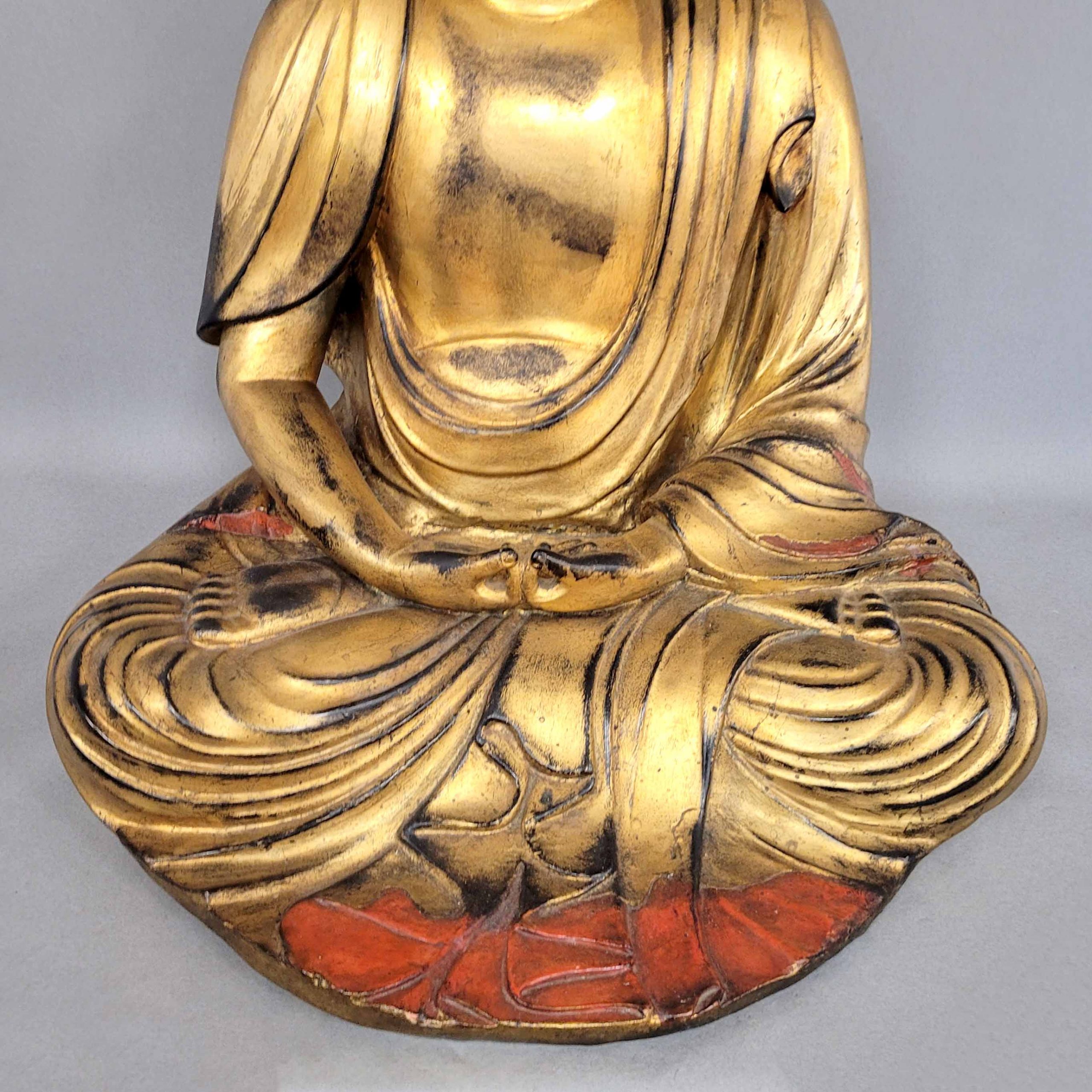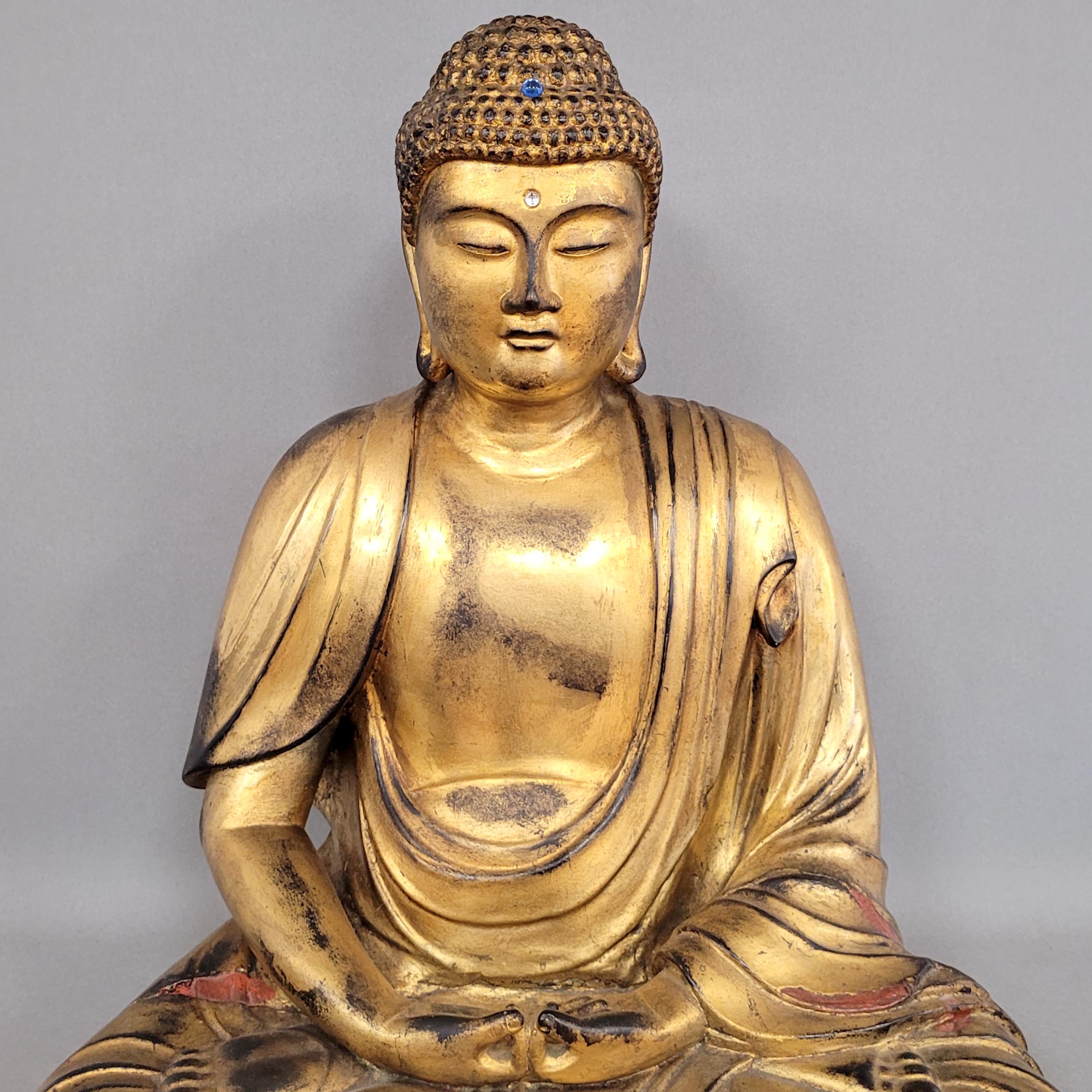 Buddha AmithabaHolz, vollrund geschnitzt, partiell rot lackiert und vergoldet, Steinbesatz, Japan, Meiji-Zeit, um 1900, Höhe 65 cm