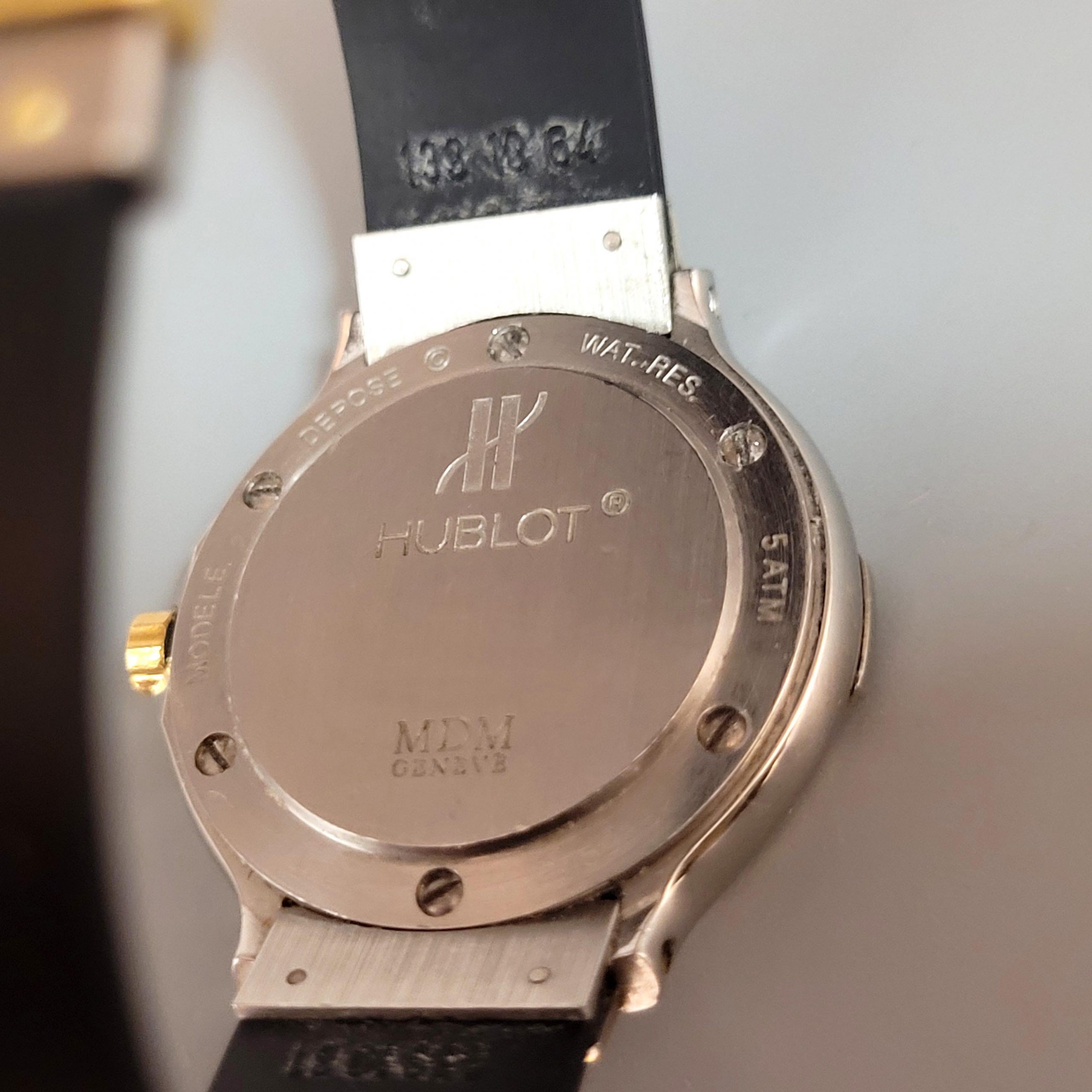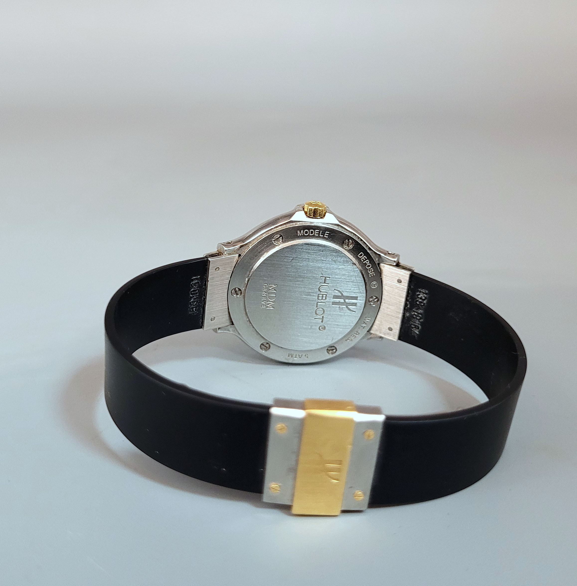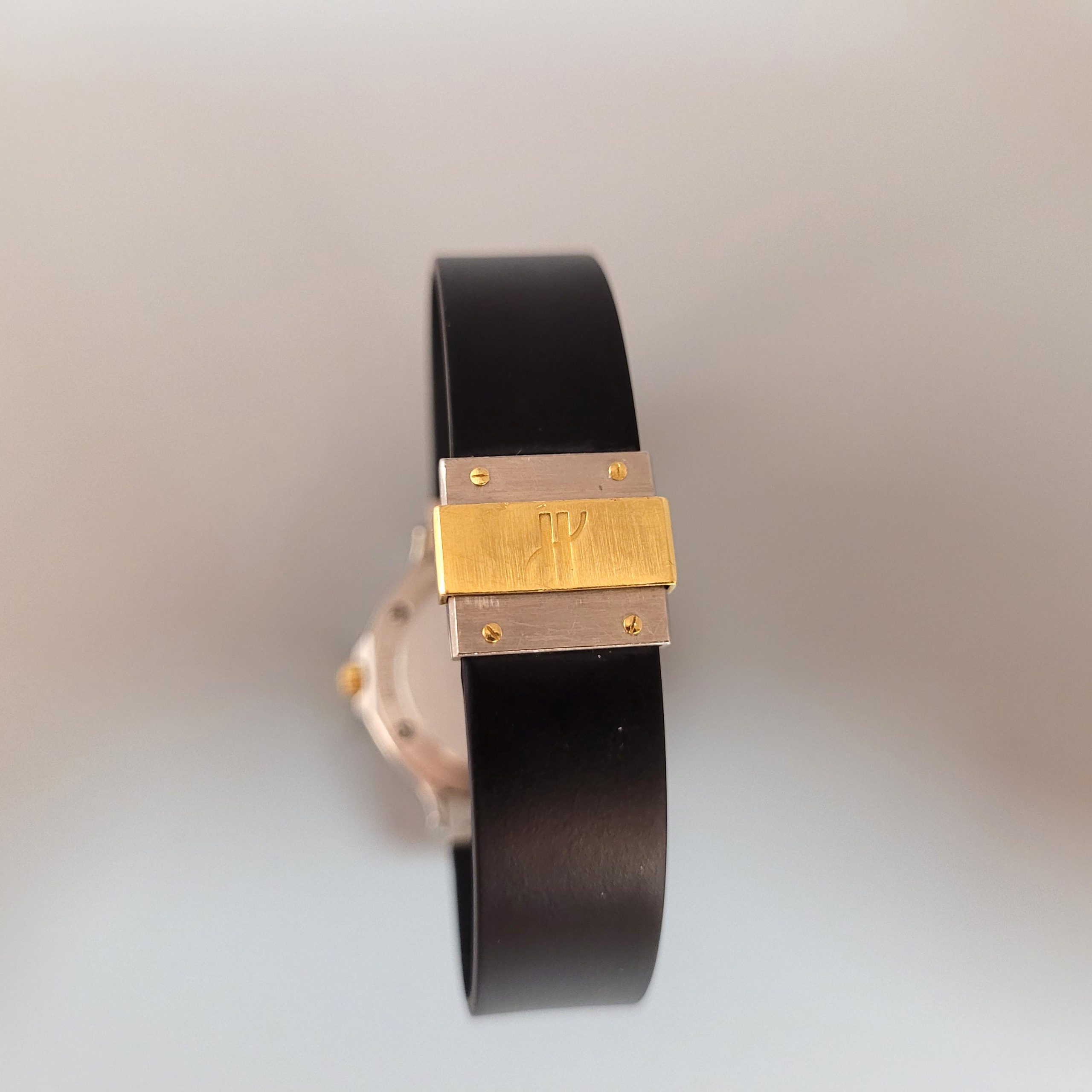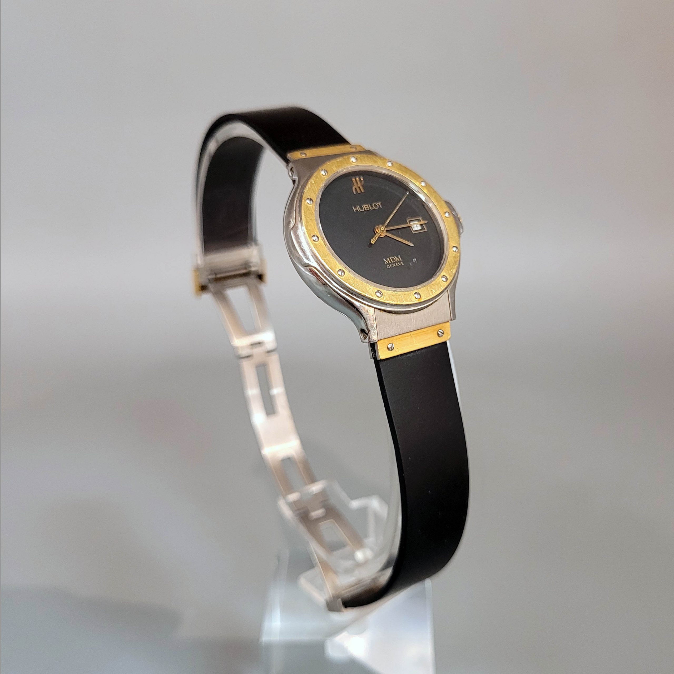 Gehäuse und Verschluss aus Edelstahl/Gelbgold, schwarzes Zifferblatt, Sekundenzeiger, Datumsanzeige, Kautschukband mit Faltschließe, Seriennr. 245988, Quartzwerk mit neuer Batterie, Durchmesser ohne Krone ca. 2,8 cm (Gebrauchsspuren, kleine Beschädigung am Glas)