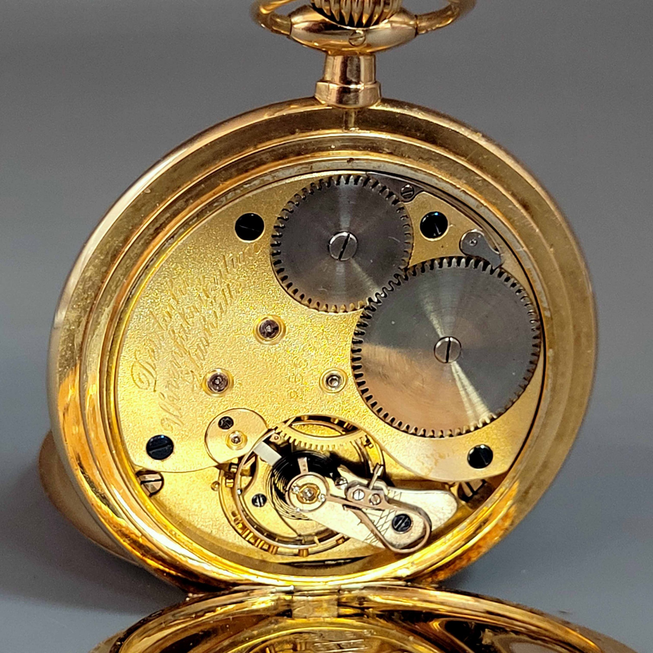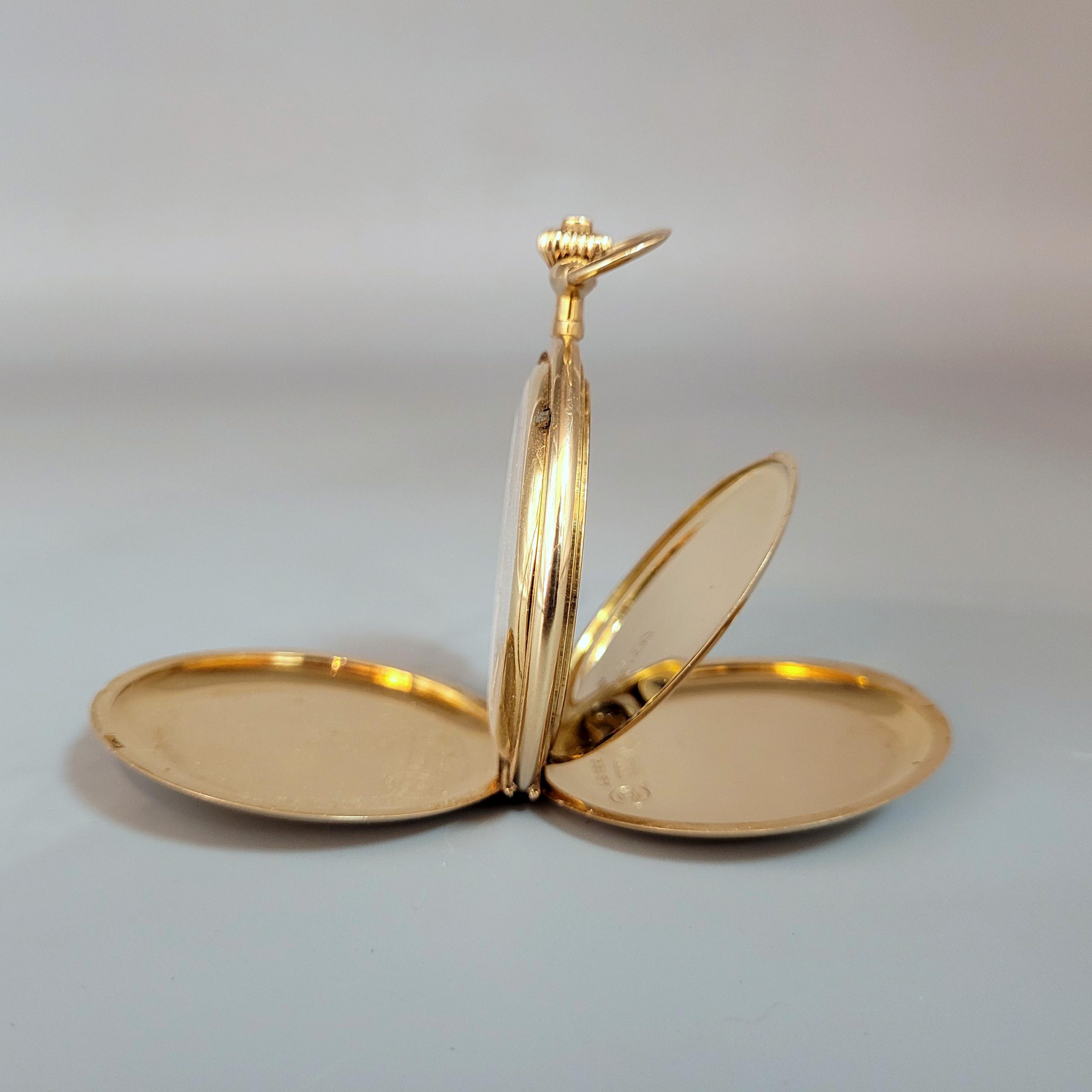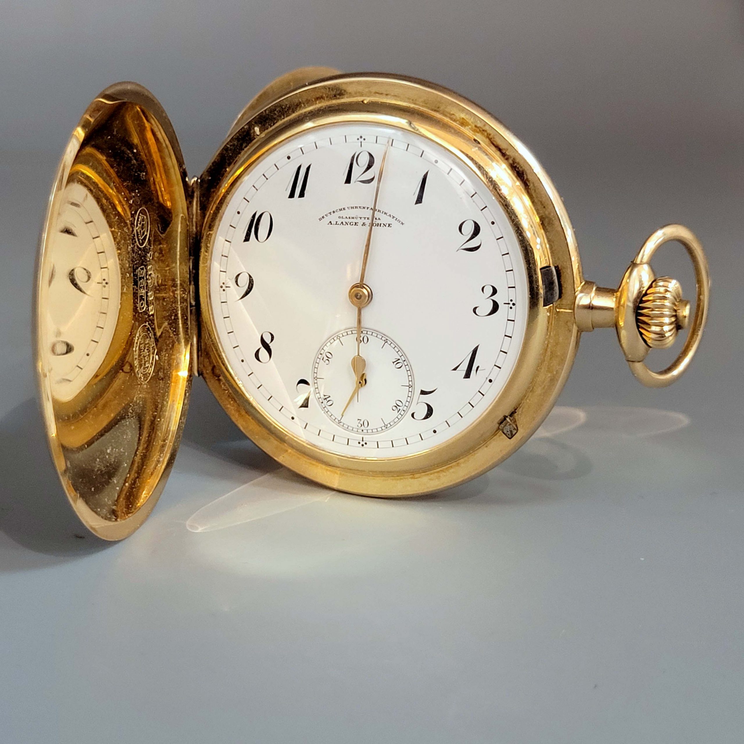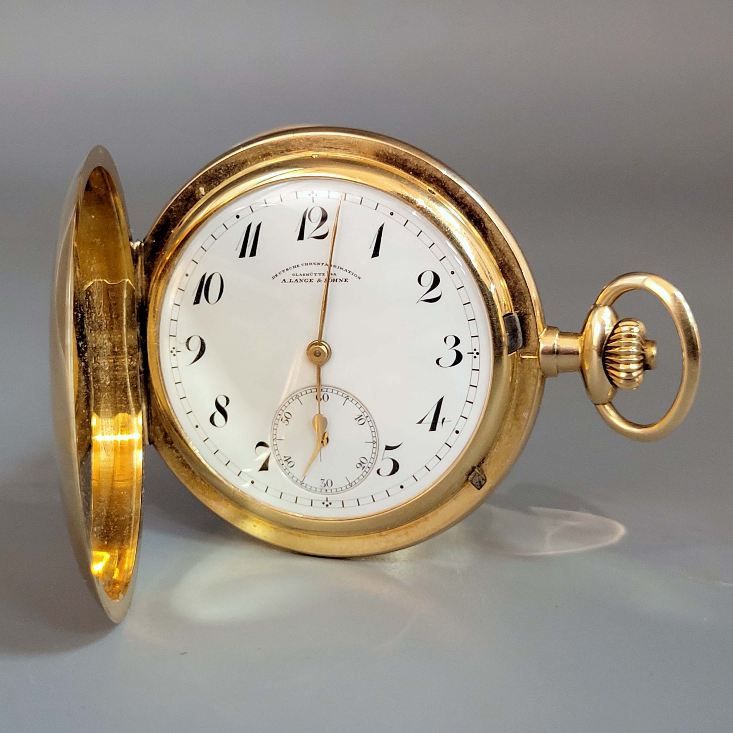 Gehäuse, Staubdeckel, Krone, Ring 585er Gelbgold, Emaille-Zifferblatt mit arabischer Stundenanzeige und Minutenbalken, Sekundenanzeige, Handaufzug, Staubdeckel bezeichnet „Alfred Durst 3. Mai 1925“, Originaletui, Durchmesser ohne Krone 5,1 cm, Gewicht ca. 84g