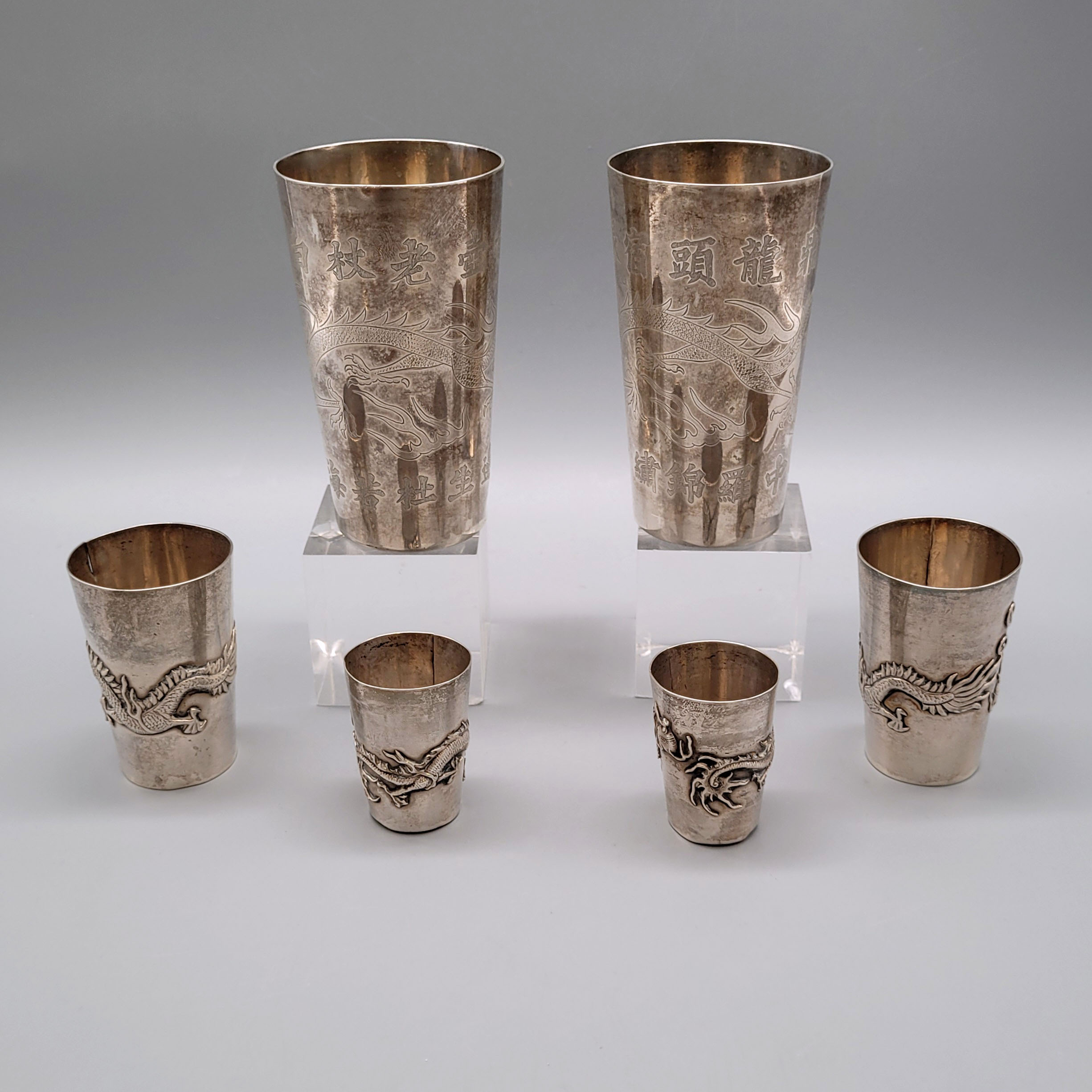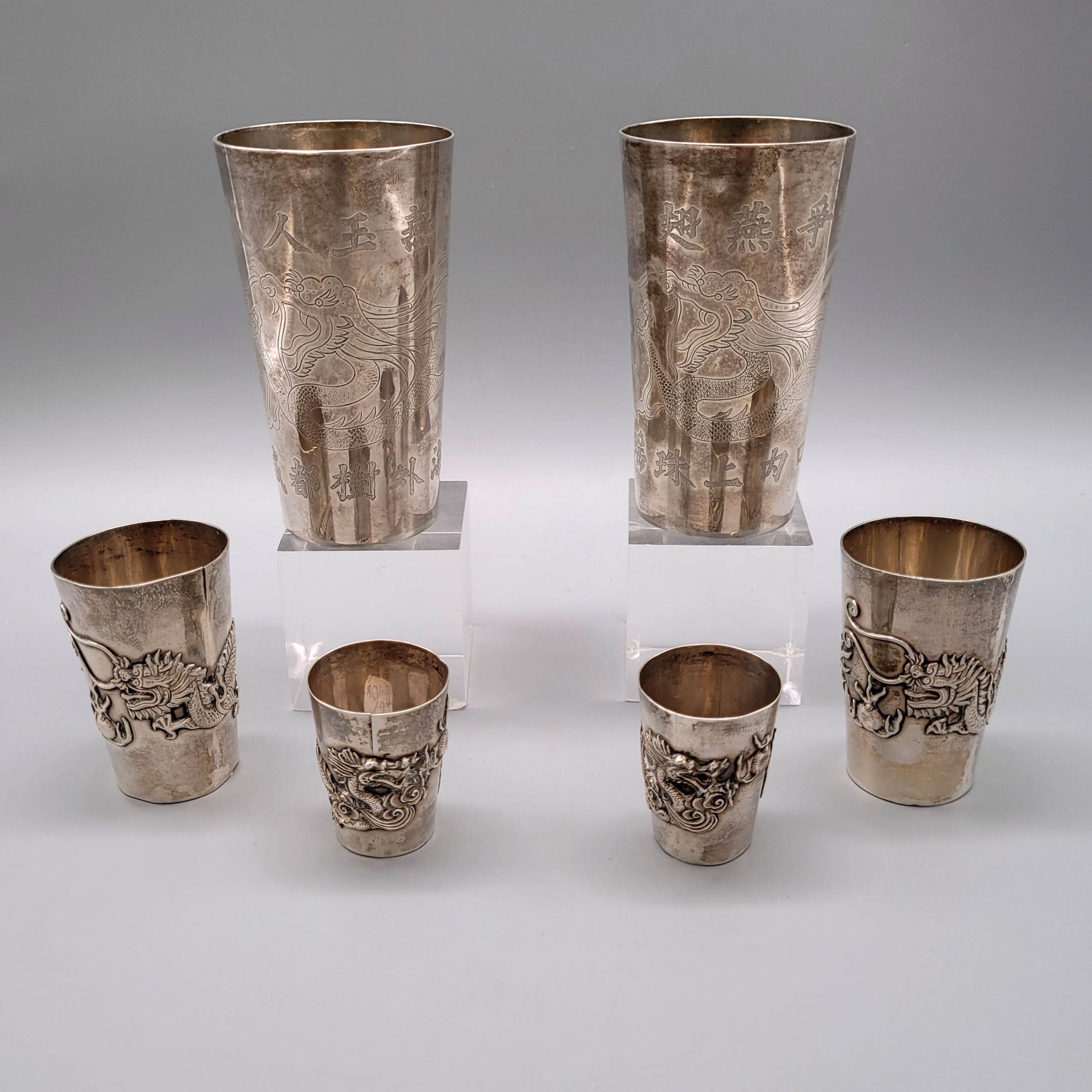 Sechs Becher mit DrachendekorSilber, bodenseitig gemarkt, insgesamt drei Paare, China, um 1900, Höhe bis zu 10 cm, Gewicht 265g (zwei Becher mit Riss, Gebrauchsspuren, kleine Dellen)