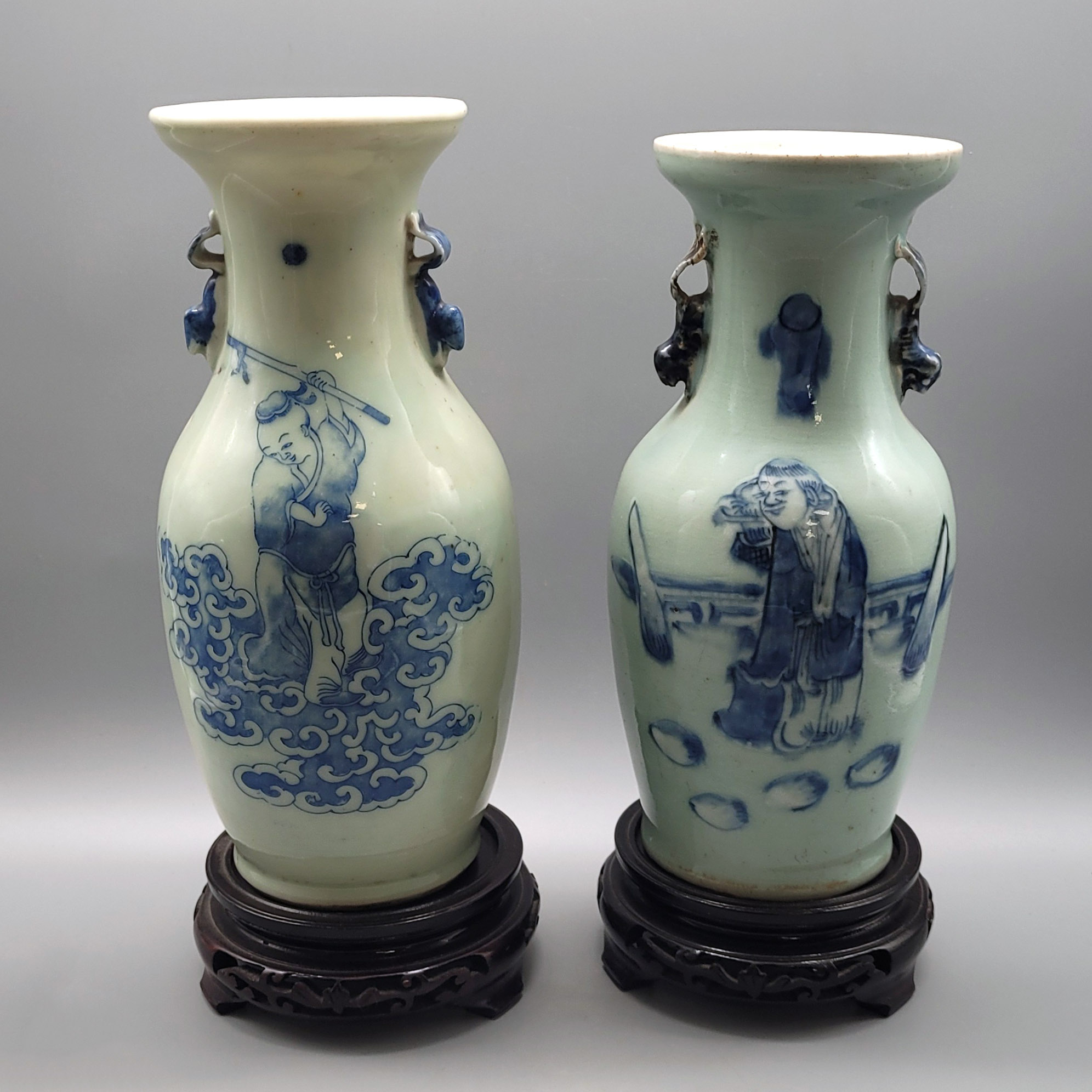 Zwei VasenPorzellan, Griffe in Form von Fo-Hunden, Blau-weiß-Malerei mit „Hehe Er Xian-Brüdern“ auf Seladongrund, beide mit roten Stempelaufdrucken, China, um 1900, Höhe 24 bzw.25,5 cm (ohne Holzaufsteller)