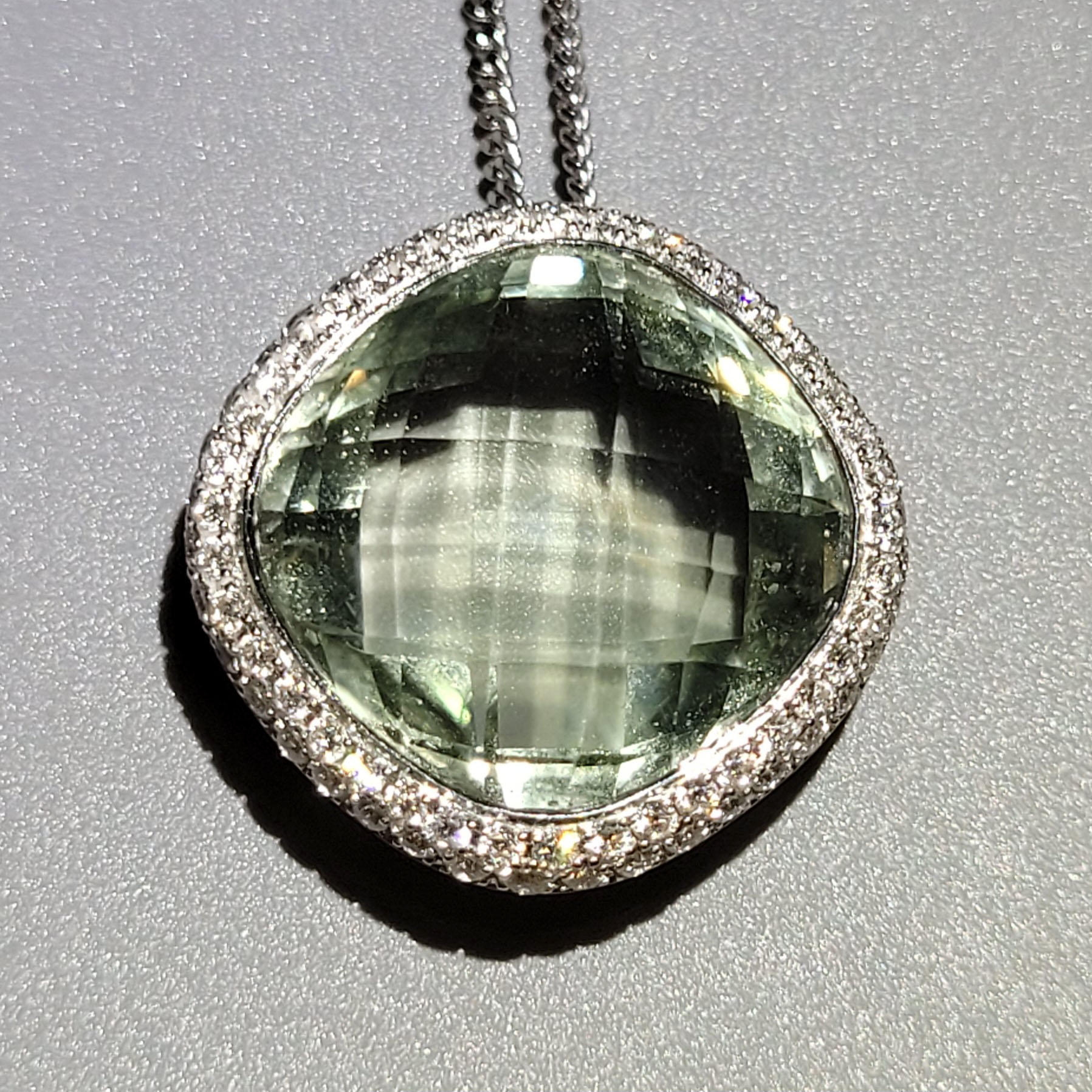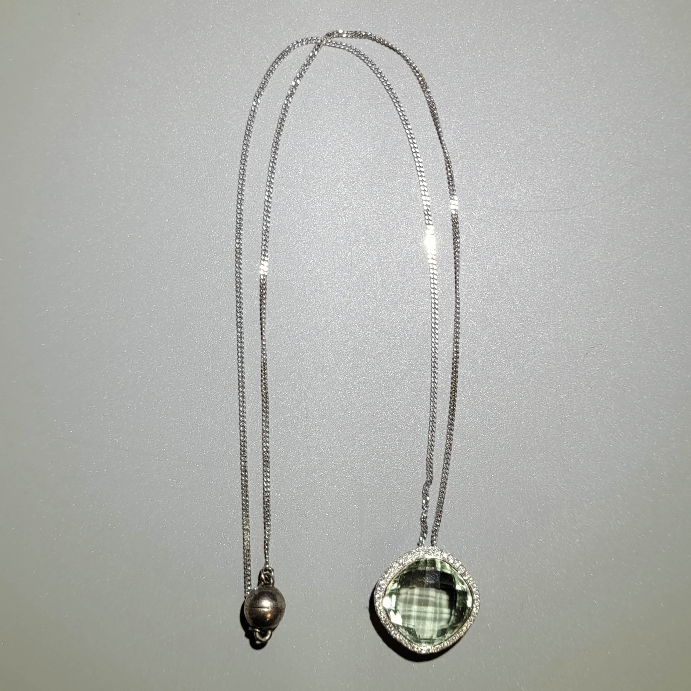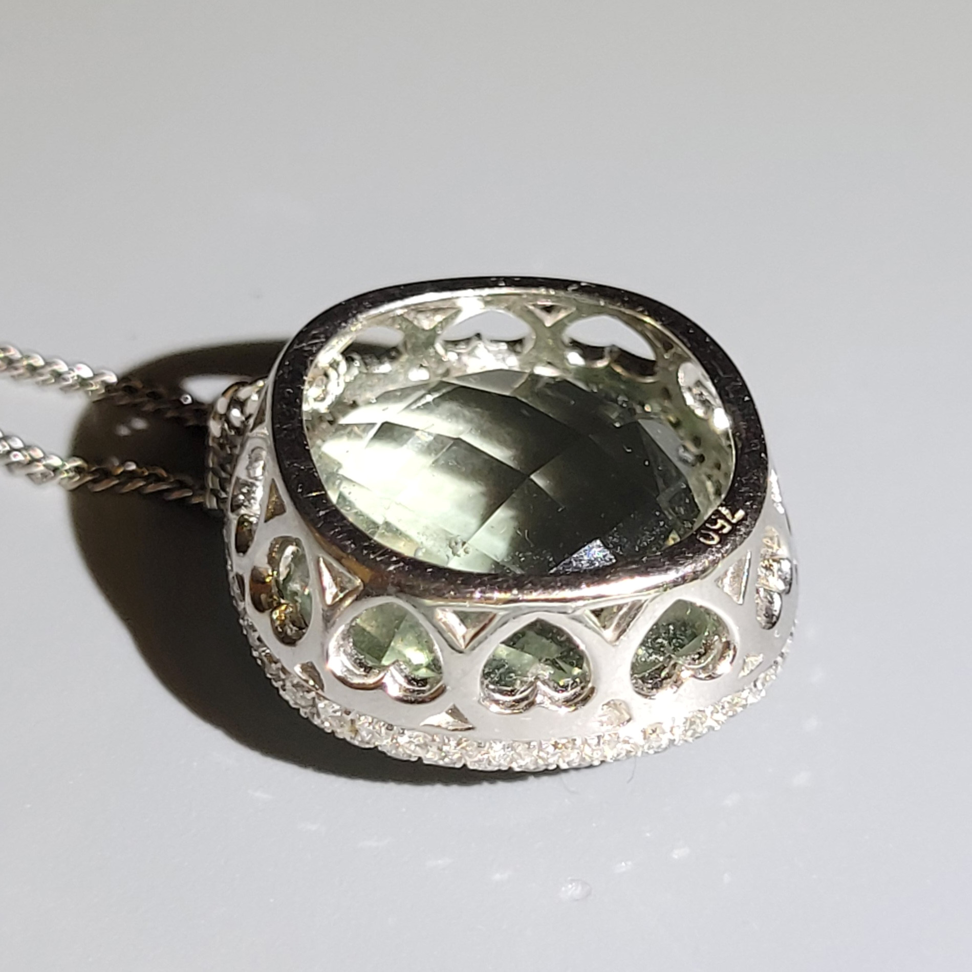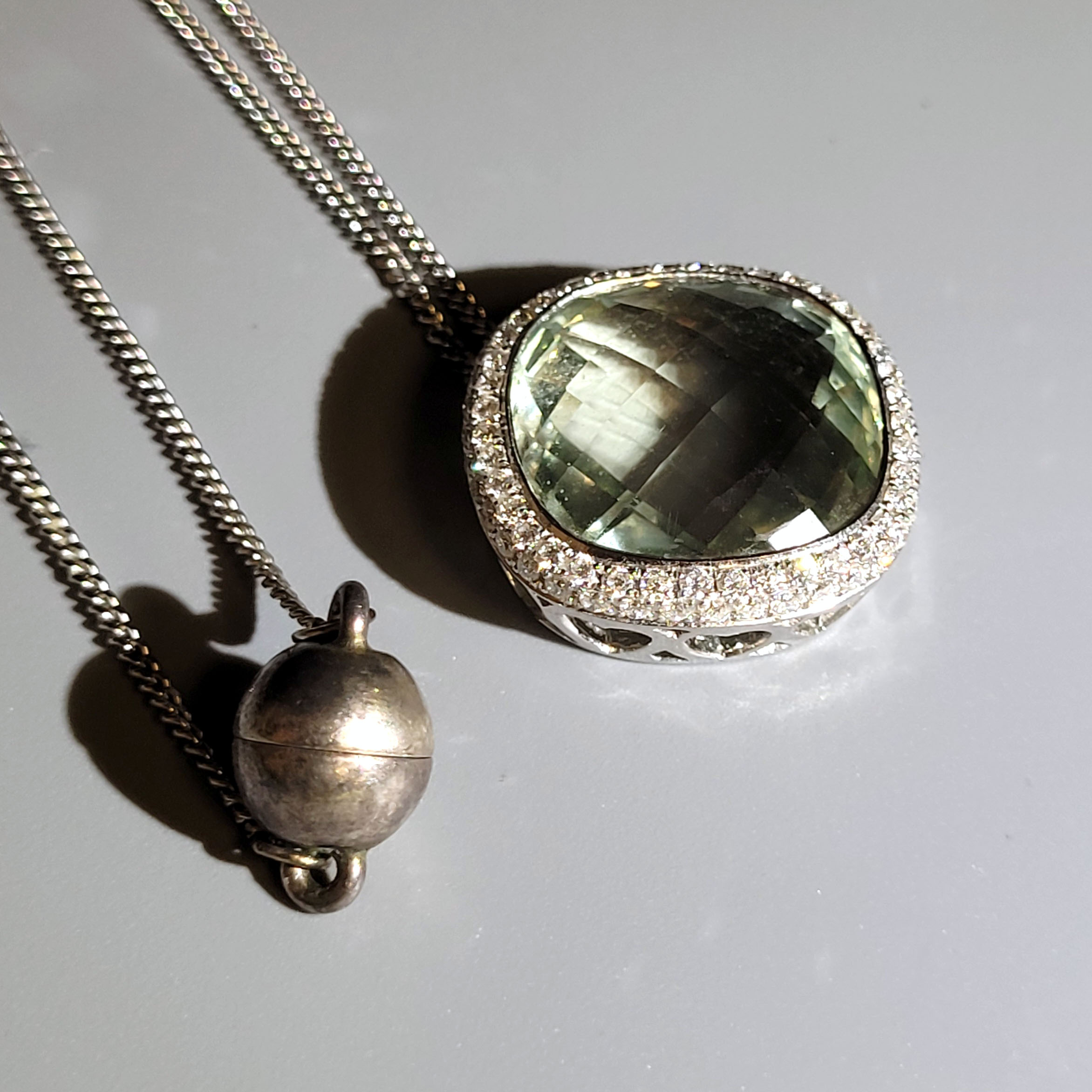 Anhänger, 750er Weißgold, „grüner Amethyst“, zweireihig angeordnete Brillanten (ca. 0,75 ct), 2 x 2 cm,, Kette, 585er Weißgold, Magnetverschluss, Länge 24 (48) cm, Gewicht ca. 12,5g