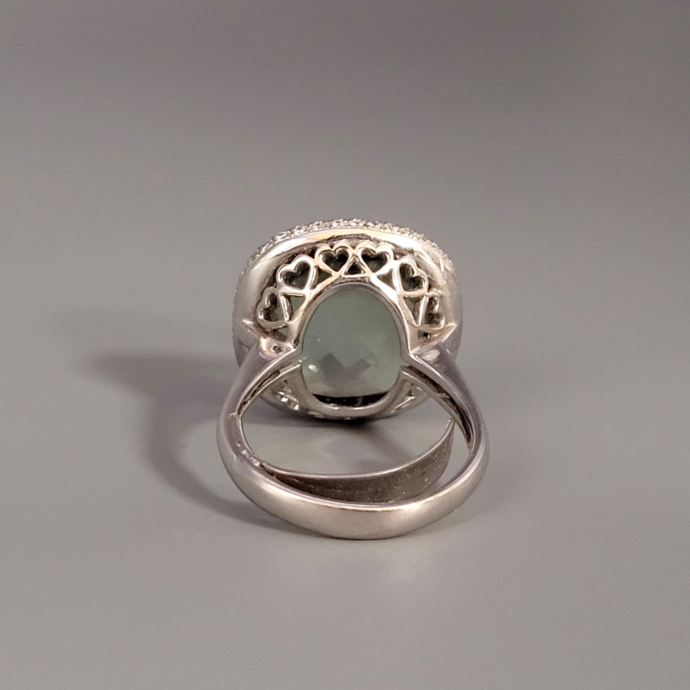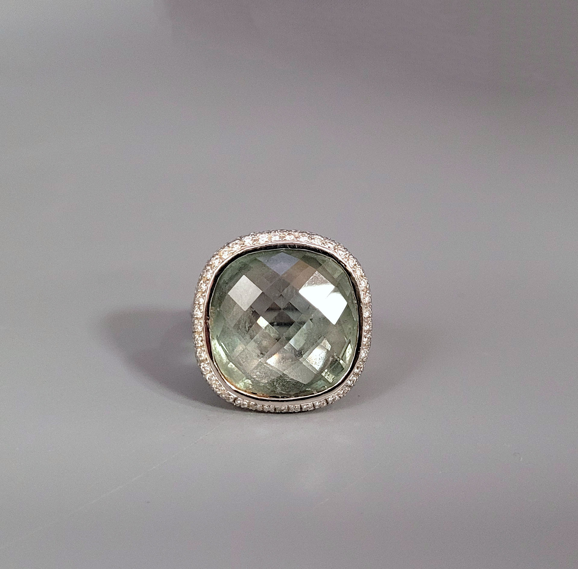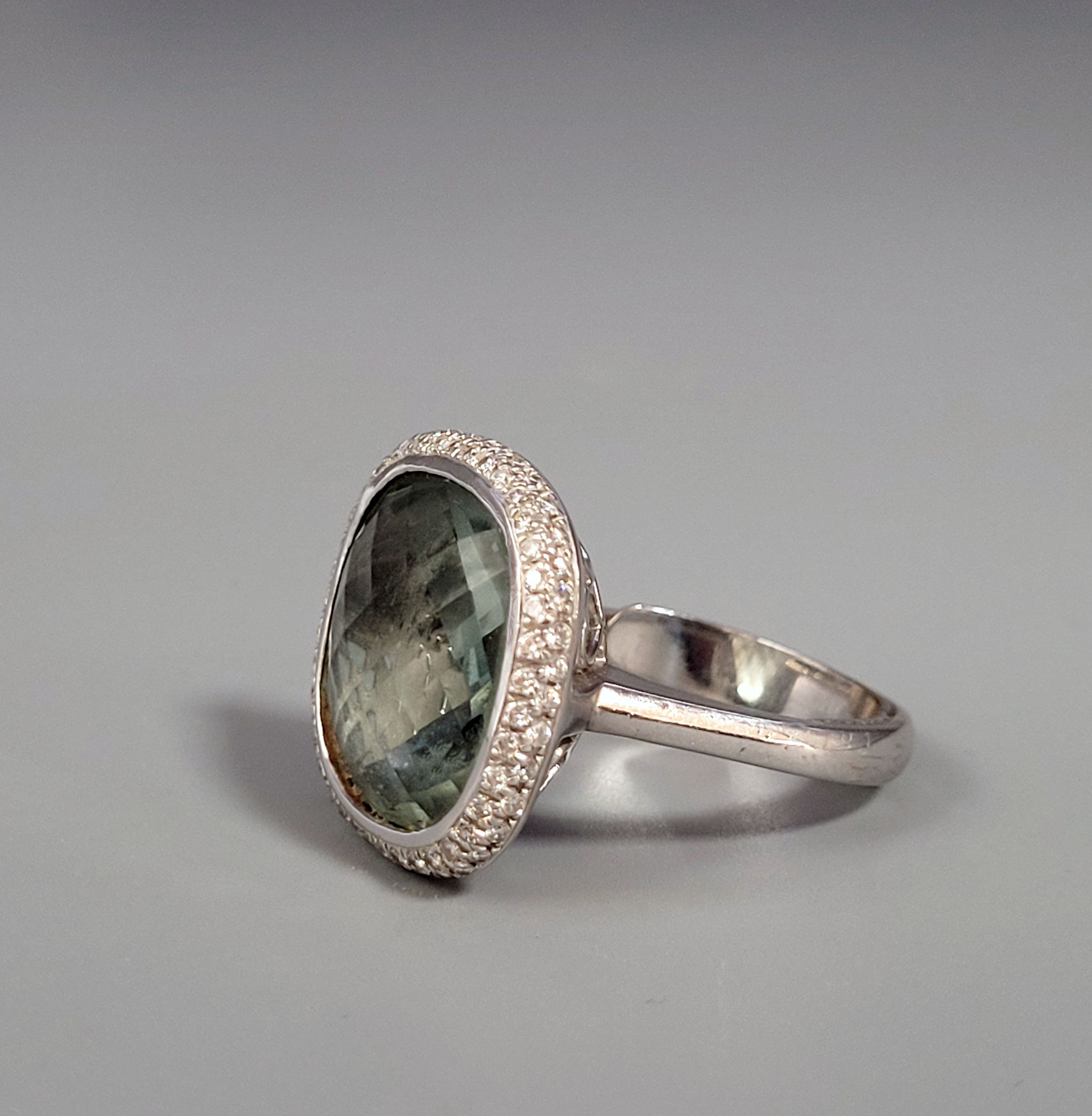 Damenring 750er Weißgold, Schiene mit Einsatz, „grüner Amethyst“, zweireihig angeordnete Brillanten (ca. 0,70 ct), Ringgröße 58, Gewicht ca. 13,5g