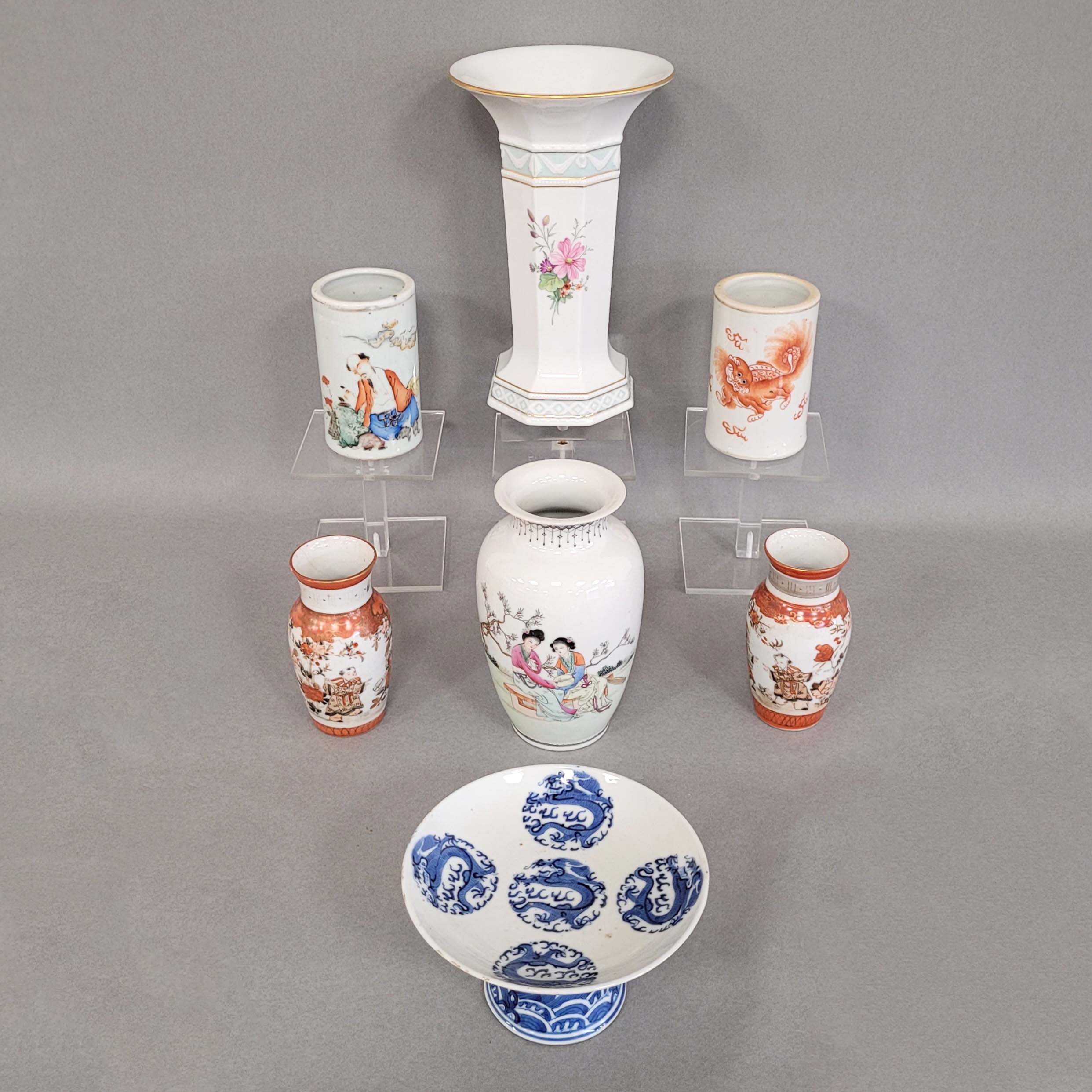 Konvolut Vasen und eine SchalePorzellan, figürlich polychrom bemalt, Schale mit Bau-weiß-Malerei mit Drachendekor, zumTeil bodenseitig gemarkt, China 19./20. Jahrhundert, Höhe bis zu 17 cm (Gebrauchsspuren)