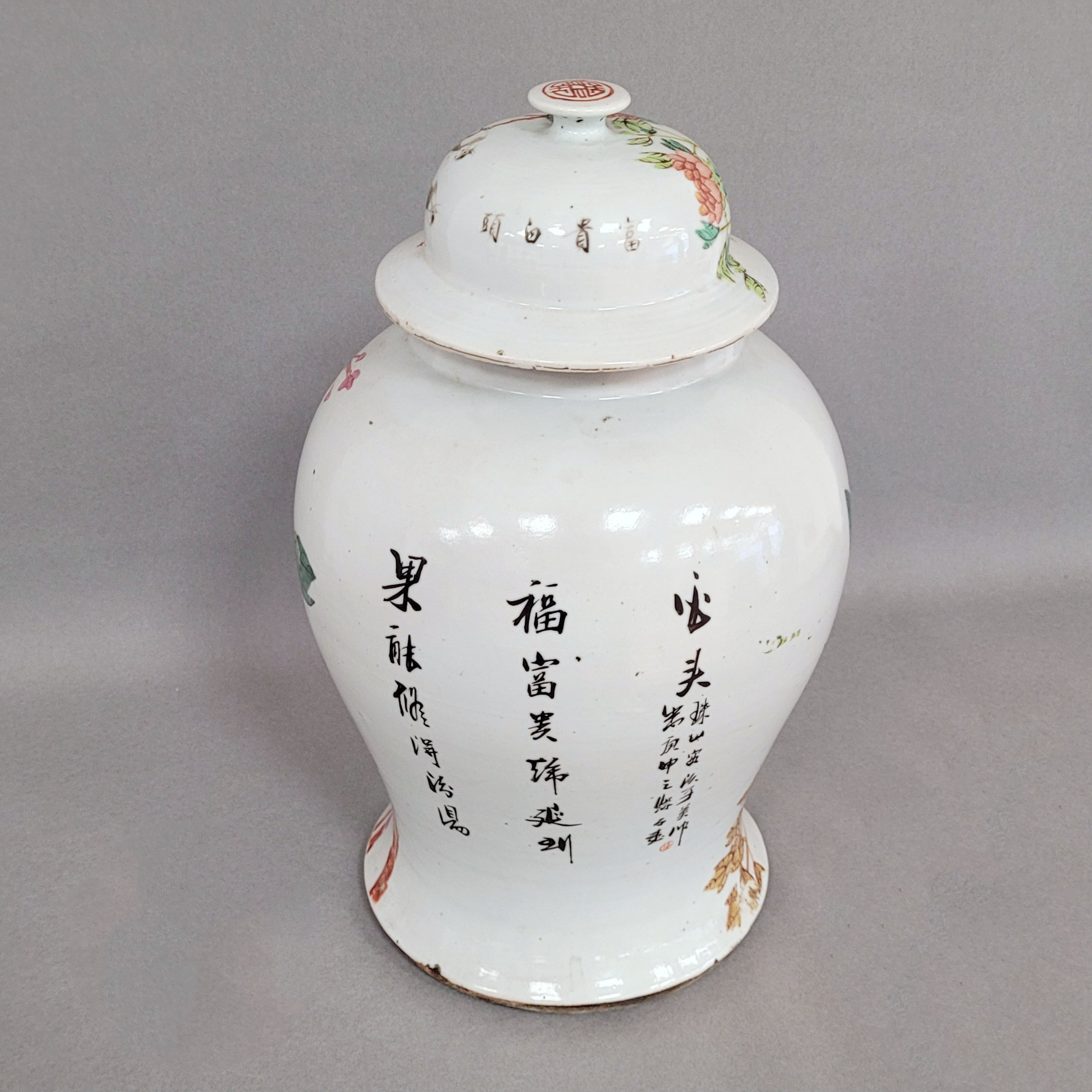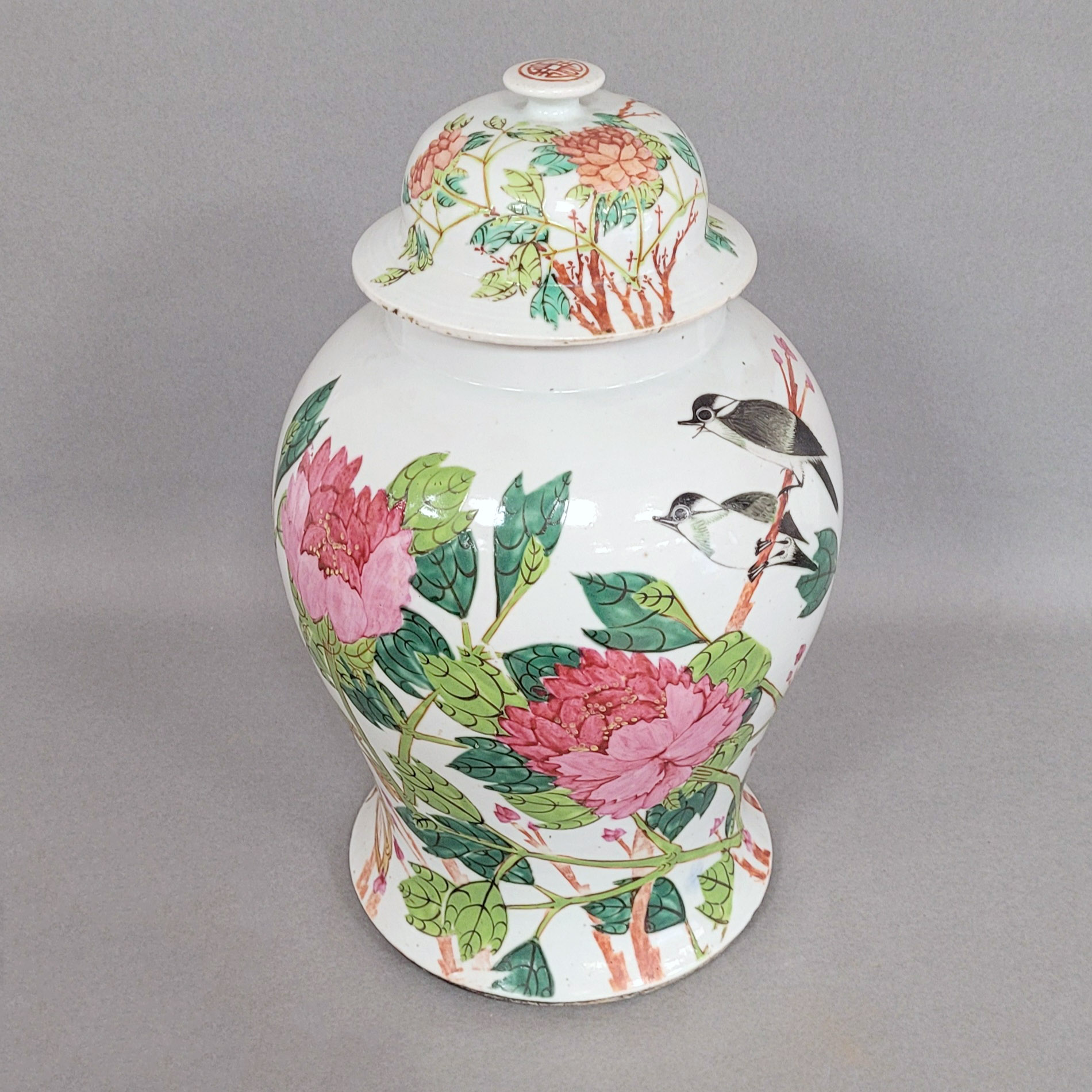 DeckelvasePorzellan, polychrome Blumenmalerei in Aufglasur mit Vögeln, Inschriften, China um 1900, Höhe 43 cm