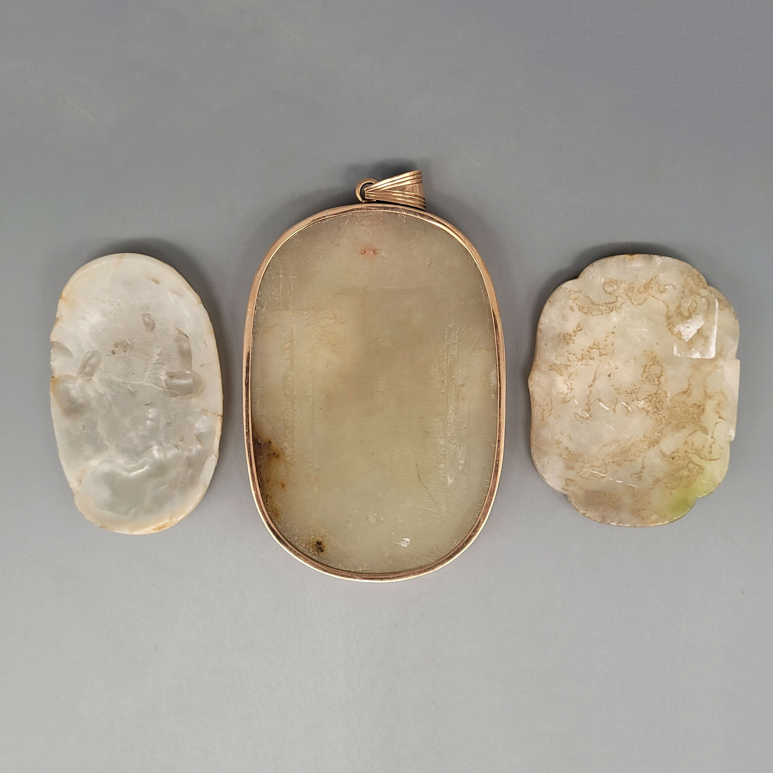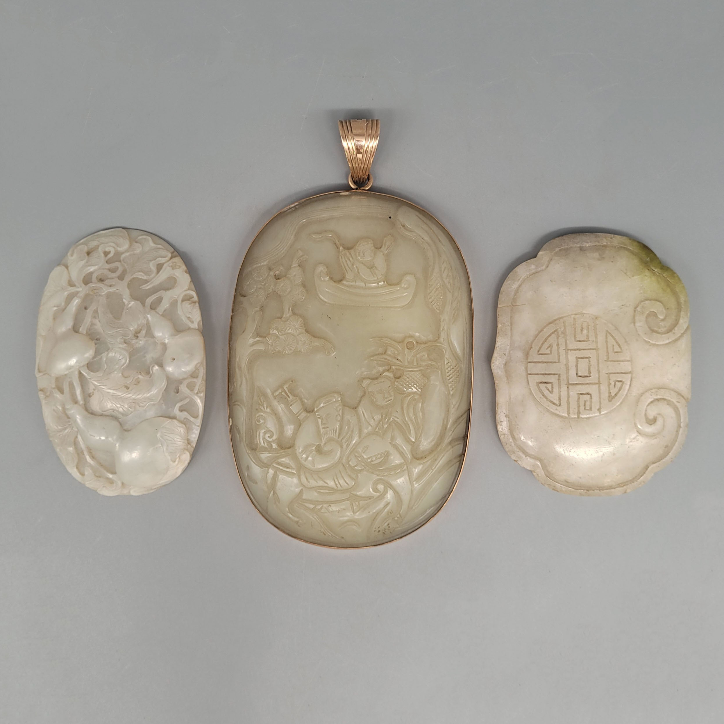 Drei JadeschnitzereienAnhänger mit figürlicher Szene, Einfassung 750er Gelbgold, 11 x 7,5 cm (ohne Anhängeröse) Platte mit Lotusdekor, 8 x 5,2 cm Platte mit shou-Symbol, 6 x 8 cm, China 19./20. Jahrhundert