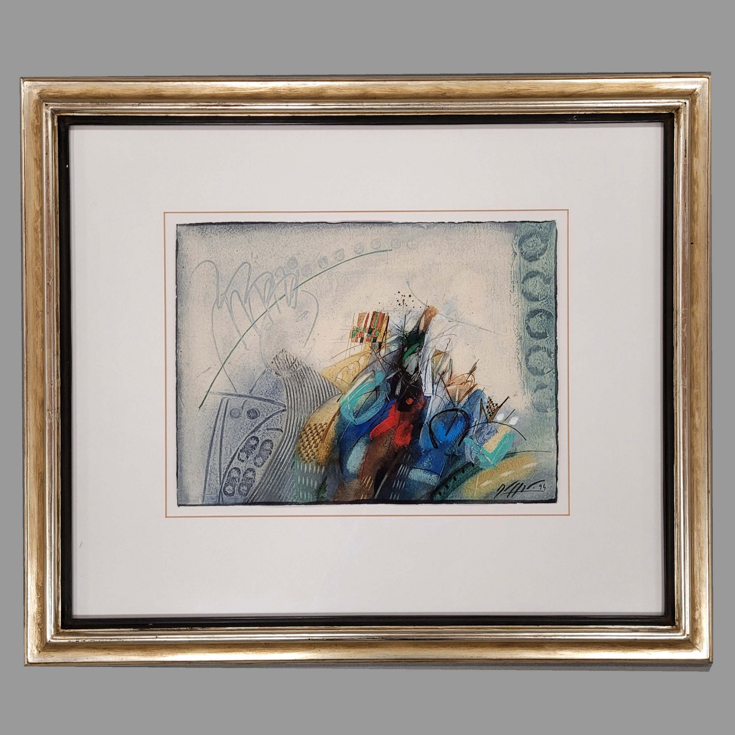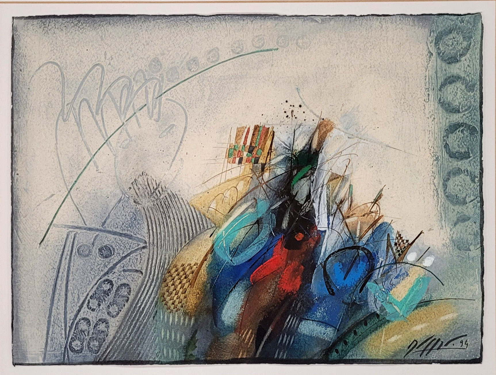 DUSSAU, Georges (*1947): Ohne TitelMischtechnik auf Papier, signiert und datiert (19)94 unten rechts, 28 x 38 cm, gerahmt unter Glas und Passepartout**) Bei einem Zuschlag über 400€ werden 2% für VG Bild gemäß §26 UrHG erhoben