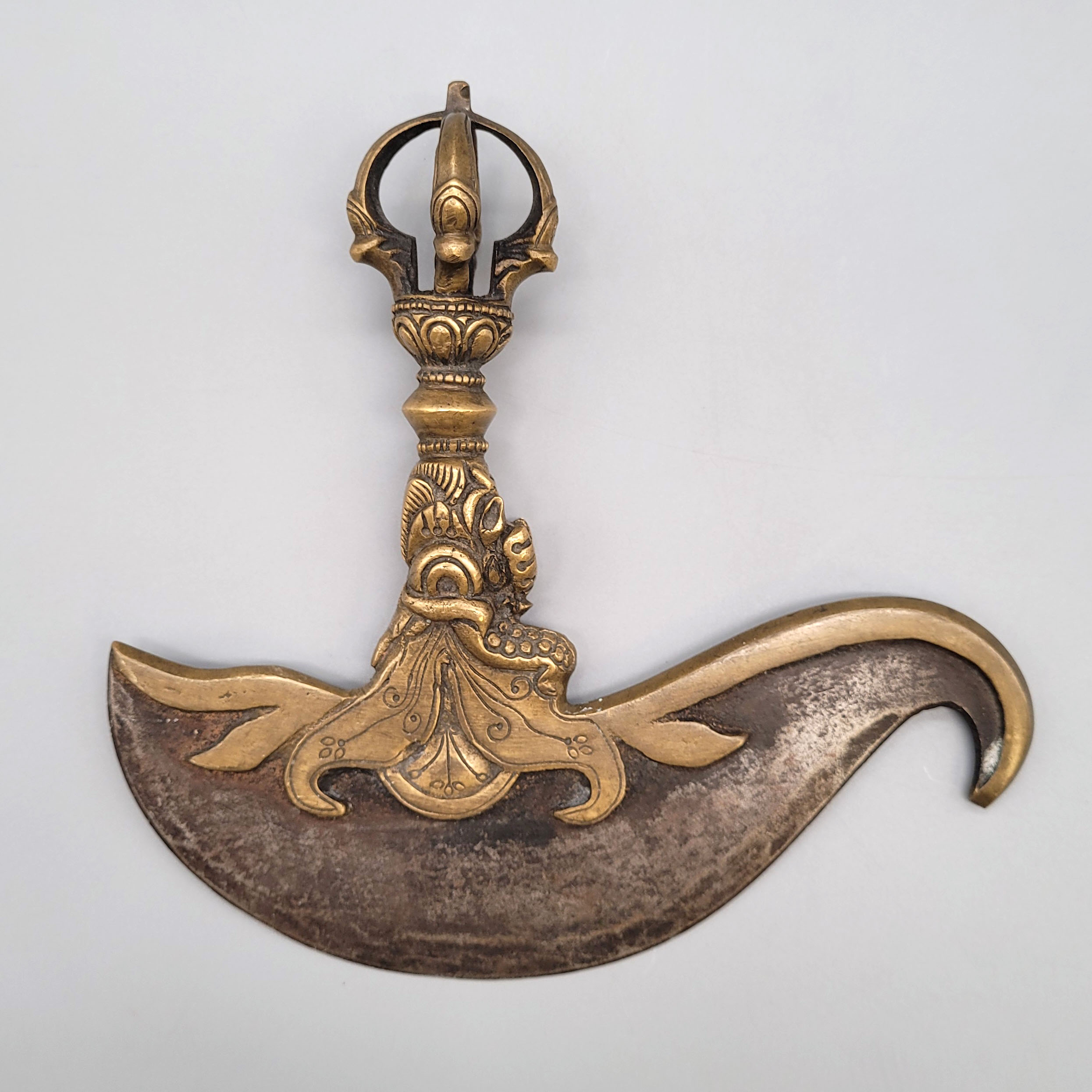 Grigugkonvexe Klinge Eisen, Parierelement und Knauf Messing, Nepal 19. Jahrhundert, Höhe 16,5 cm, Länge Klinge 16,5 cm, Gewicht 381g
