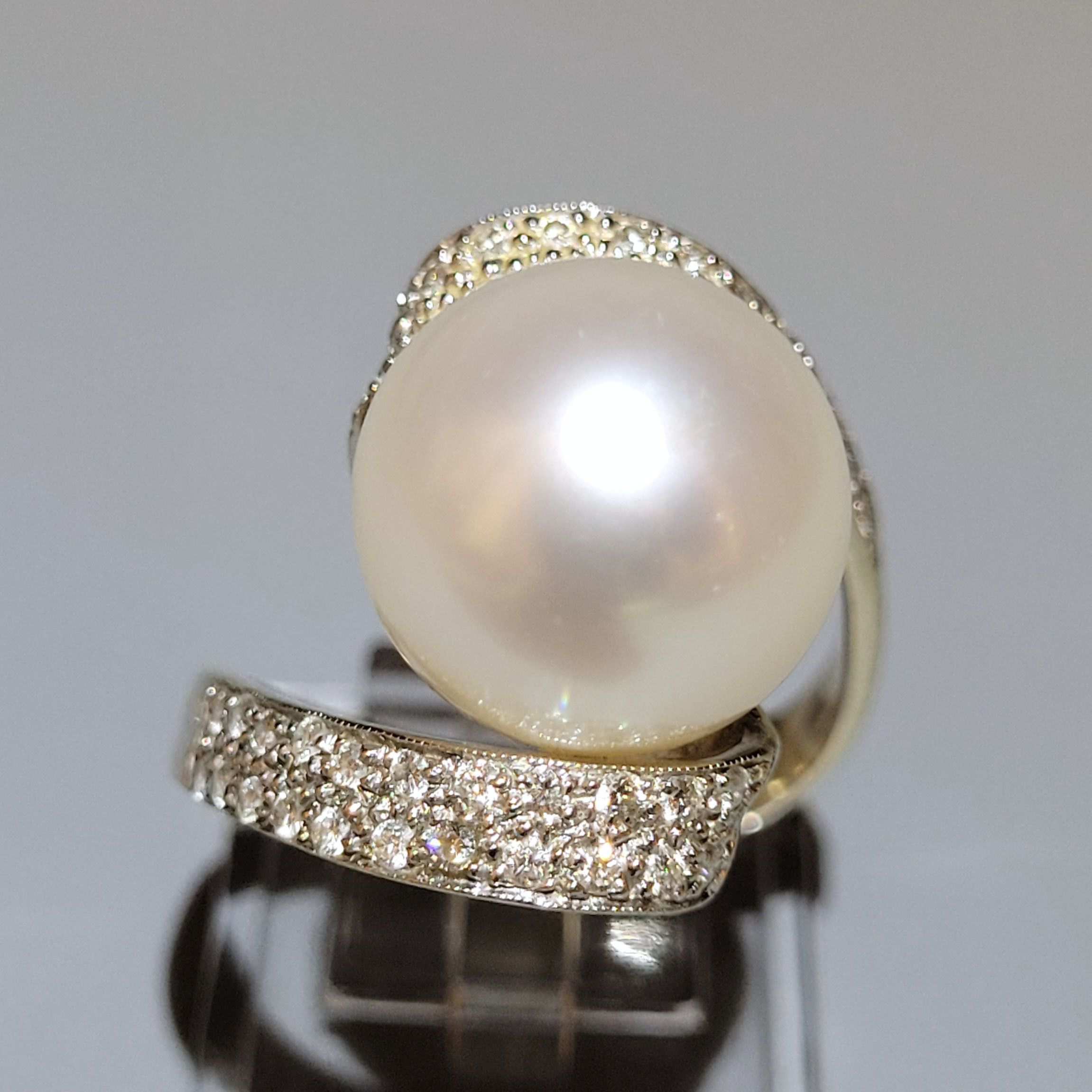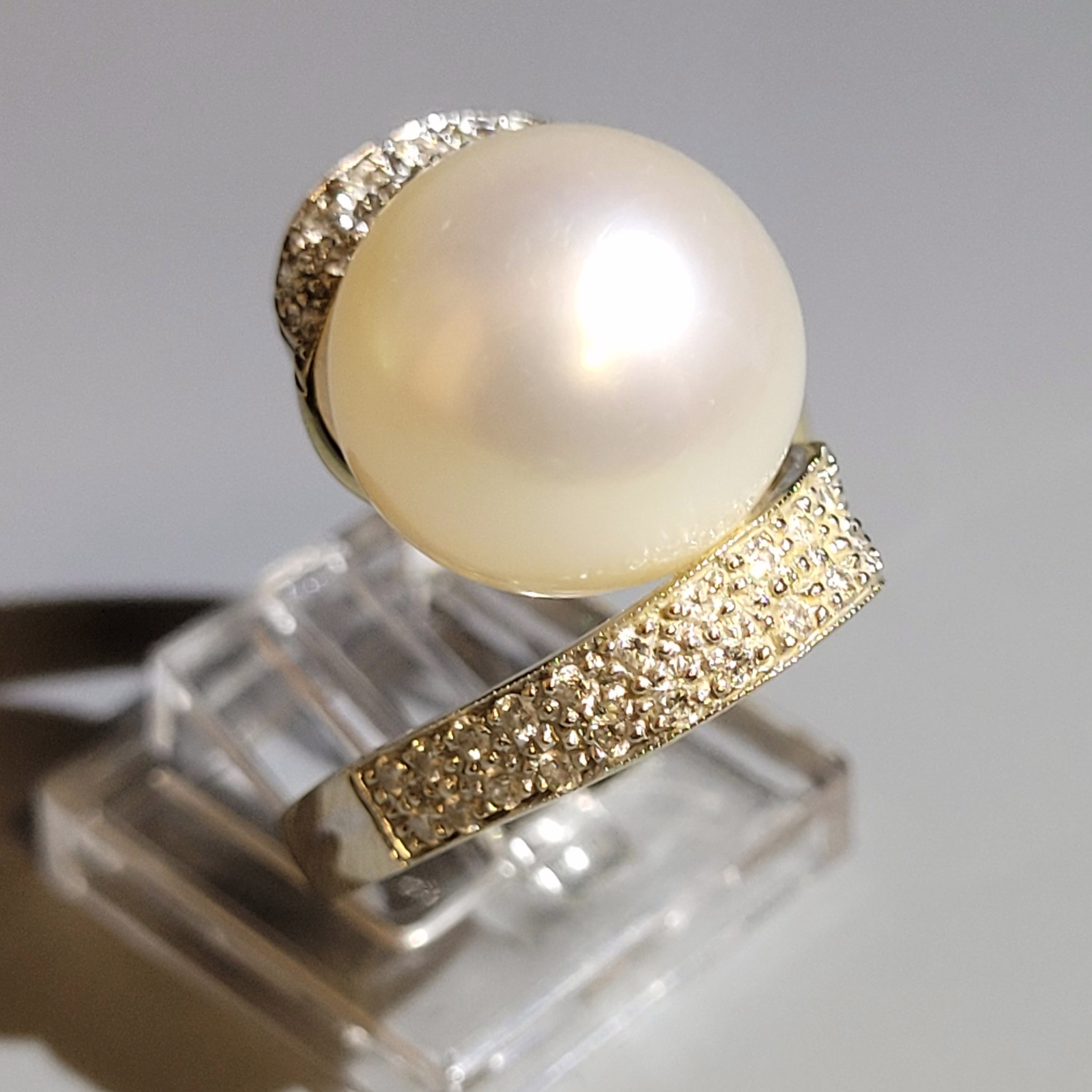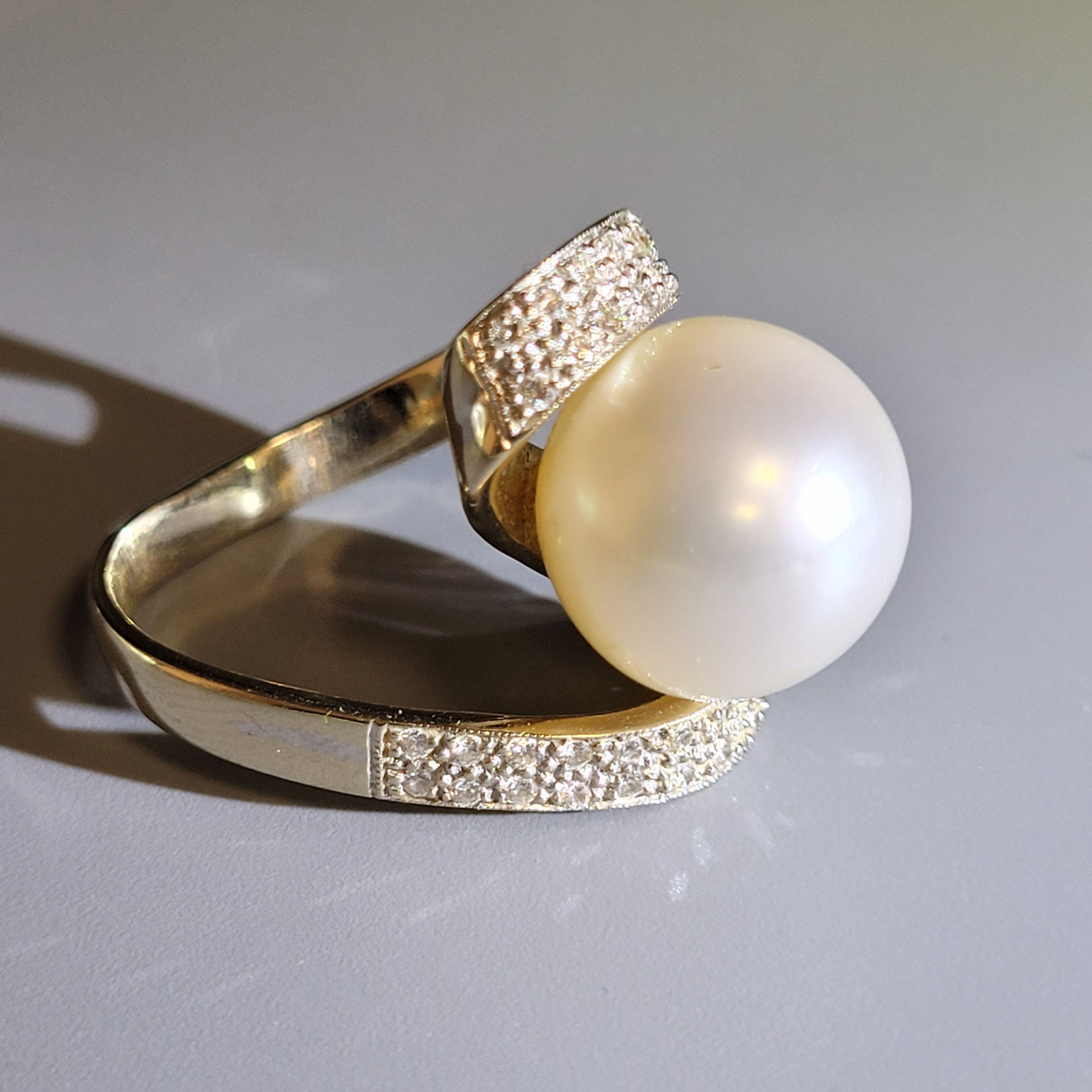 750er Gelbgold, Perle, Schiene besetzt mit 44 Brillanten (zusammen ca. 0,47 ct), Ringgröße 60,5, Gewicht ca. 11,5g
