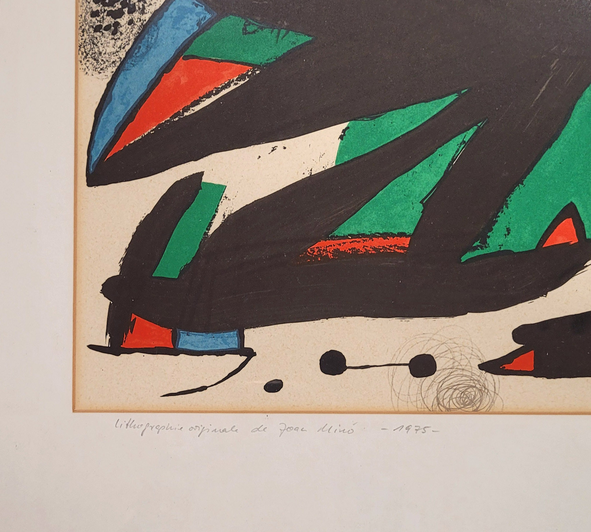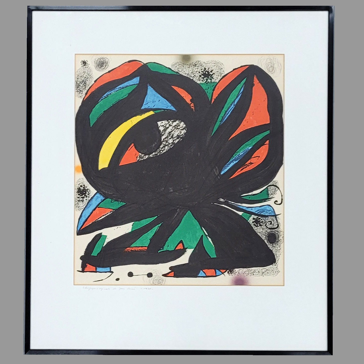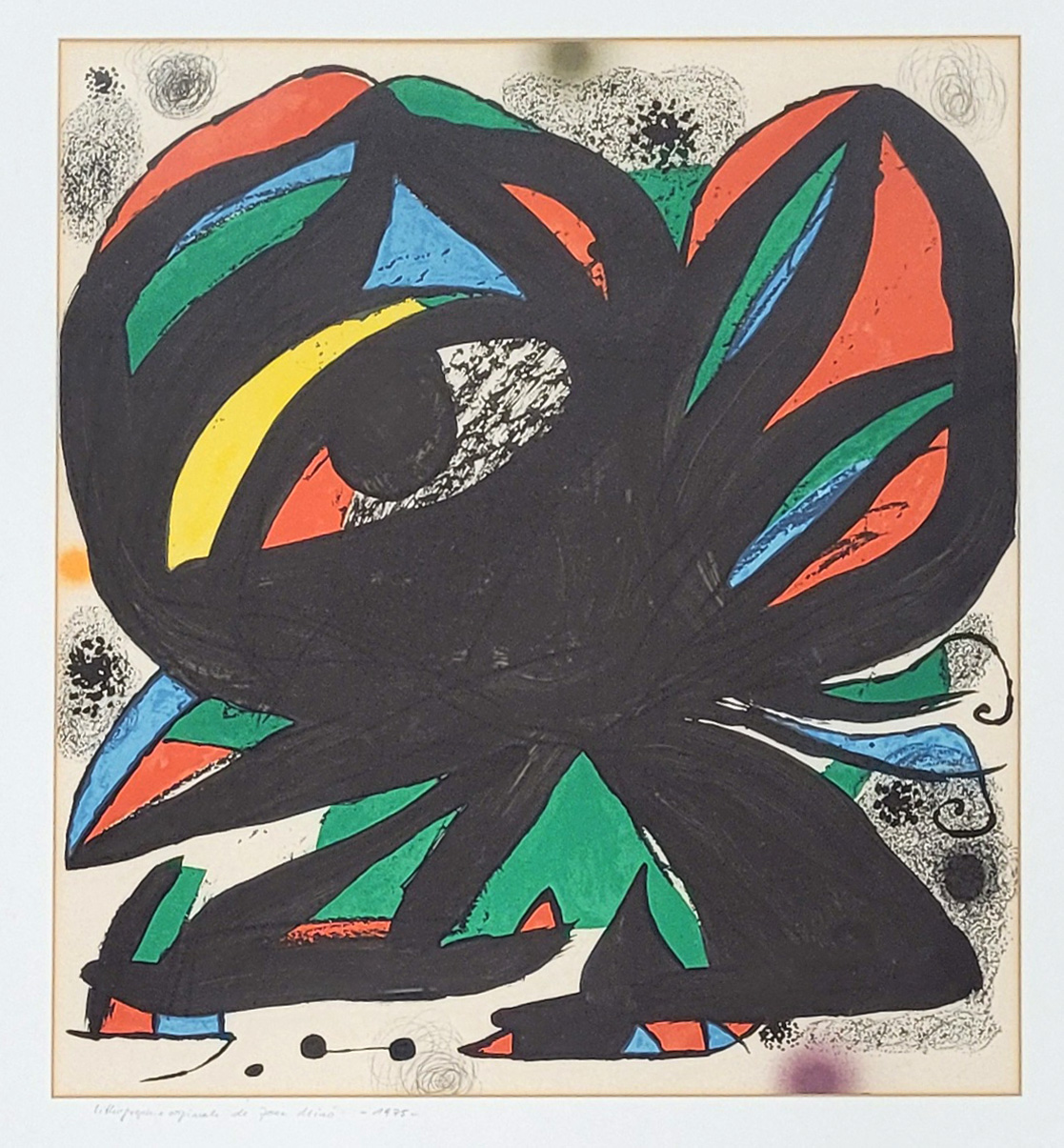 MIRÓ, Joan (1893-1983): Ausstellungsplakat „Fundació Joan Miró“Farblithographie, 1975, 53,5 x 48,5 cm (Passepartoutausschnitt), gerahmt unter Glas und Passepartout**) Bei einem Zuschlag über 400€ werden 2% für VG Bild gemäß §26 UrHG erhoben