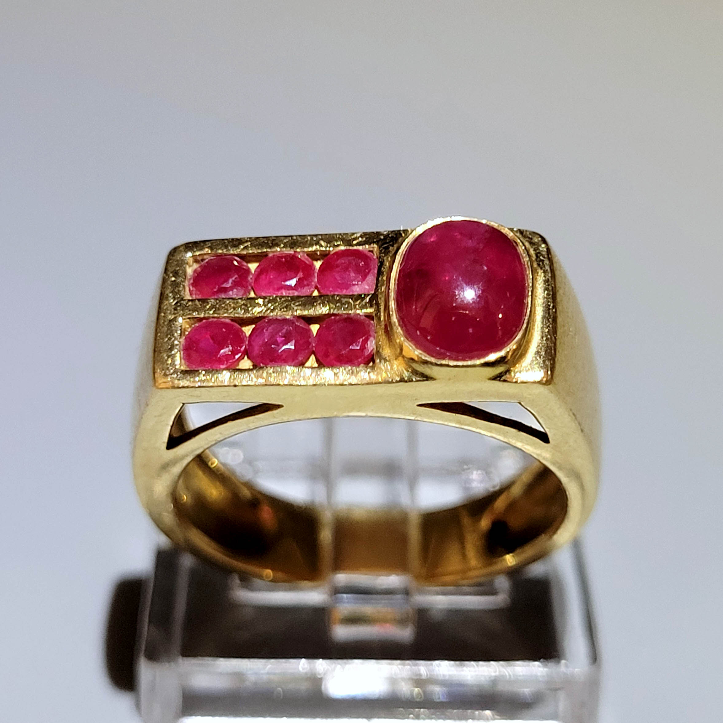 750er Gelbgold, rote Farbsteine (1 Cabochon, 6 kleine), Ringgröße 53, Gewicht ca. 6,5g