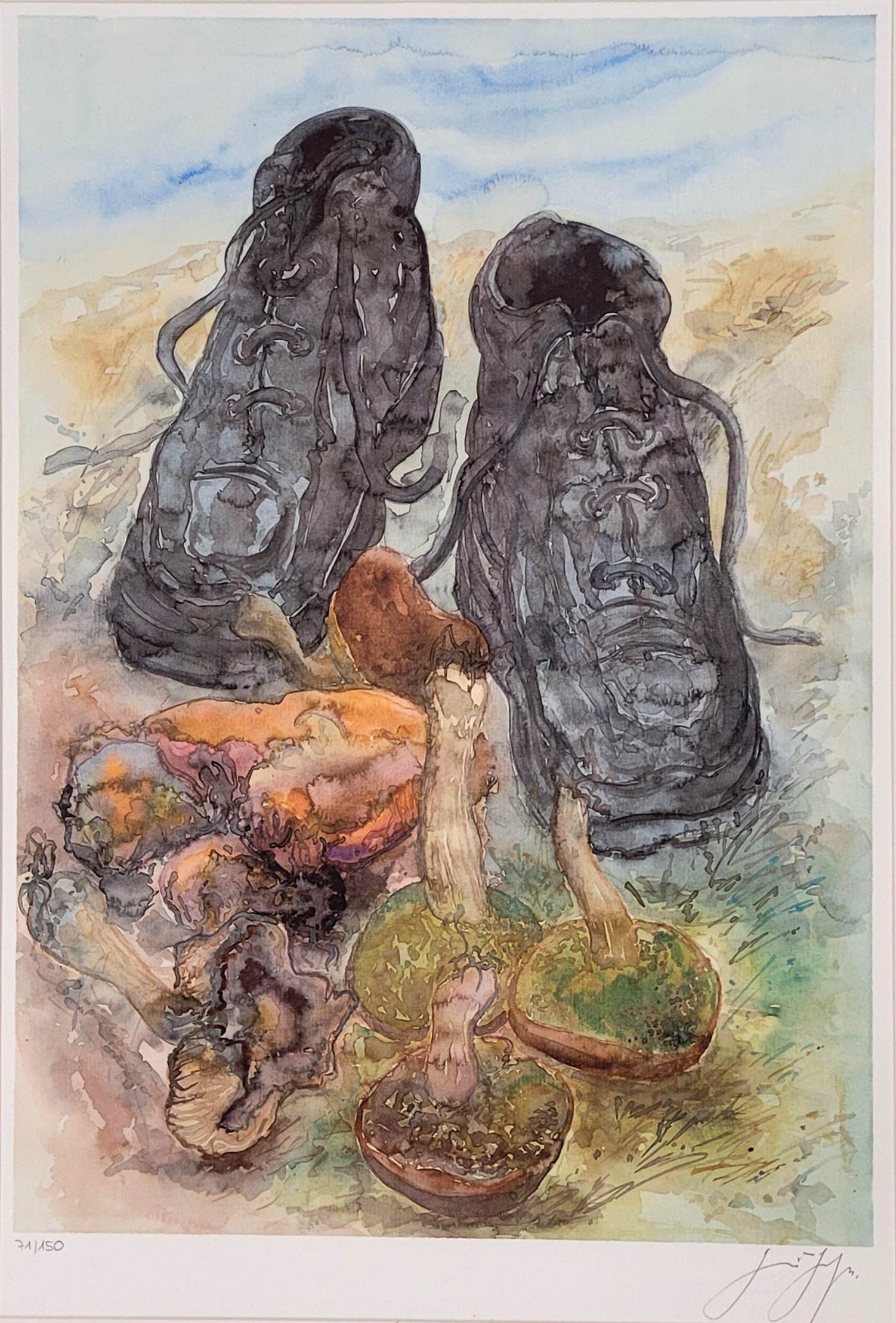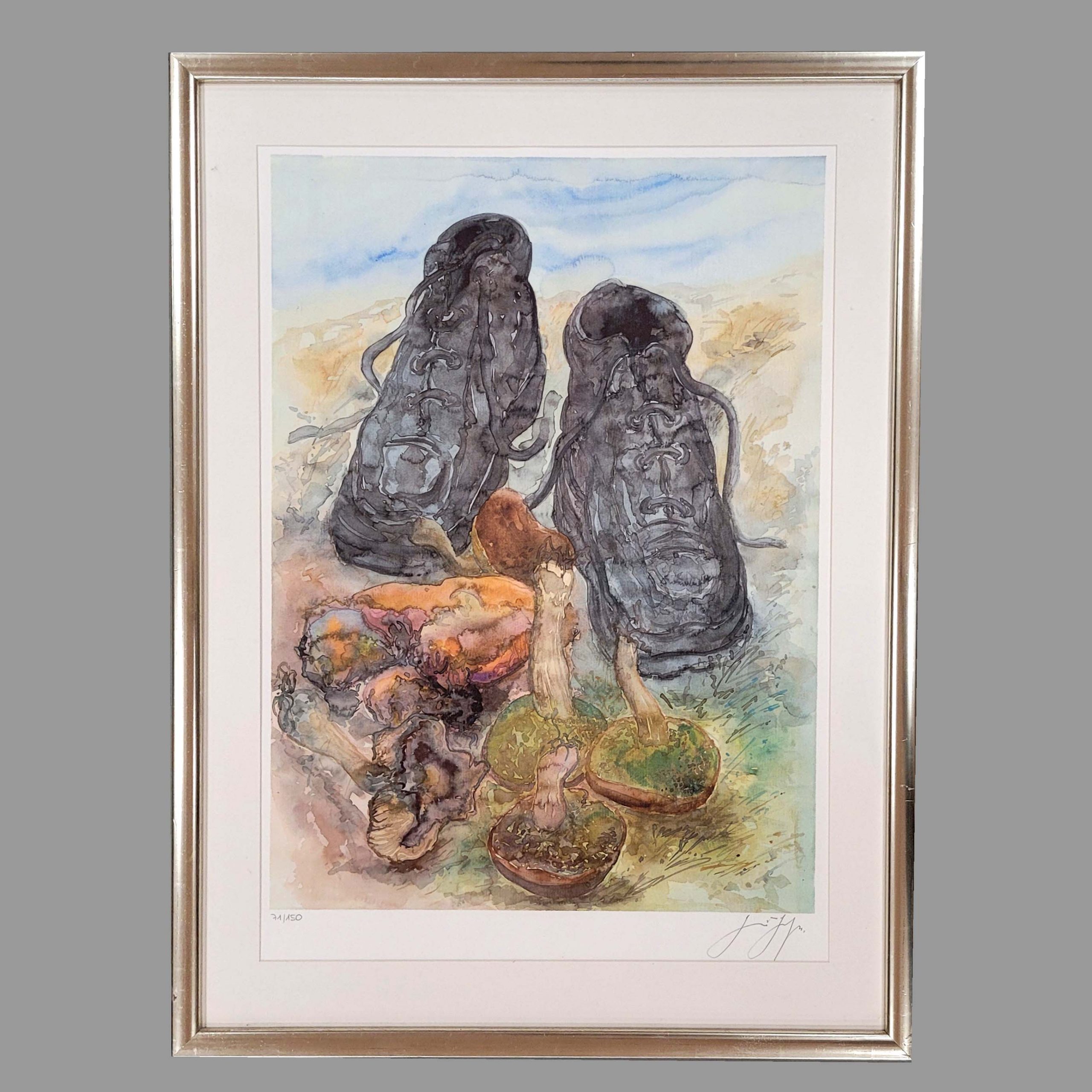 GRASS, Günter (1927-2015): Pilze und SchuheFarbsiebdruck, 2002, signiert unten rechts, nummeriert 71/150 unten links, 75 x 51 cm, gerahmt unter Plexiglas**) Bei einem Zuschlag über 400€ werden 2% für VG Bild gemäß §26 UrHG erhoben