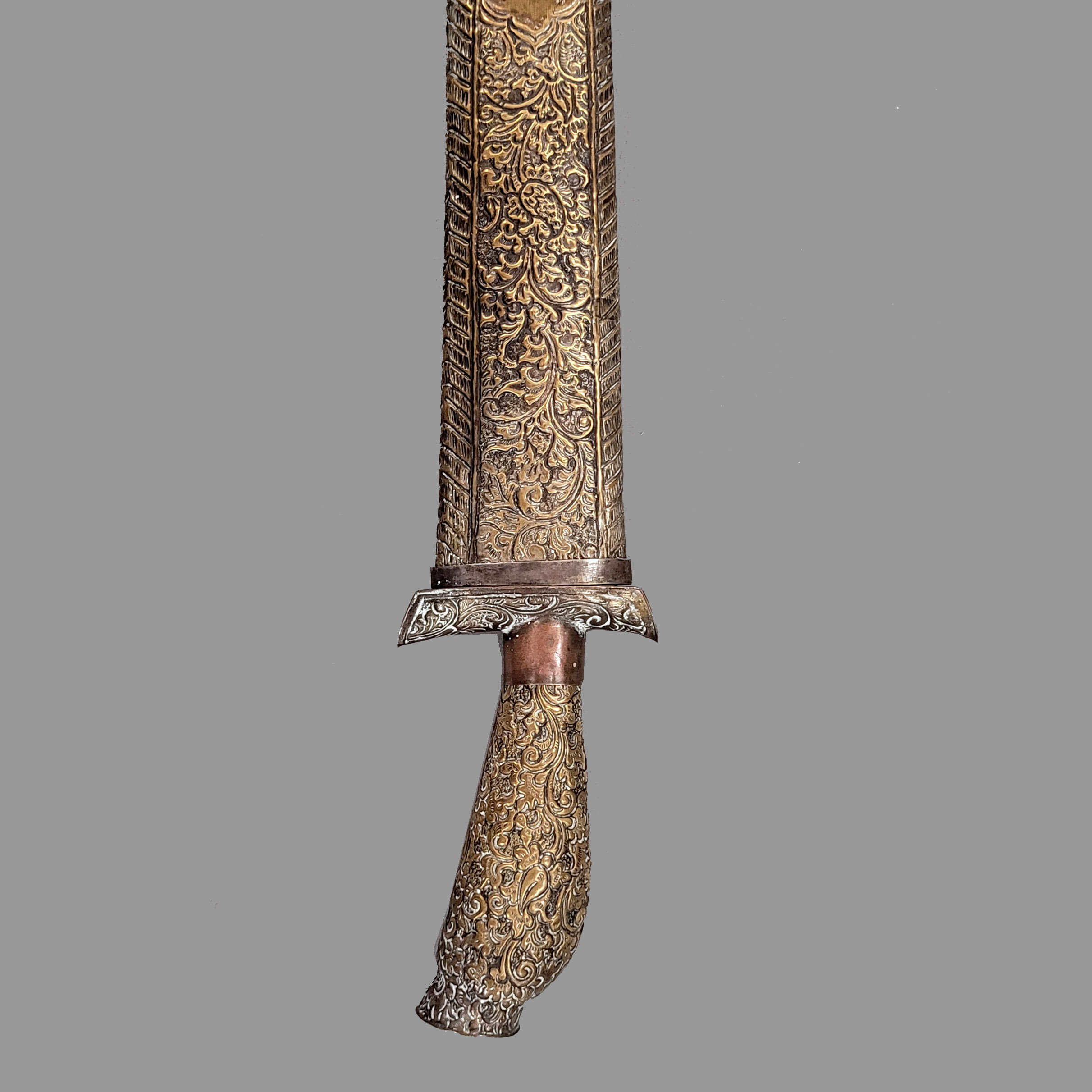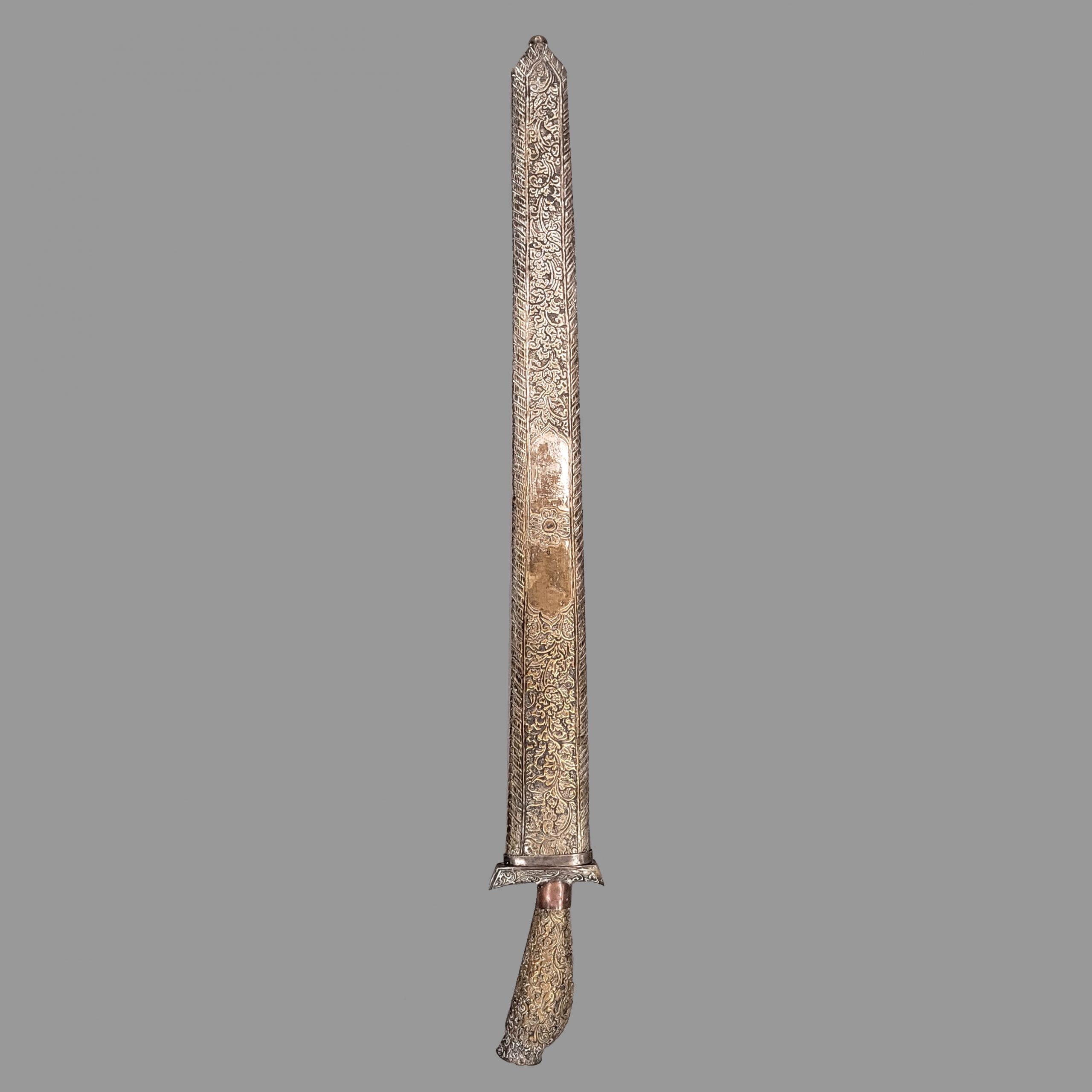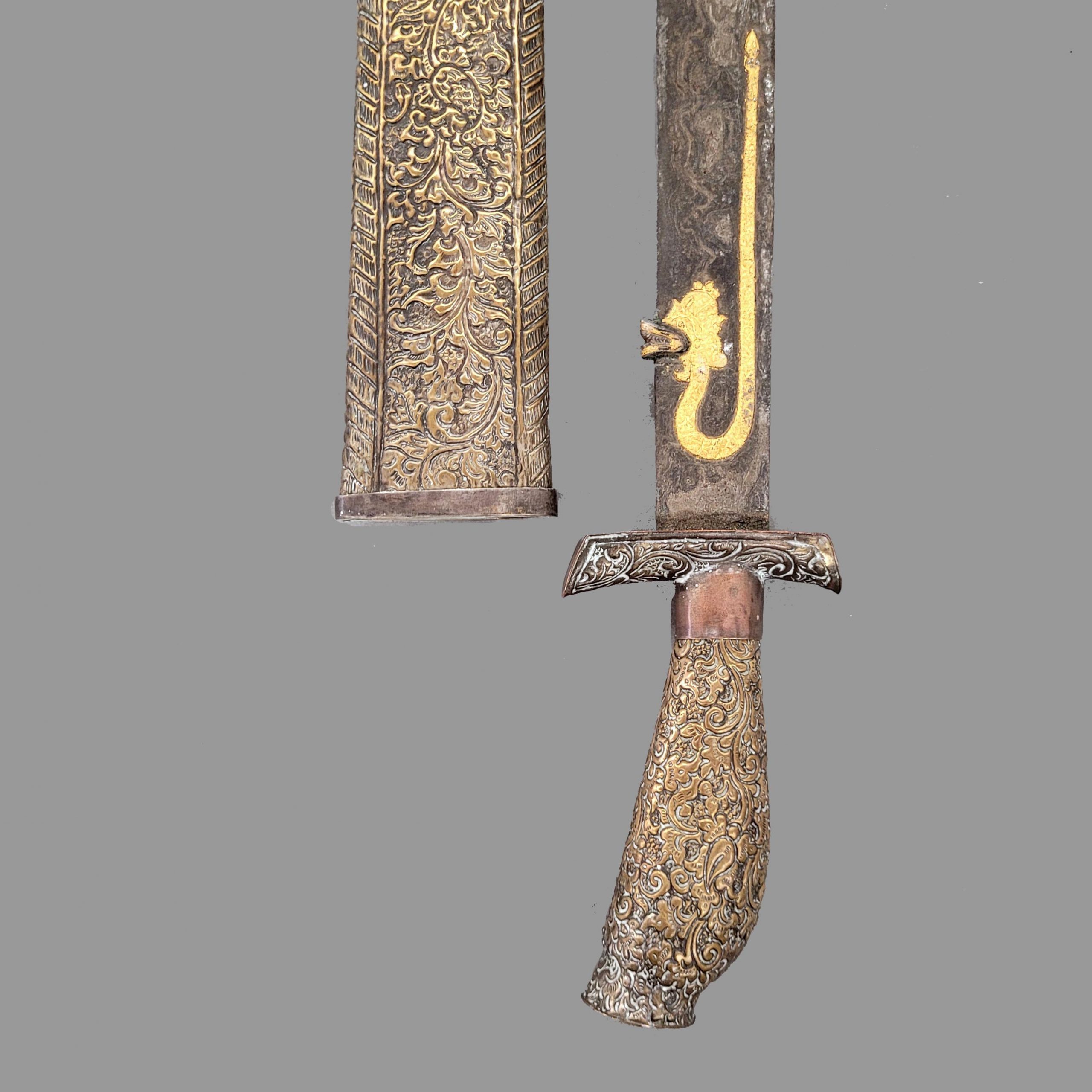 Schwert (Pedang Lurus)Klinge Gussdamast, Länge 48 cm, partiell goldtauschiert, Griff und Parierstange Kupfer, versilbert, Scheide Holz, versilbertes Kupferblech, Indonesien, Java 19. Jahrhundert, Gesamtlänge 64 cm