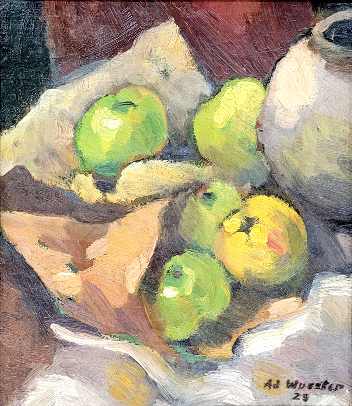 WUESTER, Adolf (1888-1972): FrüchtestillebenÖl auf Leinwand, auf Malkarton gezogen, signiert unten rechts, datiert (19)23, 33,5 x 29 cm, Rahmen