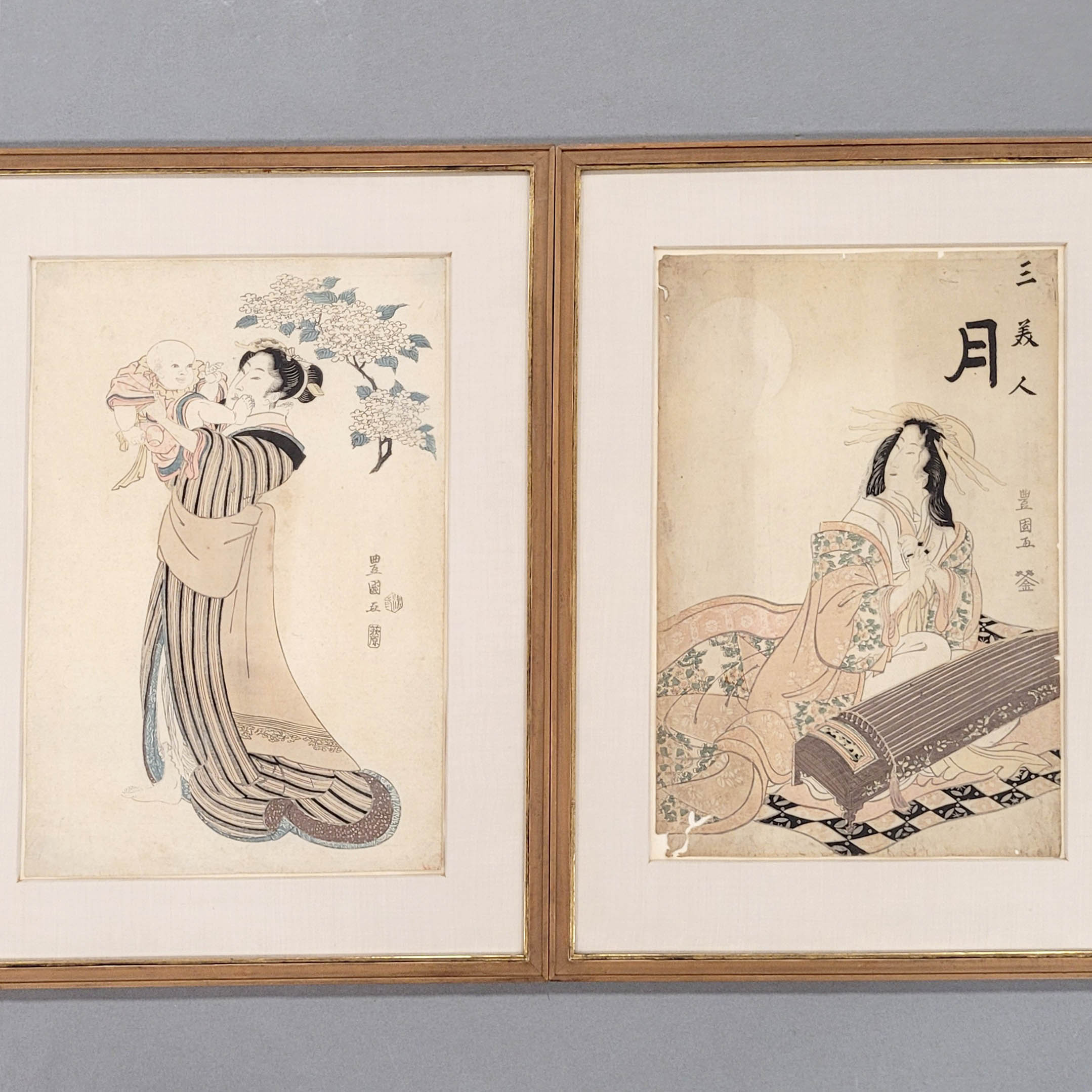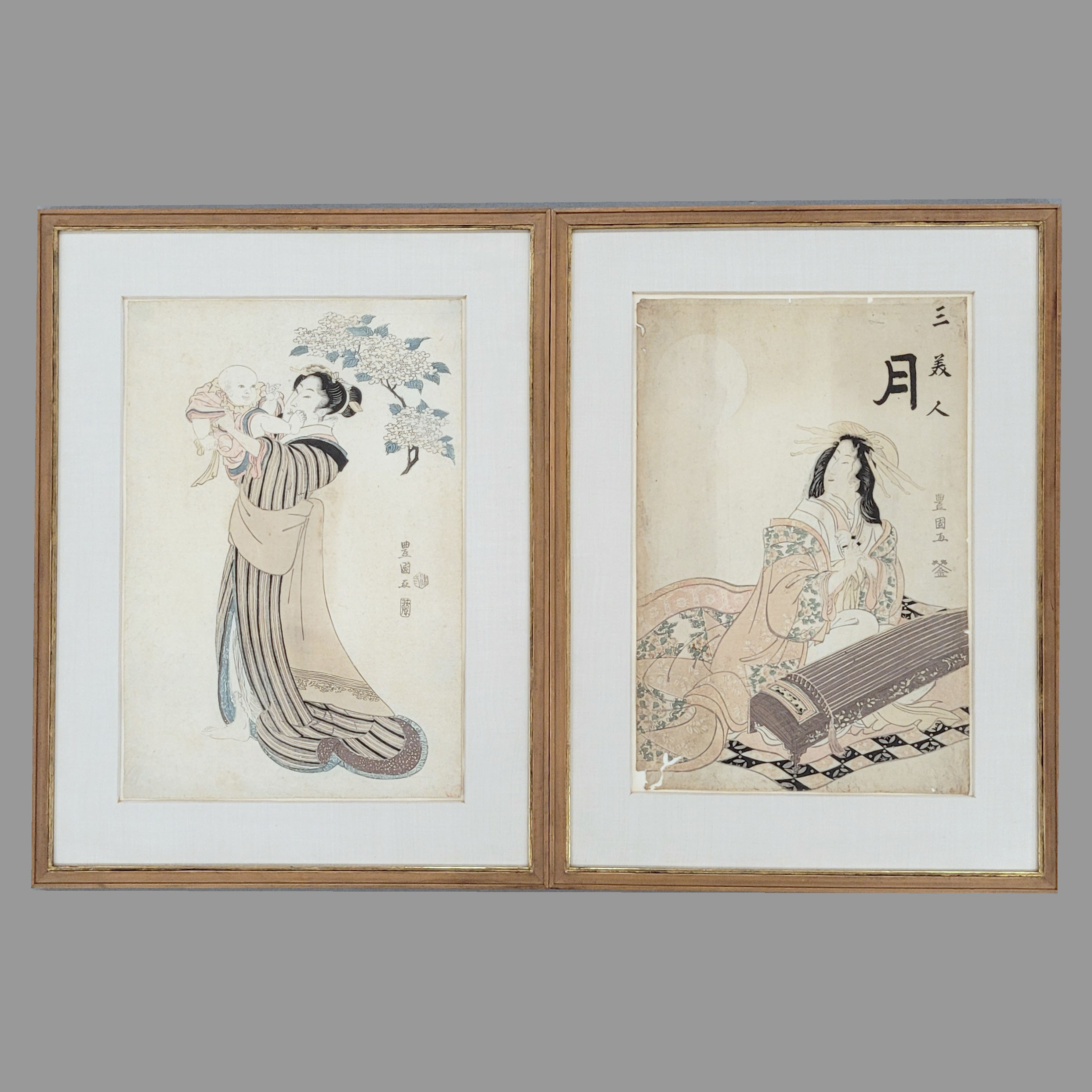 UTAGAWA, Toyokuni (1769-1825): Mutter und Kind / Frau spielt Koto2 Farbholzschnitte, 39 x 26 cm bzw. 37,5 x 25 cm, beide gerahmt unter Glas und Passepartout (linke Ecke des Holzschnittes der Frau mit Koto mit Fehlstellen)