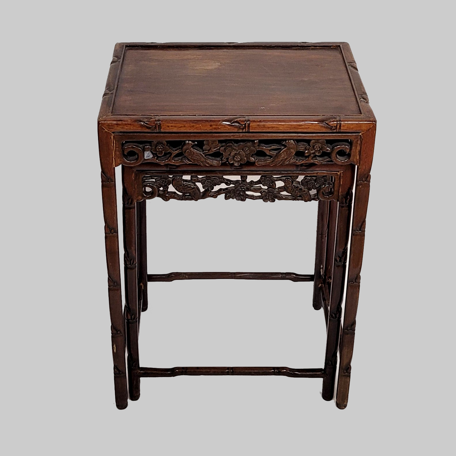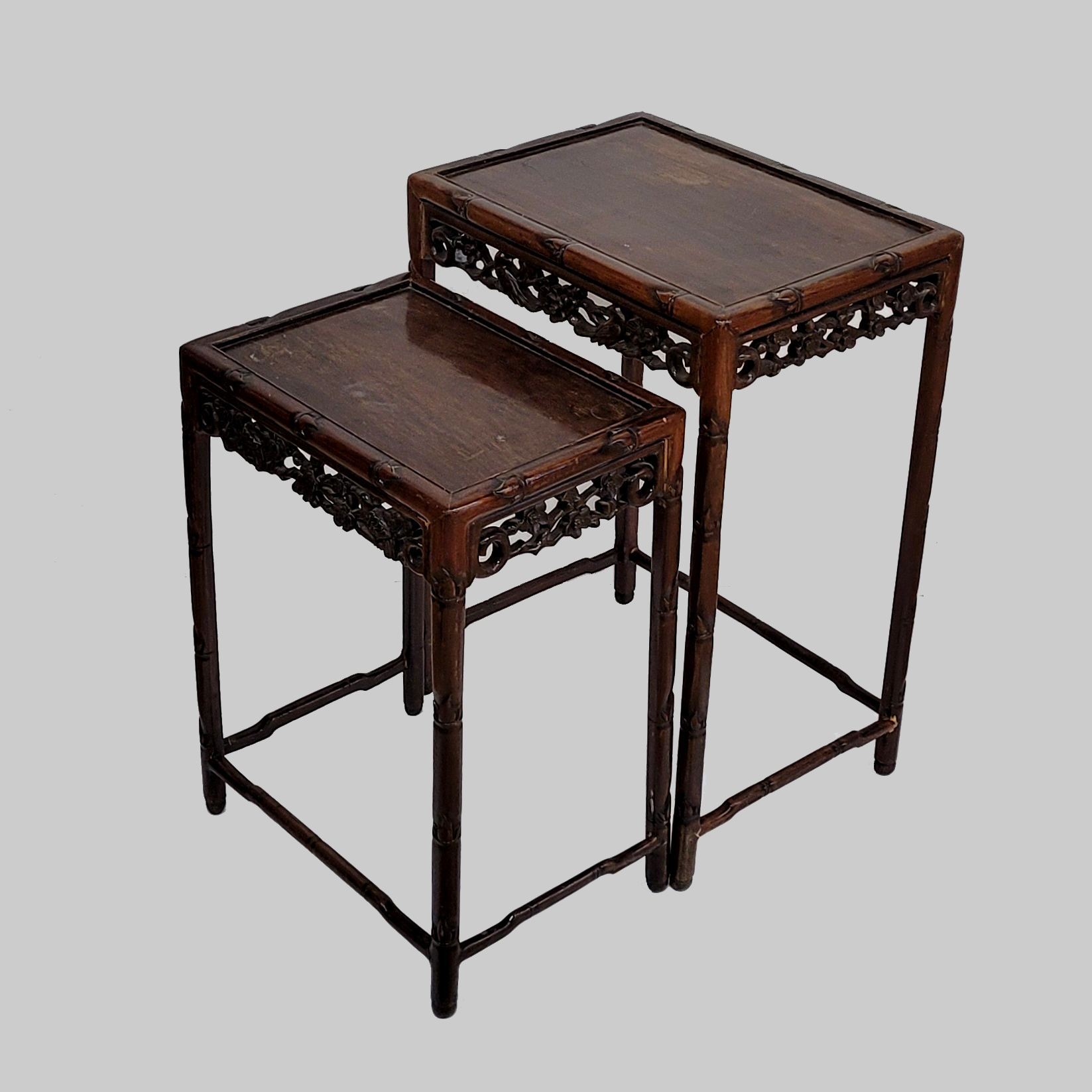Zwei Beistelltische Edelholz, geschnitzte Zarge, China, um 1920, bis zu 71 x 50 x 37 cm (Platte mit Politurschäden)