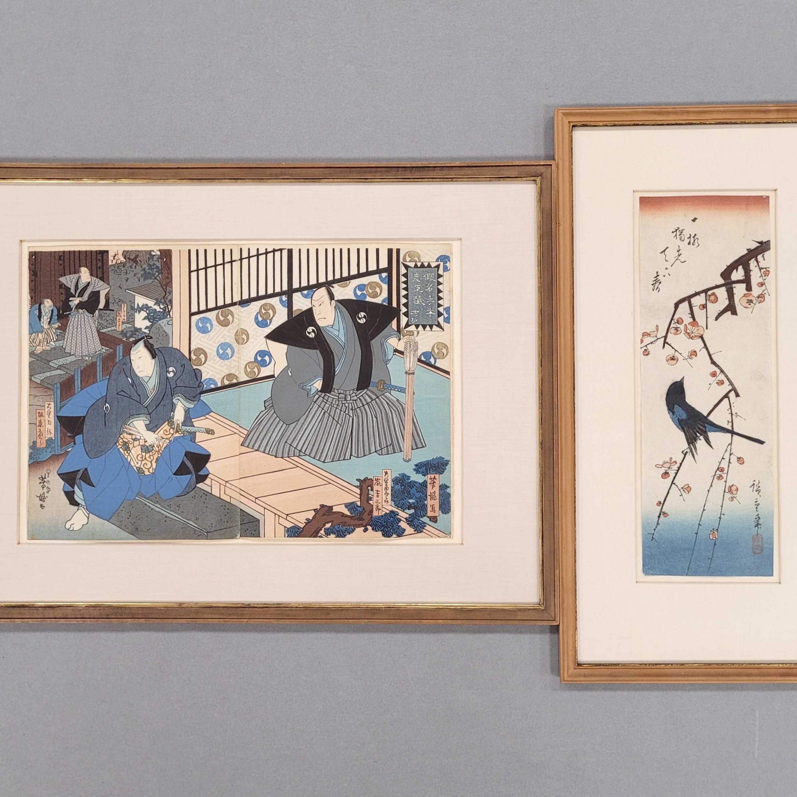 Farbholzschnitt, 31,5 x 11 cm, gerahmt unter Glas und Passepartout beigelegt ein weiterer japanischer Farbholzschnitt mit 2 Schauspielern, 25 x 36 cm, gerahmt unter Glas und Passepartout
