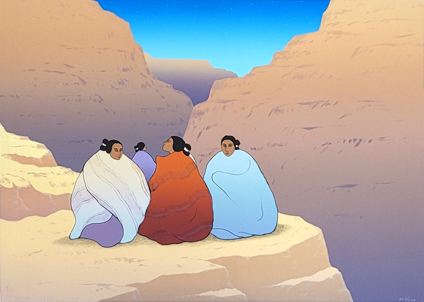 GORMAN, Rudolph Carl (1932-2005): Sitzende IndianerinnenFarblithographie, signiert und datiert 1985 unten links, 75 x 105 cm, gerahmt unter Glas und Passepartout