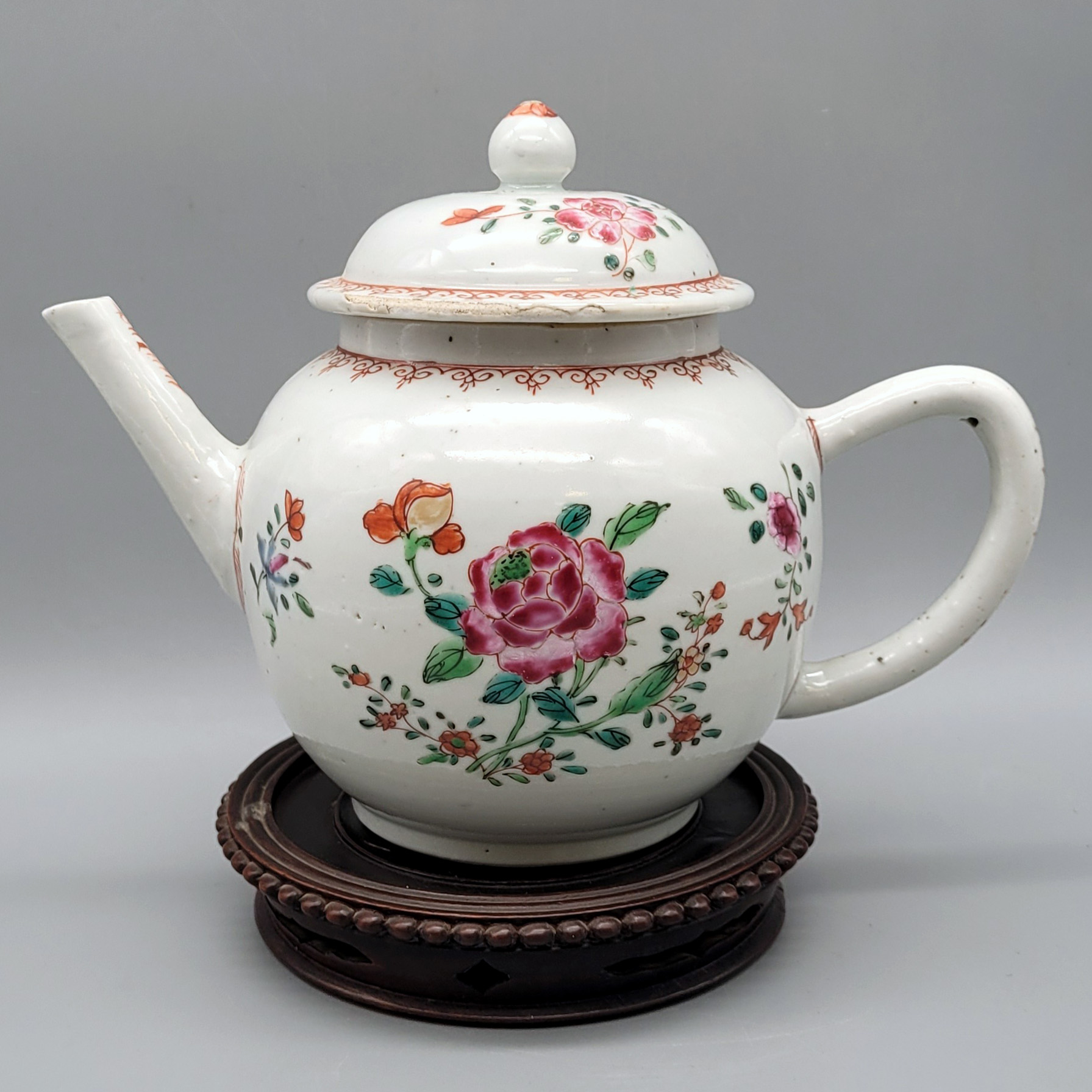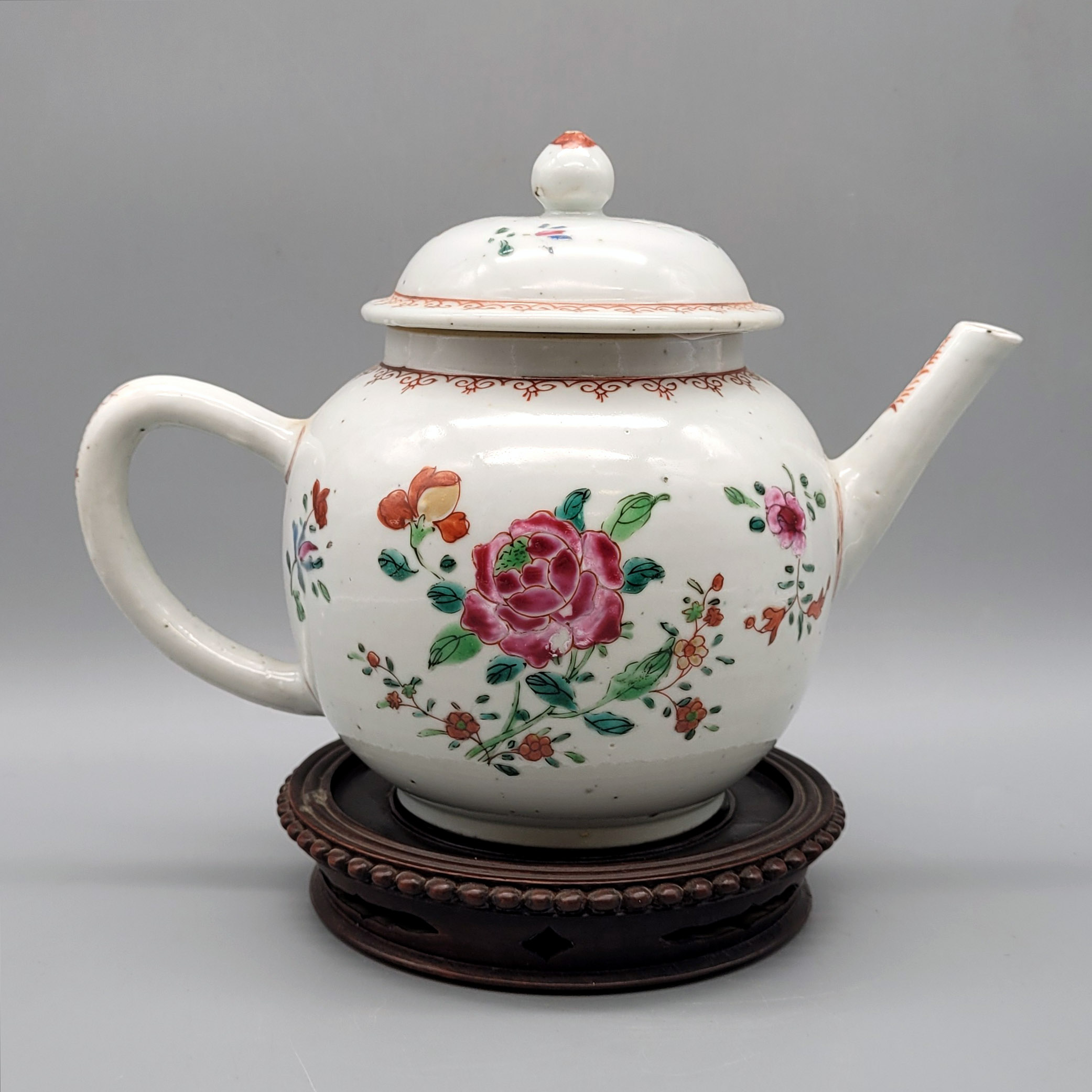 Porzellan, Blumenmalerei, China 18./19. Jahrhundert (Exportware), Höhe ohne Holzaufsteller 15 cm (Deckel mit Glasurabplatzern)