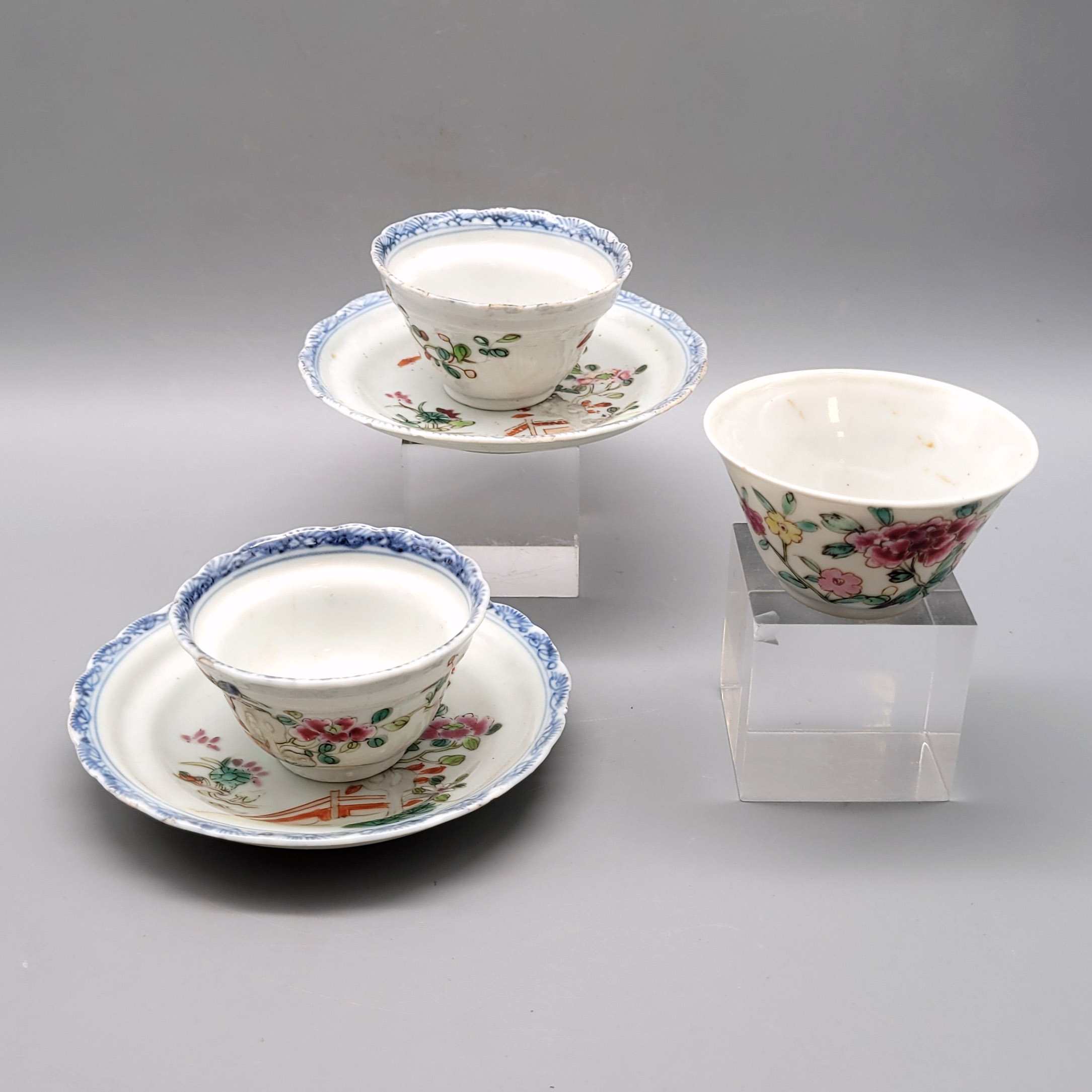 Porzellan, Blumen- und Vogelmalerei, China 18./19. Jahrhundert, Höhe einzelnes Schälchen ca. 4 cm, Durchmesser der Untersetzer 12 cm (Randchips an Untersetzern und den beiden zugehörigen Schälchen)