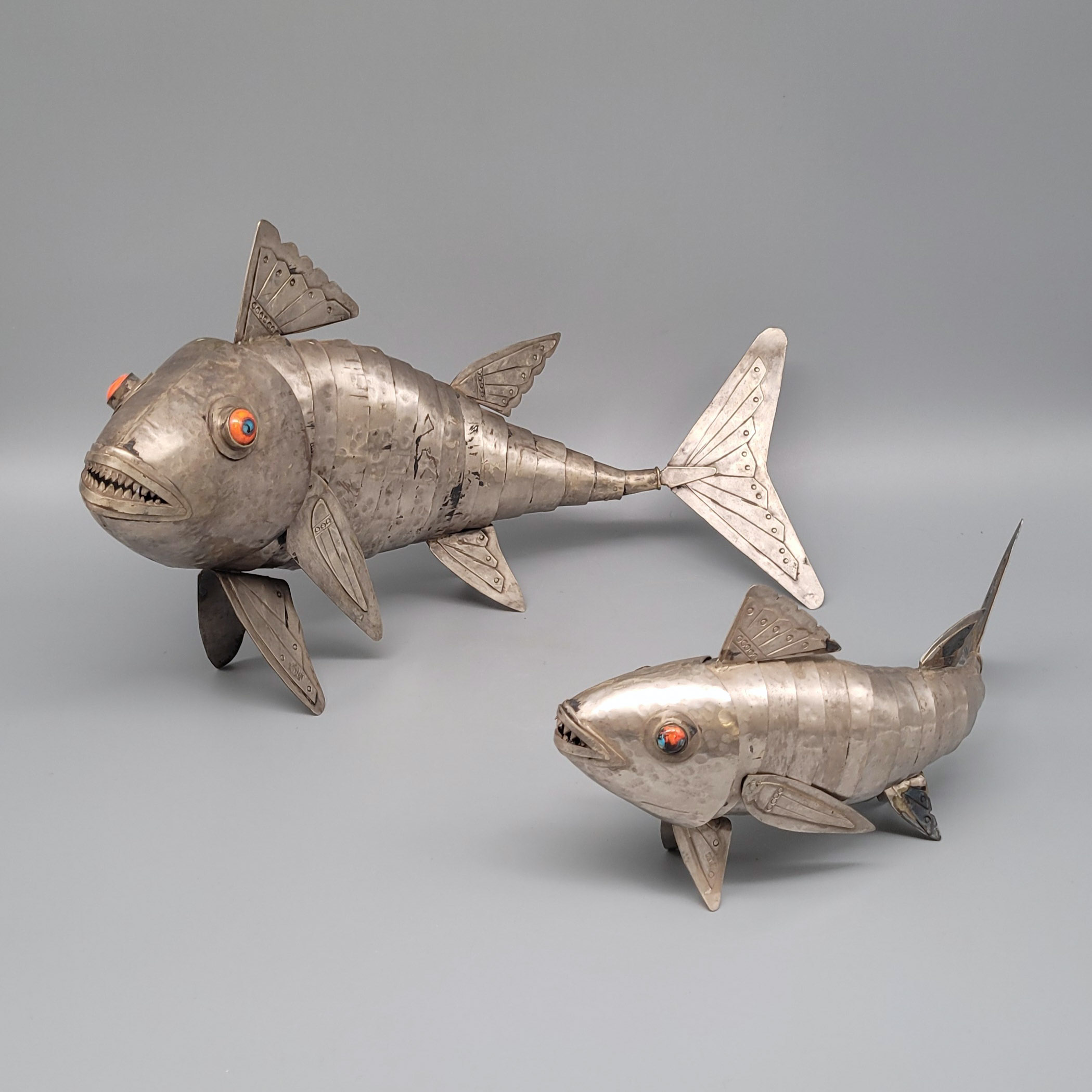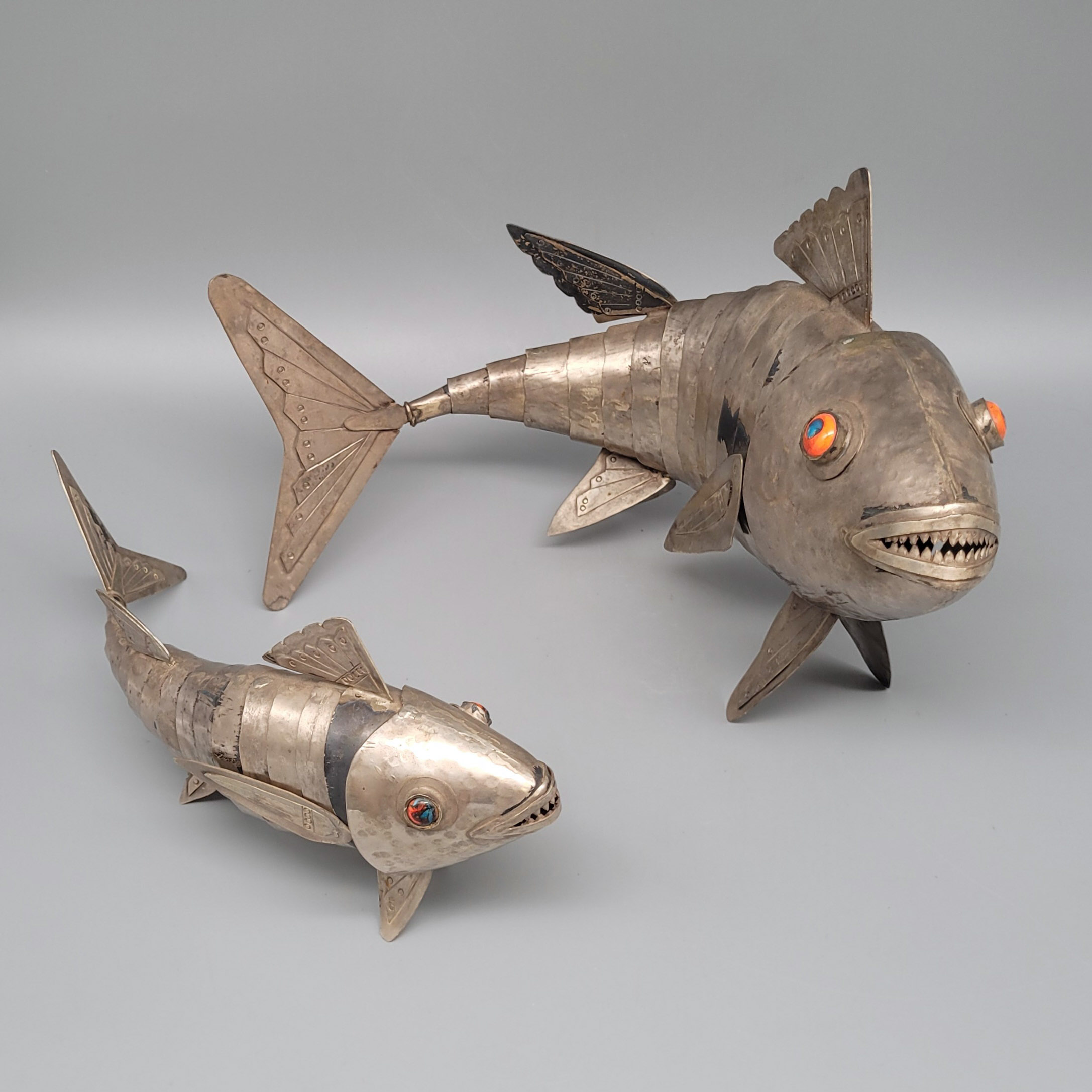 Zwei Fische925er Silber, Augen in Stein eingelegt, bewegliche Glieder, unleserliche Meistermarke, Länge 26 cm bzw. 37 cm, Gewicht 631g