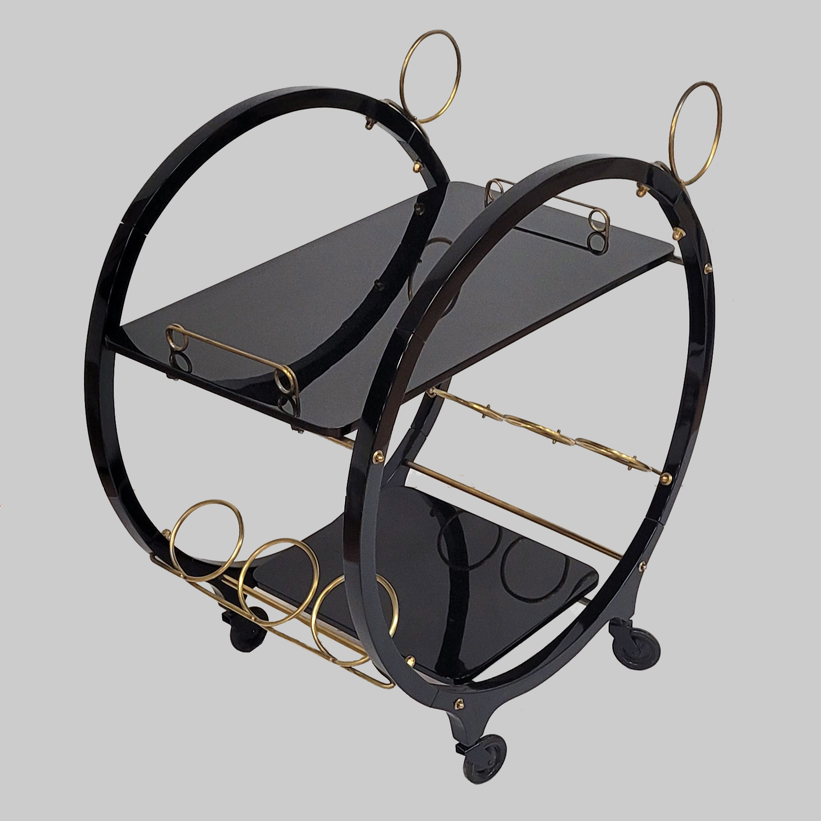 Art-Déco BarwagenHolz, schwarzer Hochglanzlack, gummierte Metallrollen, originale Griffe und Flaschenhalter aus Messing, abnehmbares Tablett, Frankreich, um 1935, 72 x 59 x 42 cm