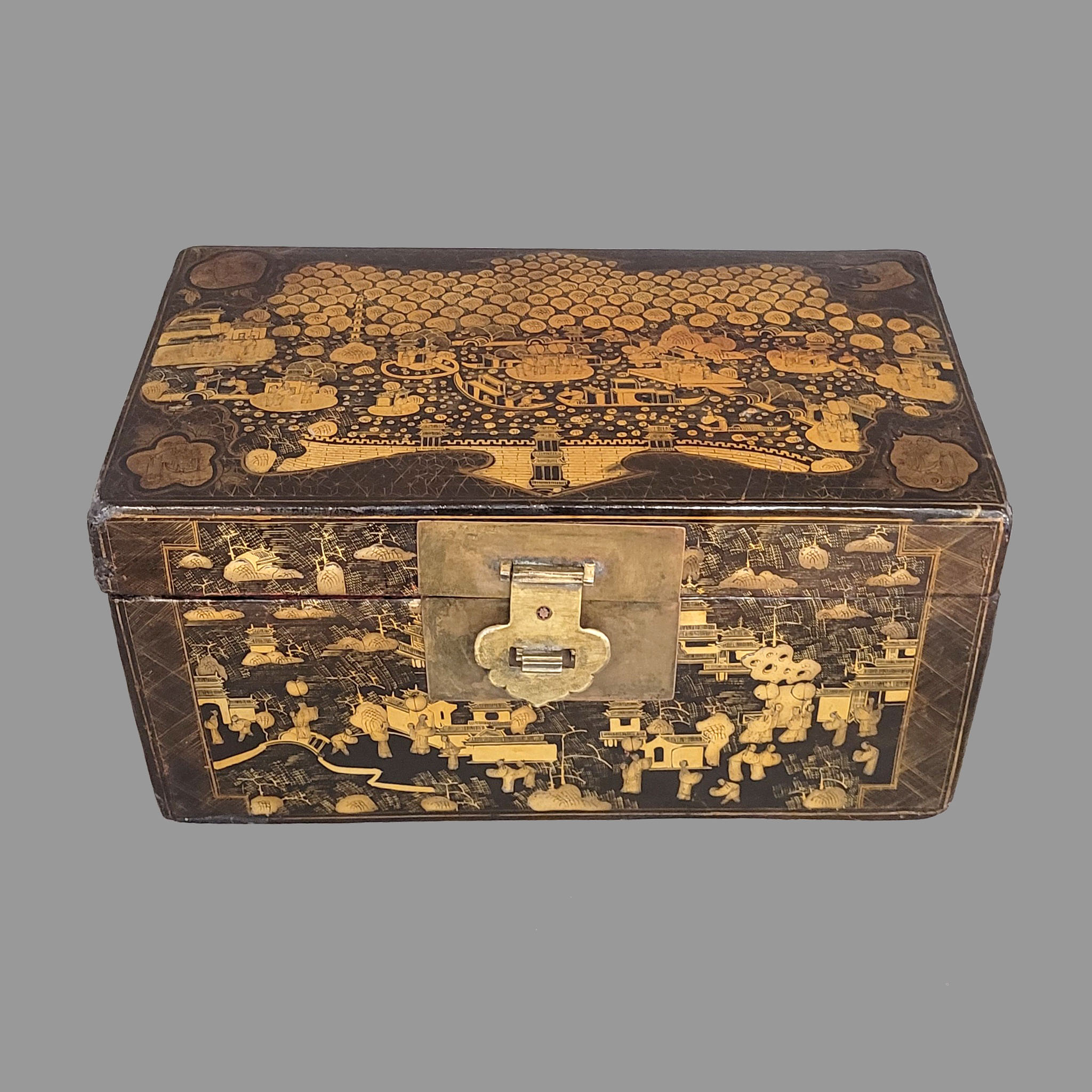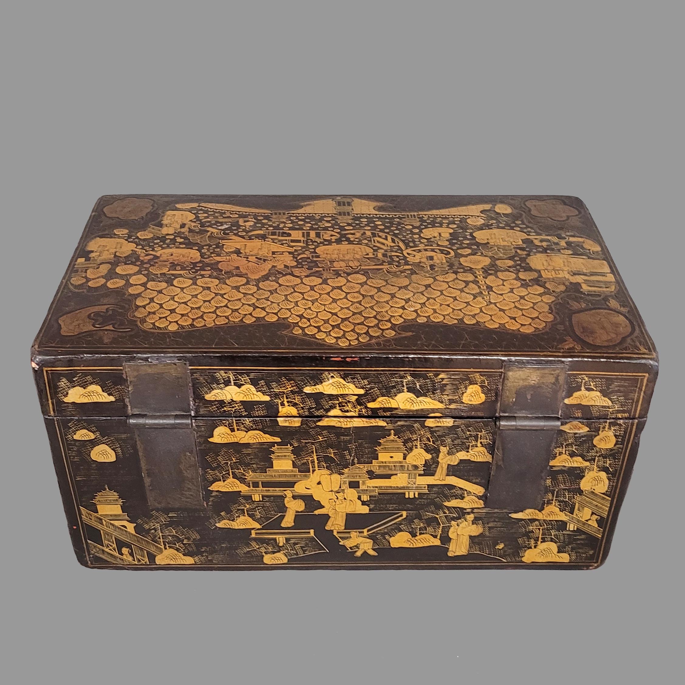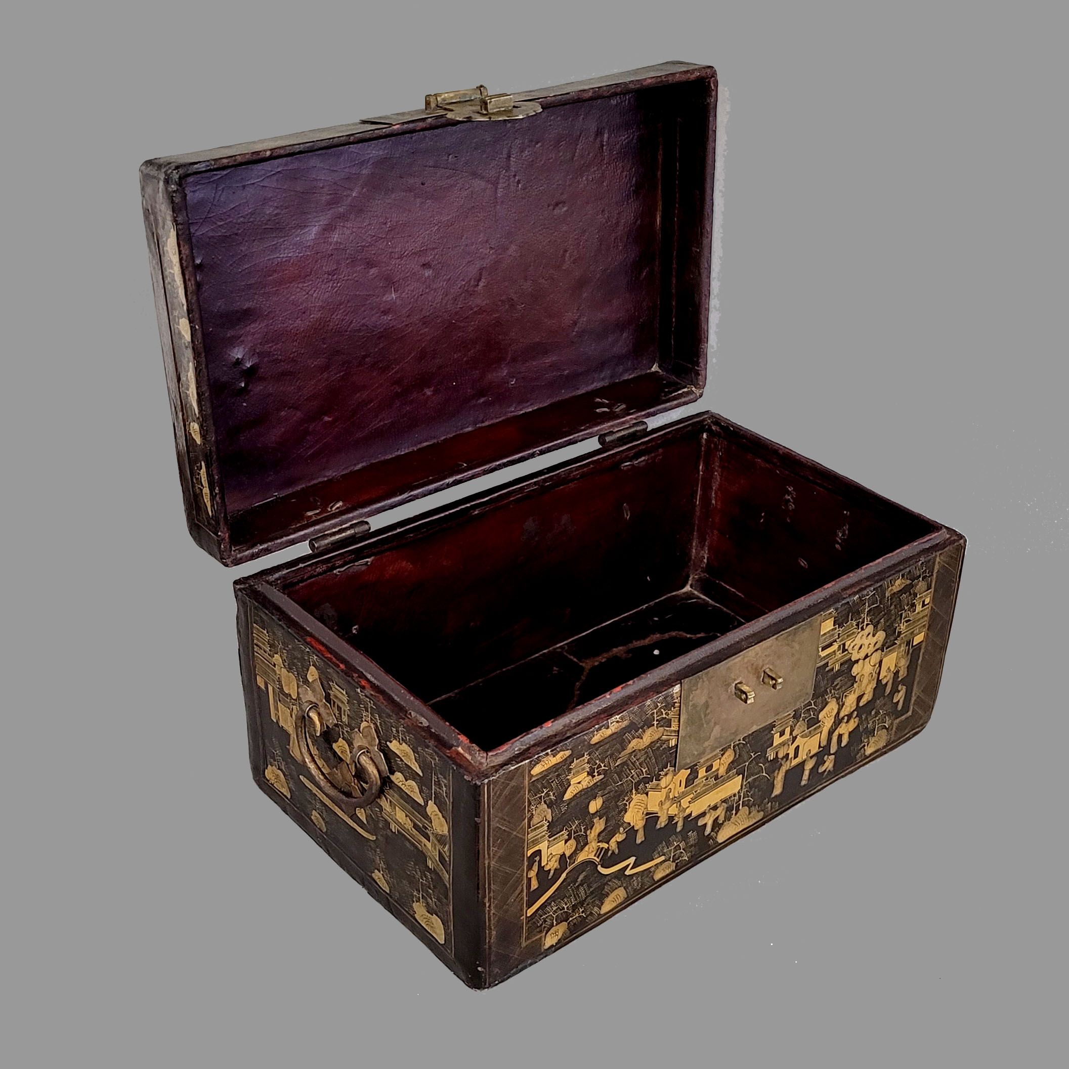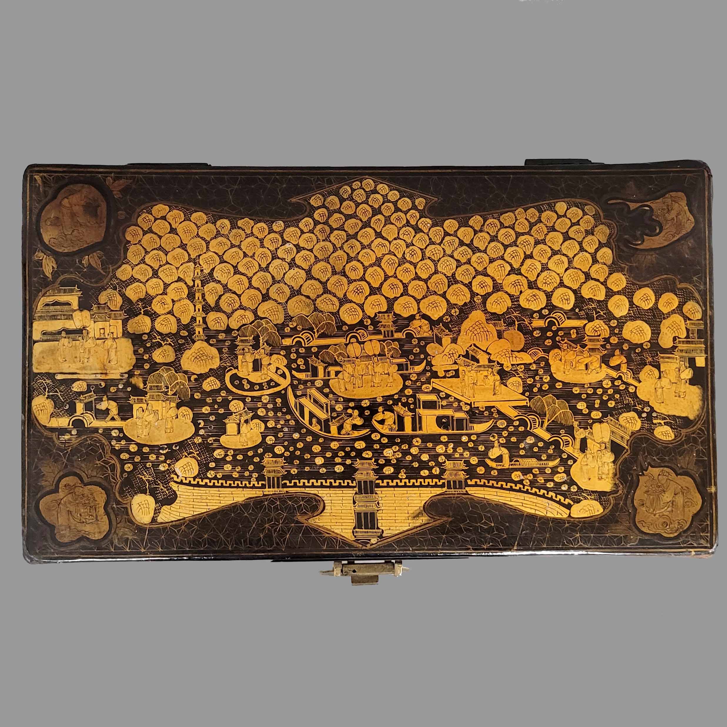 Deckelkasten Holz, innen mit Leder ausgeschlagen, Messinggriffe und Verschluss, Eisenscharniere, Schwarz- und Goldlack, Palastszenen, China, Kanton, 19. Jahrhundert, 22,5 x 45 x 25 cm